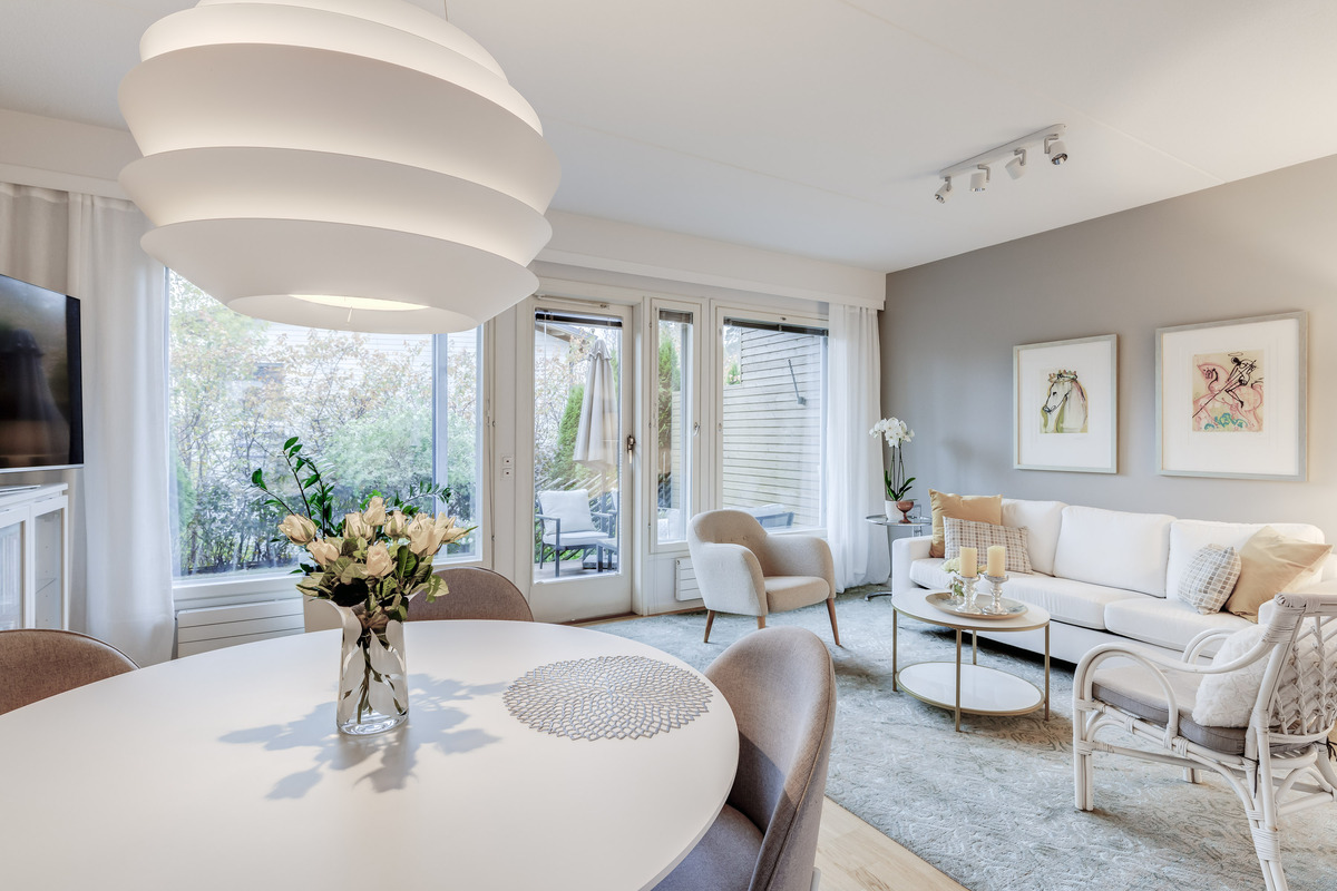 Avara ja valoisa kaksikerroksinen rivitalokolmio luonnon ja palvelujen lähellä! Arjesta nauttiminen on mahdollista tässä avarapohjaisessa ja hyväkuntoisessa asunnossa, josta avautuvat kauniit ja rauhoittavat näkymät omalle pihalle ja ympäristöön. Alakerran suuri-ikkunainen ja tilava olohuone luo puitteet mukavalle oleilulle sekä tarjoaa kauniit näkymät suojaiselle pihalle. Pihaterassille mahtuu sekä sohvaryhmä että ruokapöytä. Keittiöstä avautuvat näkymät kahteen suuntaan. Alakerrasta…