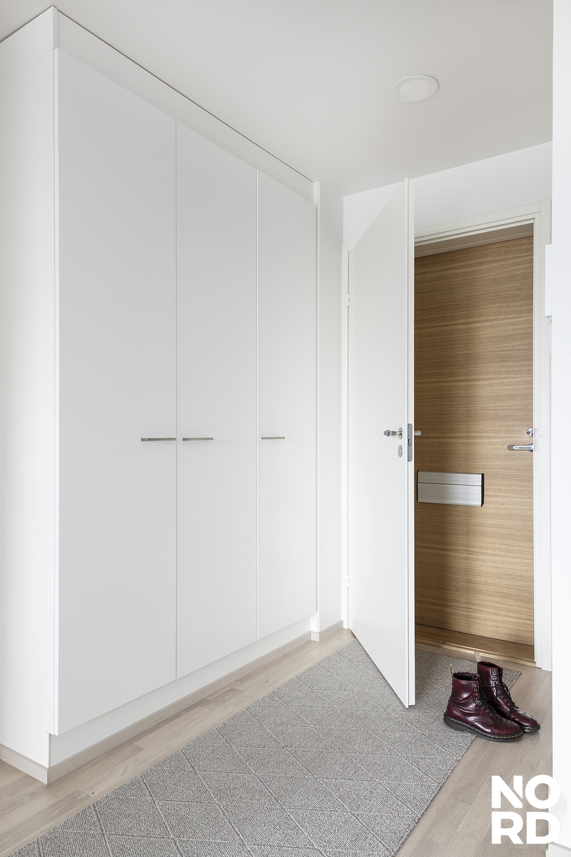 Tilojen kuvaus | Eteisessä on käytännölliset kaapistot, joka tarjoaa runsaasti säilytystilaa. Lattiamateriaalina toimii parketti, ja seinät ovat maalatut. Selkeälinjainen tila toivottaa tervetulleeksi kotiin. |