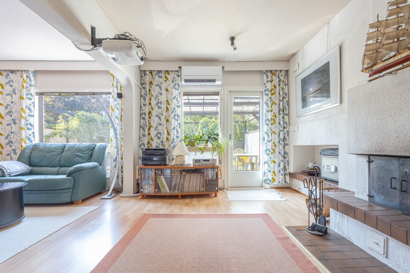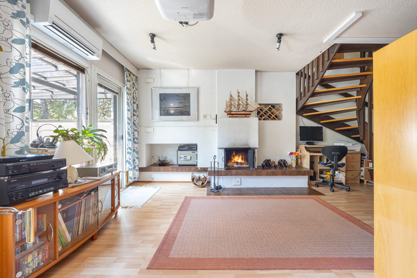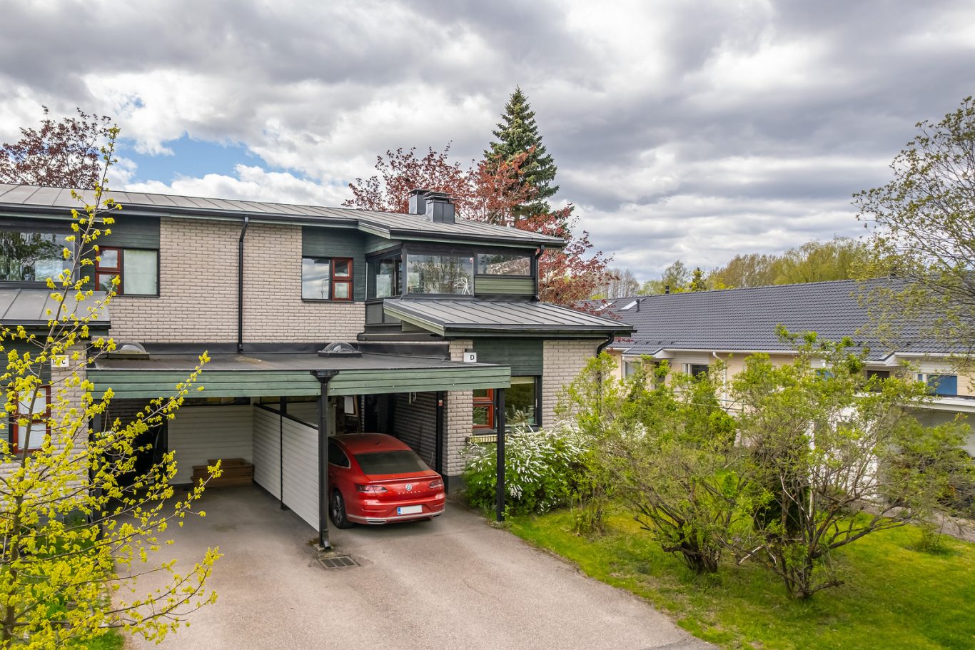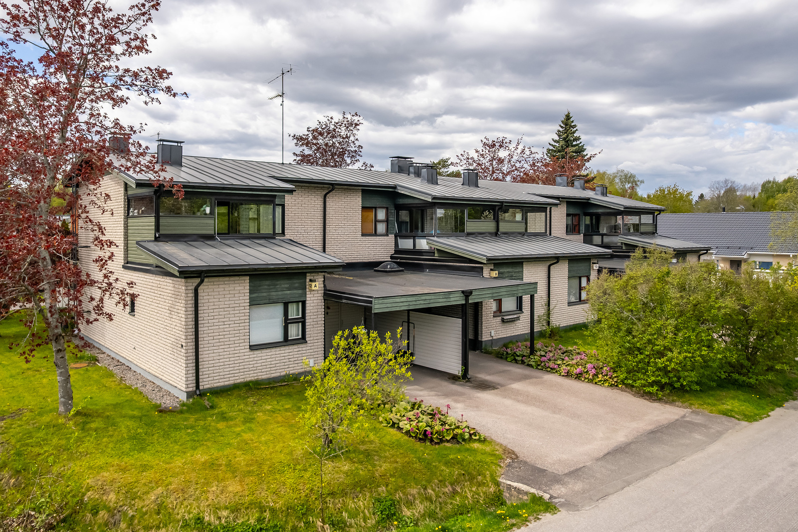 Olohuoneesta on tällä hetkellä erotettu kevyellä väliseinällä ikkunallinen lisähuone, voit valita avaran olohuoneen tai lisähuoneen väliltä elämäntilanteesi mukaan. Olohuoneen yhteydessä on varaava takka luomassa tunnelmaa ja antamassa lämpöä sekä ilmalämpöpumppu lämmitykseen ja viilennykseen. Tilava keittiö ruokailutilalla, alakerran wc. Yläkerrassa on kaksi makuuhuonetta, vaatehuone, 2008 remontoitu kylpyhuone/wc/saunaosasto sekä tilava lasitettu parveke. Suojainen ja kaunis piha-alue, katettu terassi, helppohoitoinen laatoitettu piha. Oma autokatos- ja pihapaikka sekä ulkovarasto on asunnon ulko-oven vieressä.