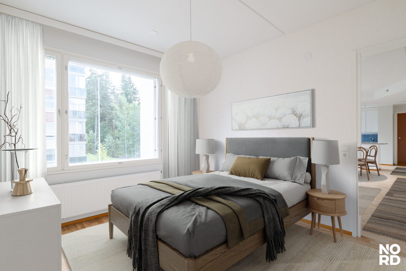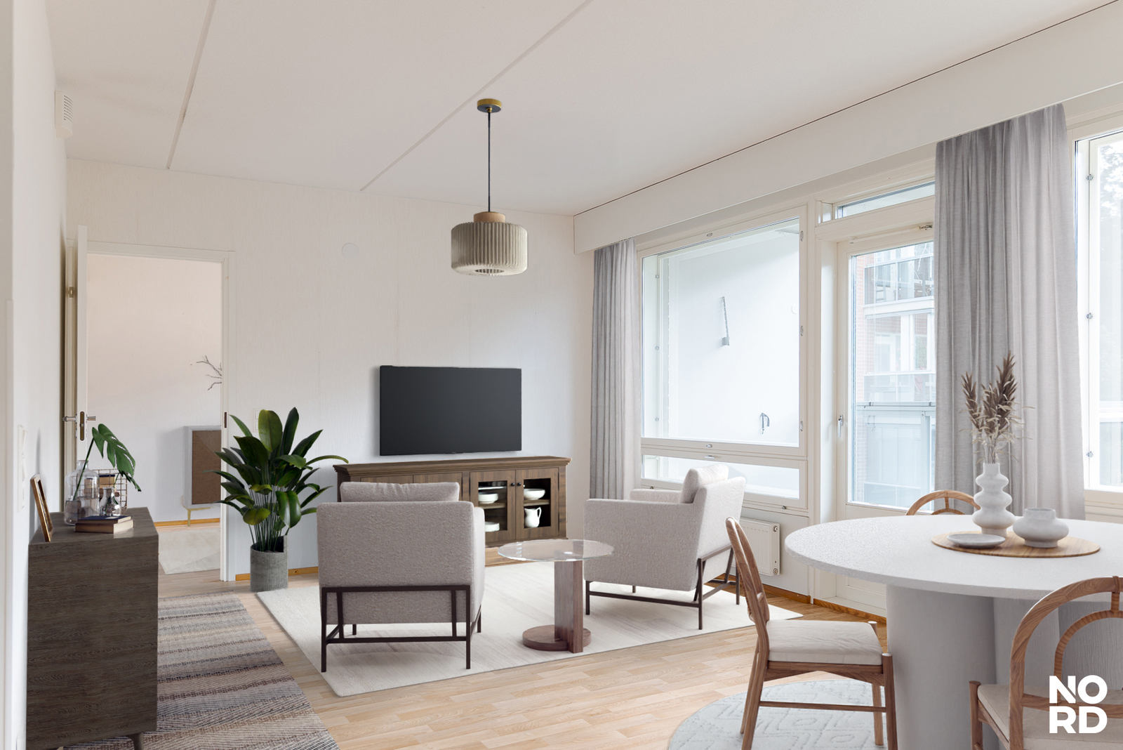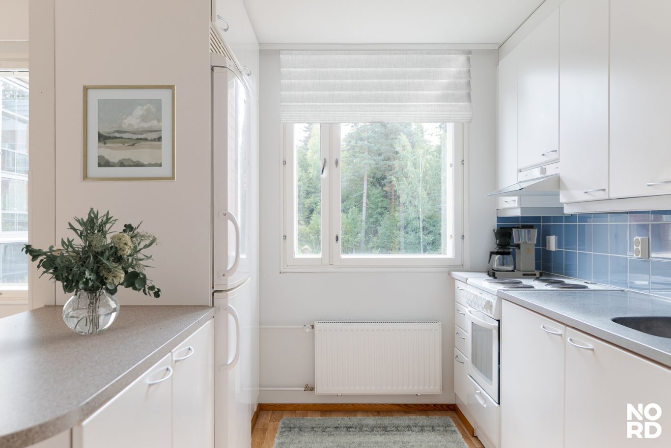 Tässä kodissa yhdistyvät lämmin tunnelma ja toimiva pohjaratkaisu. Suuret ikkunat tuovat runsaasti luonnonvaloa ja korostavat avaraa tilaa. Neljännen kerroksen sijainti tarjoaa rauhallisen asumisympäristön, ja kokonaisuuden täydentävät oma sauna sekä lasitettu parveke, jolta avautuvat vehreät näkymät ja jossa voi nauttia rauhallisista hetkistä vuoden ympäri.