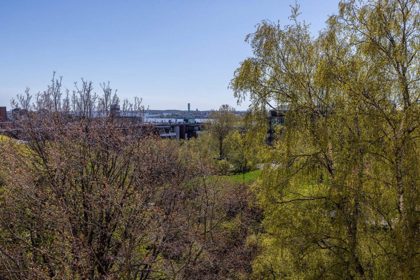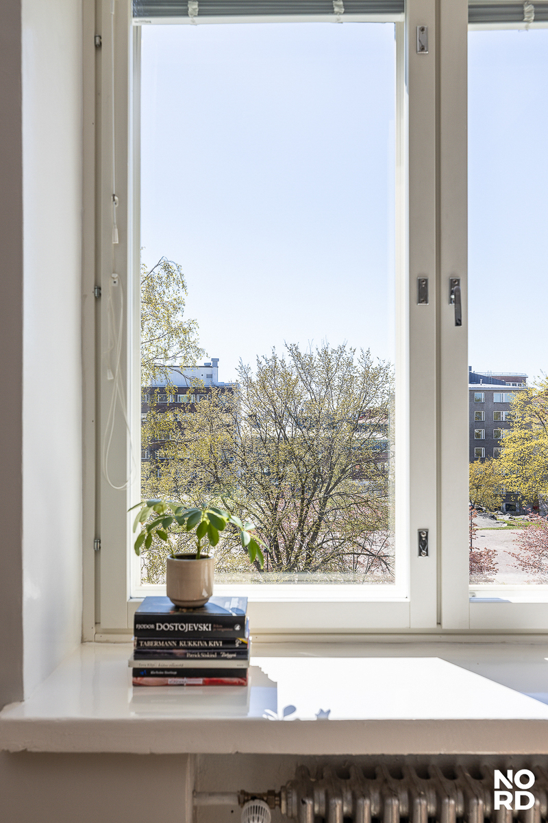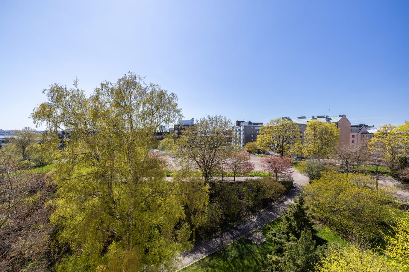Tämä hyvin hoidetun hissitalon seitsemännen kerroksen koti yhdistää onnistuneesti vanhan talon arvokkuuden ja nykyajan mukavuuden. Suurista ikkunoista avautuvat avarat puistonäkymät tuovat asuntoon rauhaa sekä ilmavuutta, ja kauempana siintävä meri luo kauniin lisäsävyn maisemaan.