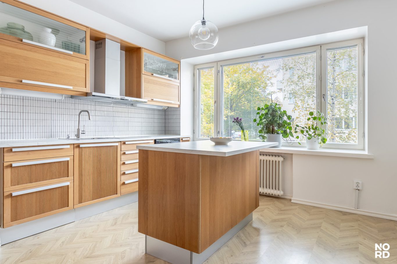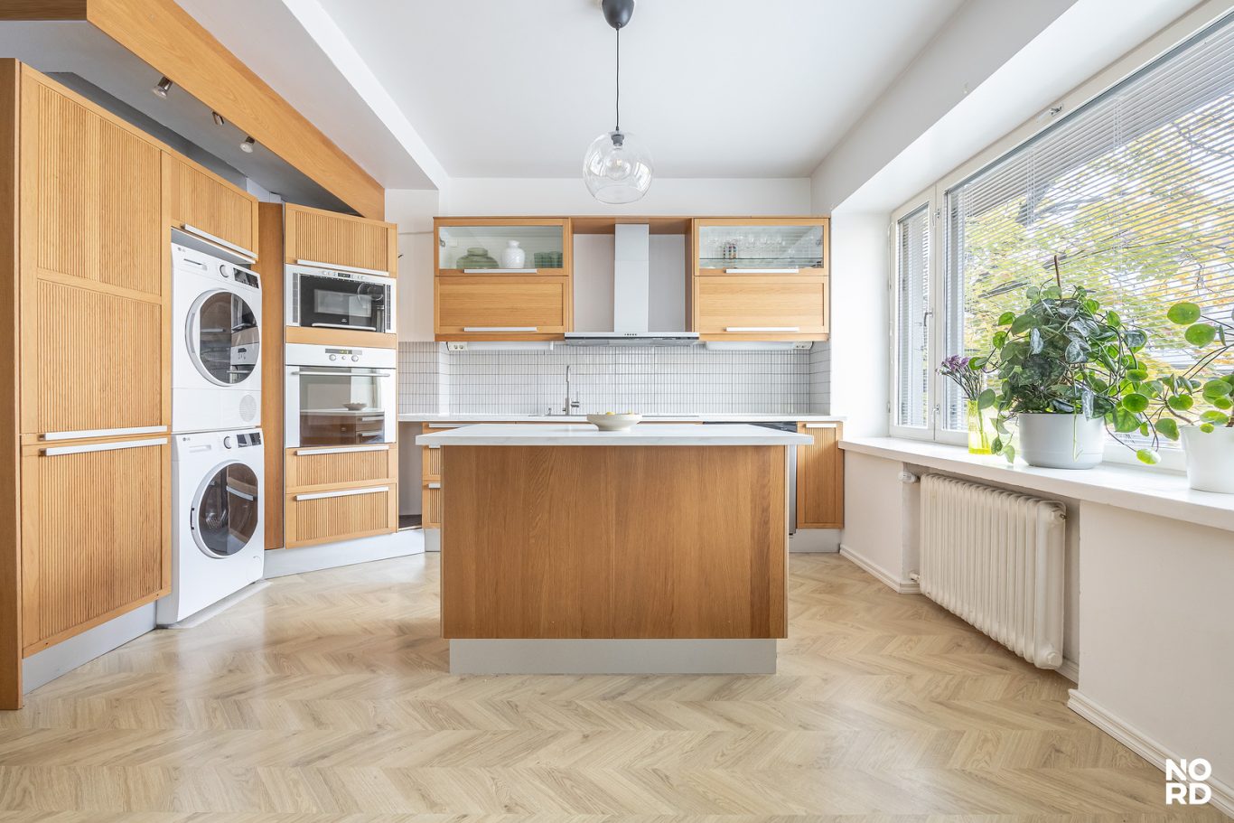 • Avokeittiön lattia on laminaattia ja seinät on maalattu. Välitila kaakeloitu, työtasot laminaattia. Saareke. Paikka pesutornille, erillisuuni, liesi, liesituuletin, jääkaappi/pakastin, astianpesukone.