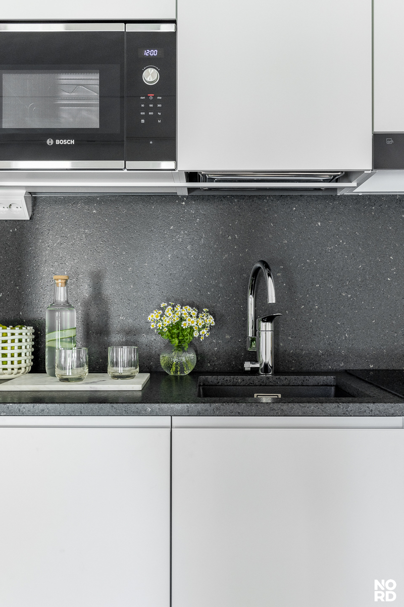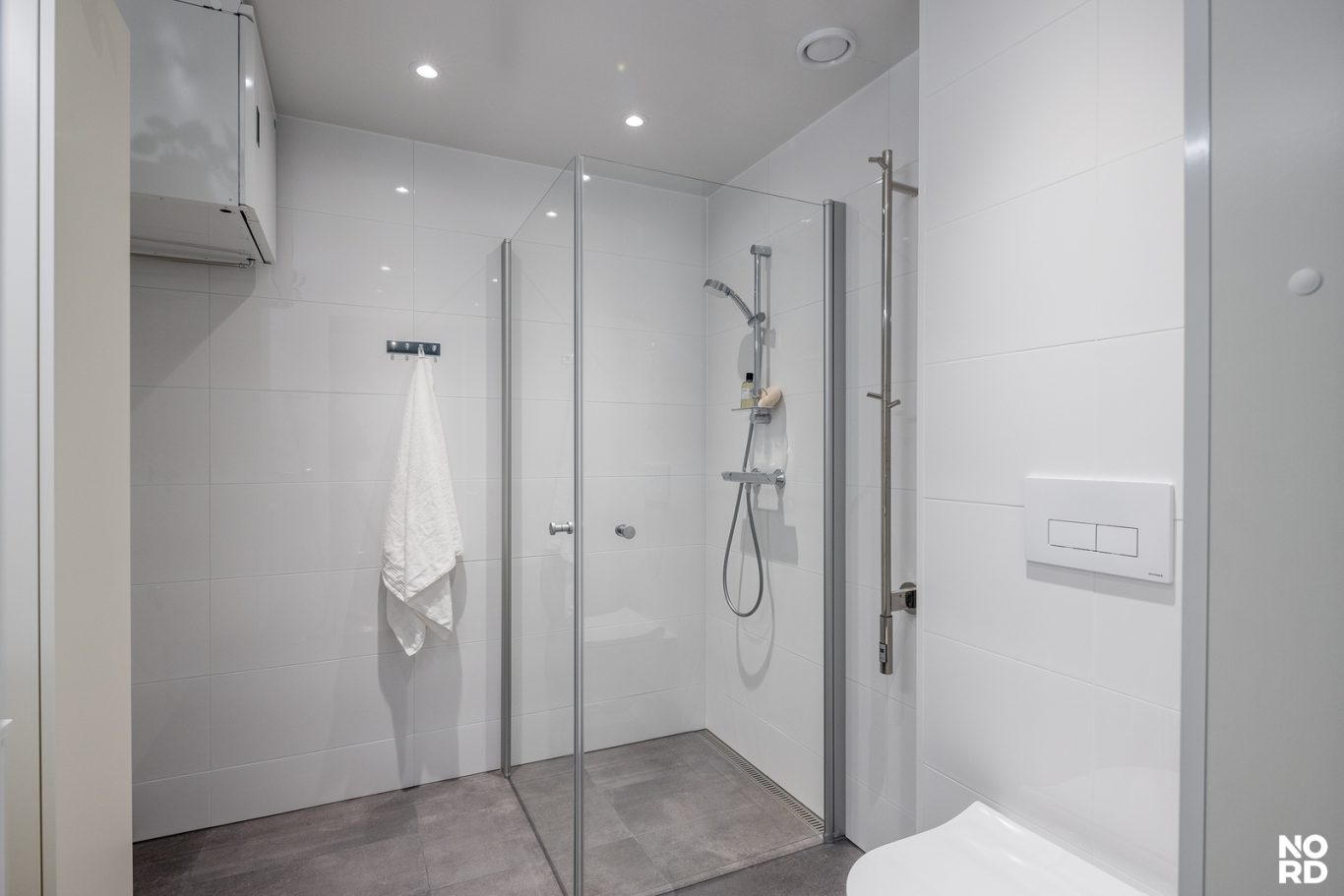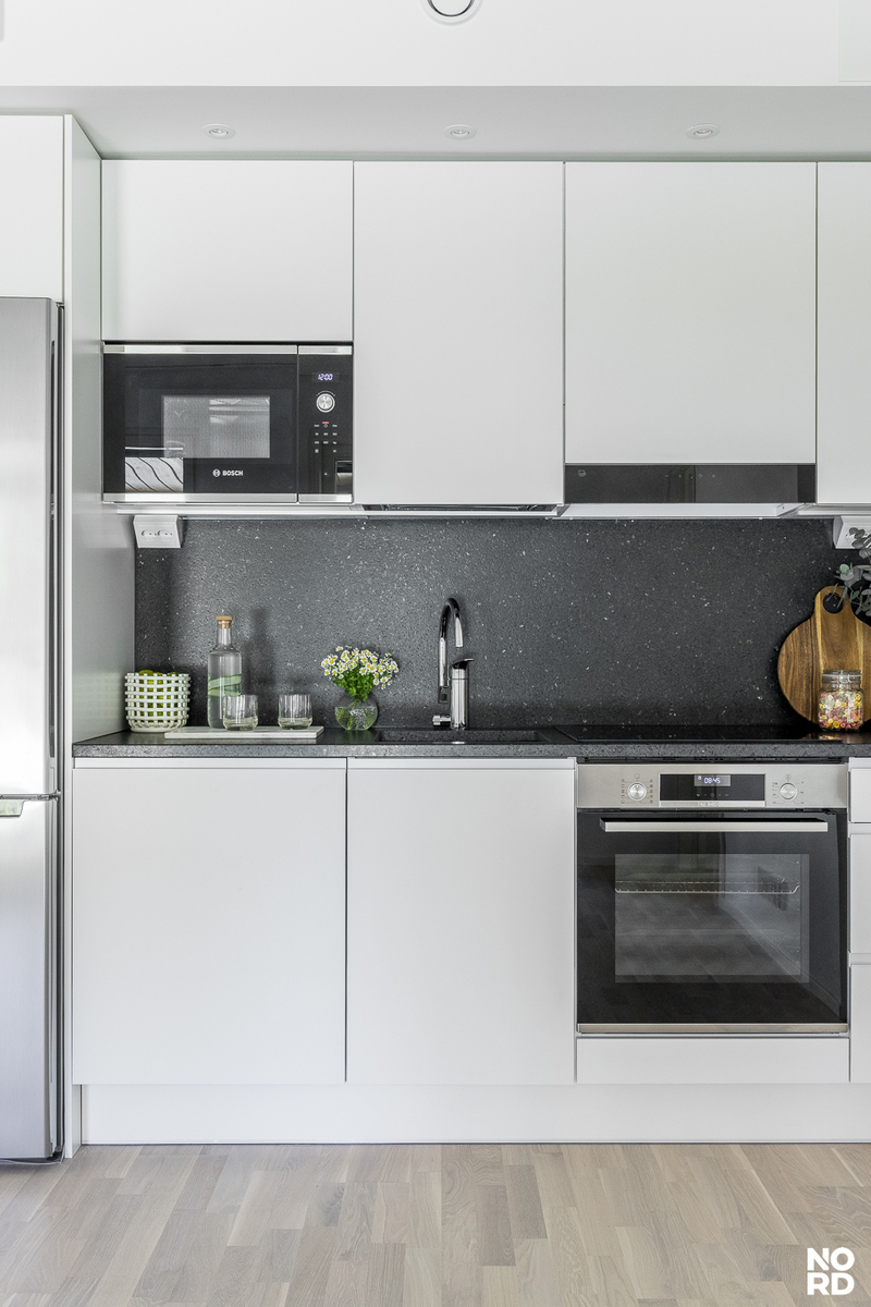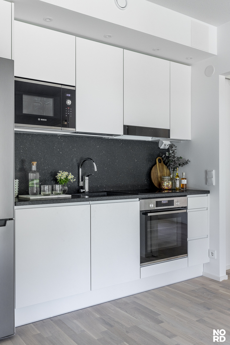 Ylellistä tunnelmaa asuntoon tuovat suuret ikkunat, laadukkaat parkettilattiat ja upea kylpyhuone. Näyttävä Puustellin keittiö kivitasoilla ja Boschin kodinkoneilla tuo arkeen luksusta. Tilavasta ja viihtyisästä olohuoneen ja avokeittiön yhdistelmästä on käynti valtavan kokoiselle parvekkeelle, josta aukeaa avarat näkymät sisäpihan suuntaan. Asunnossa on reilunkokoinen makuuhuone jonka yhteydessä on tilava vaatehuone. Asuinmukavuutta nostaa asuintilat kattava vesikiertoinen lattialämmitys.