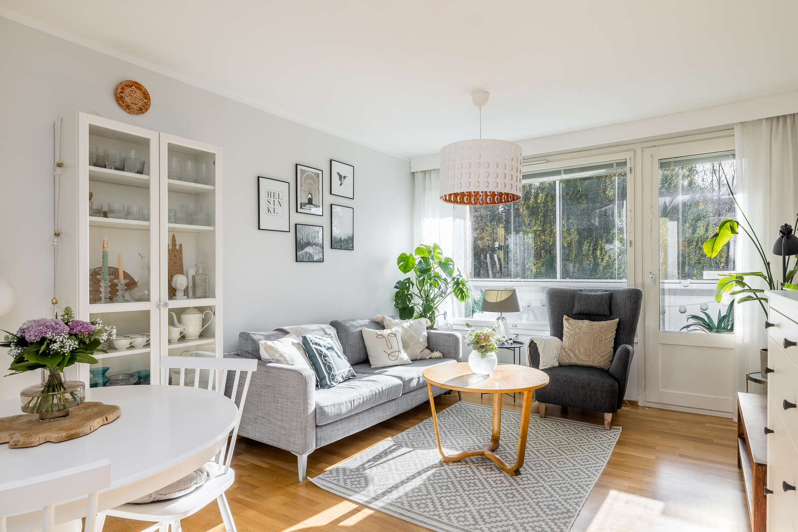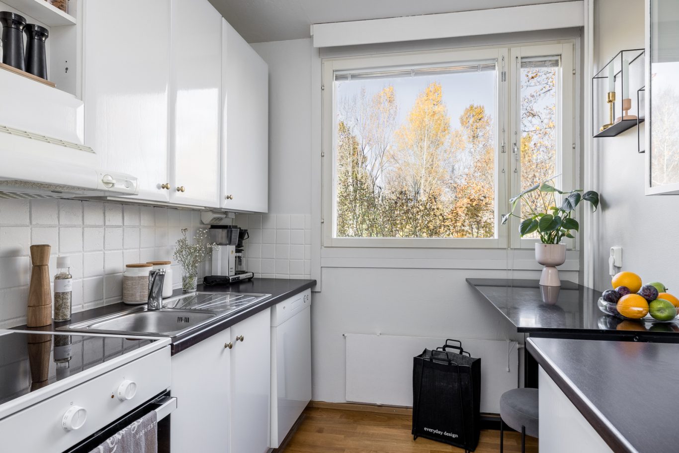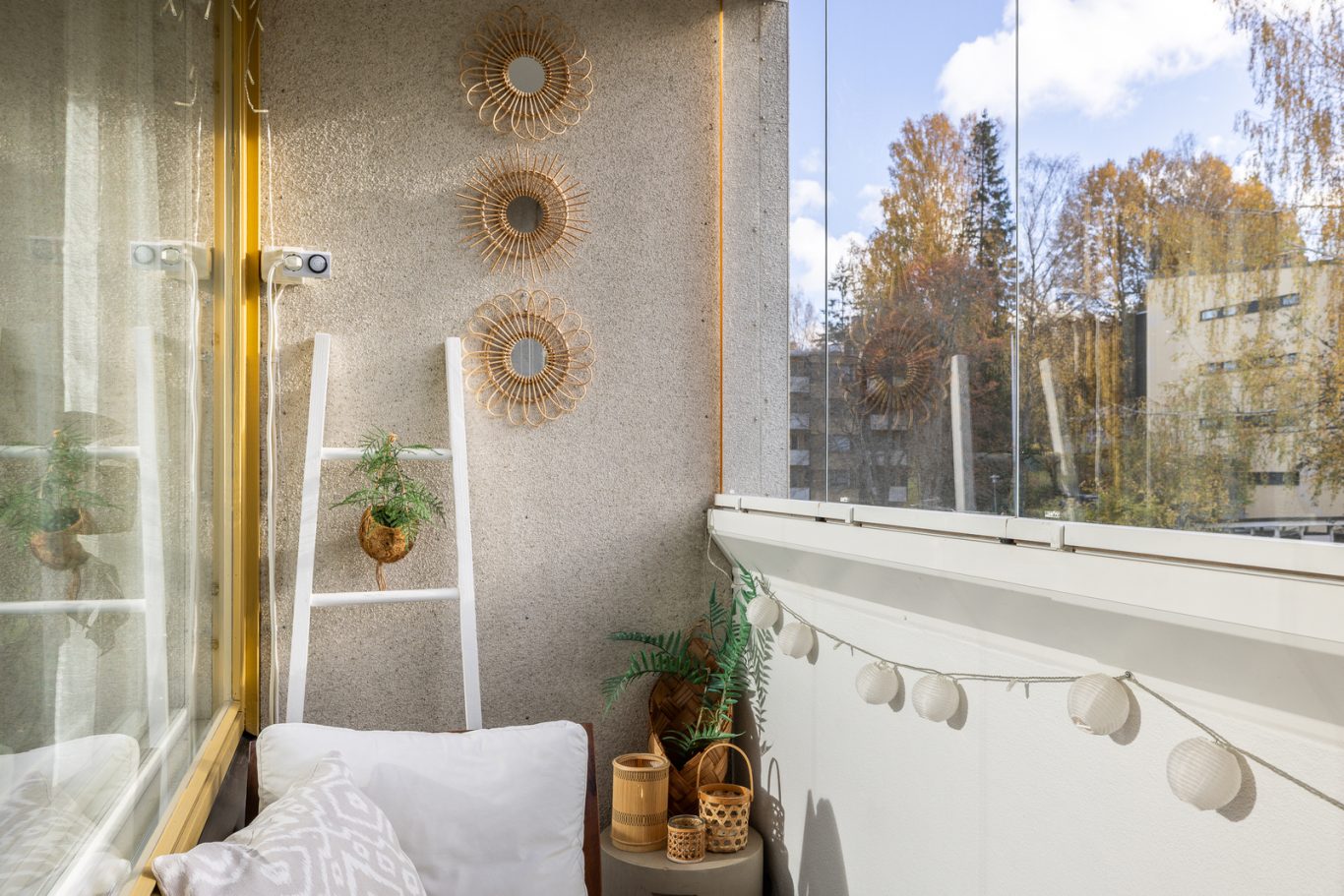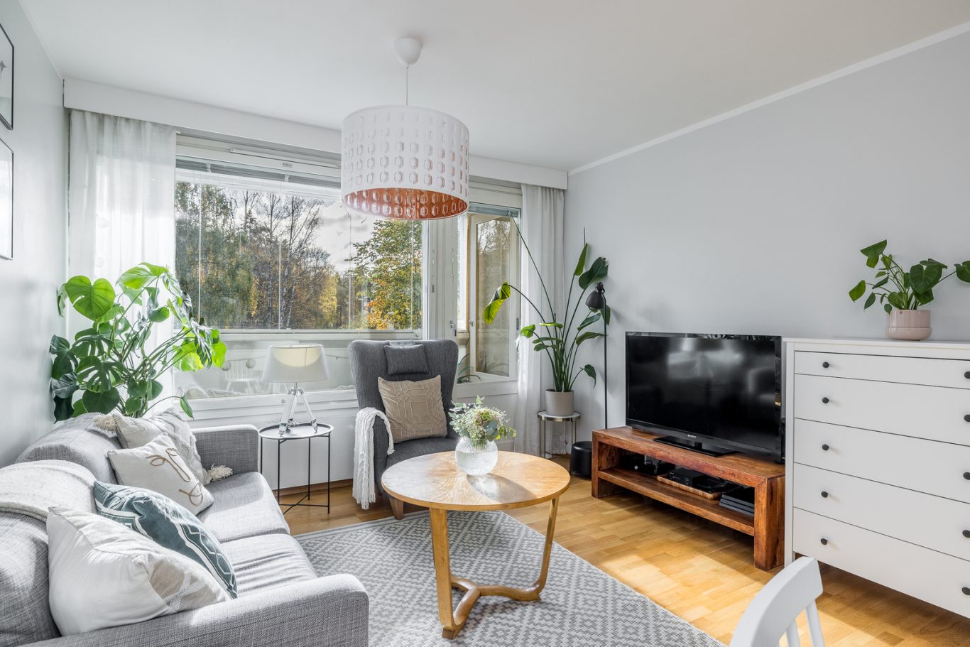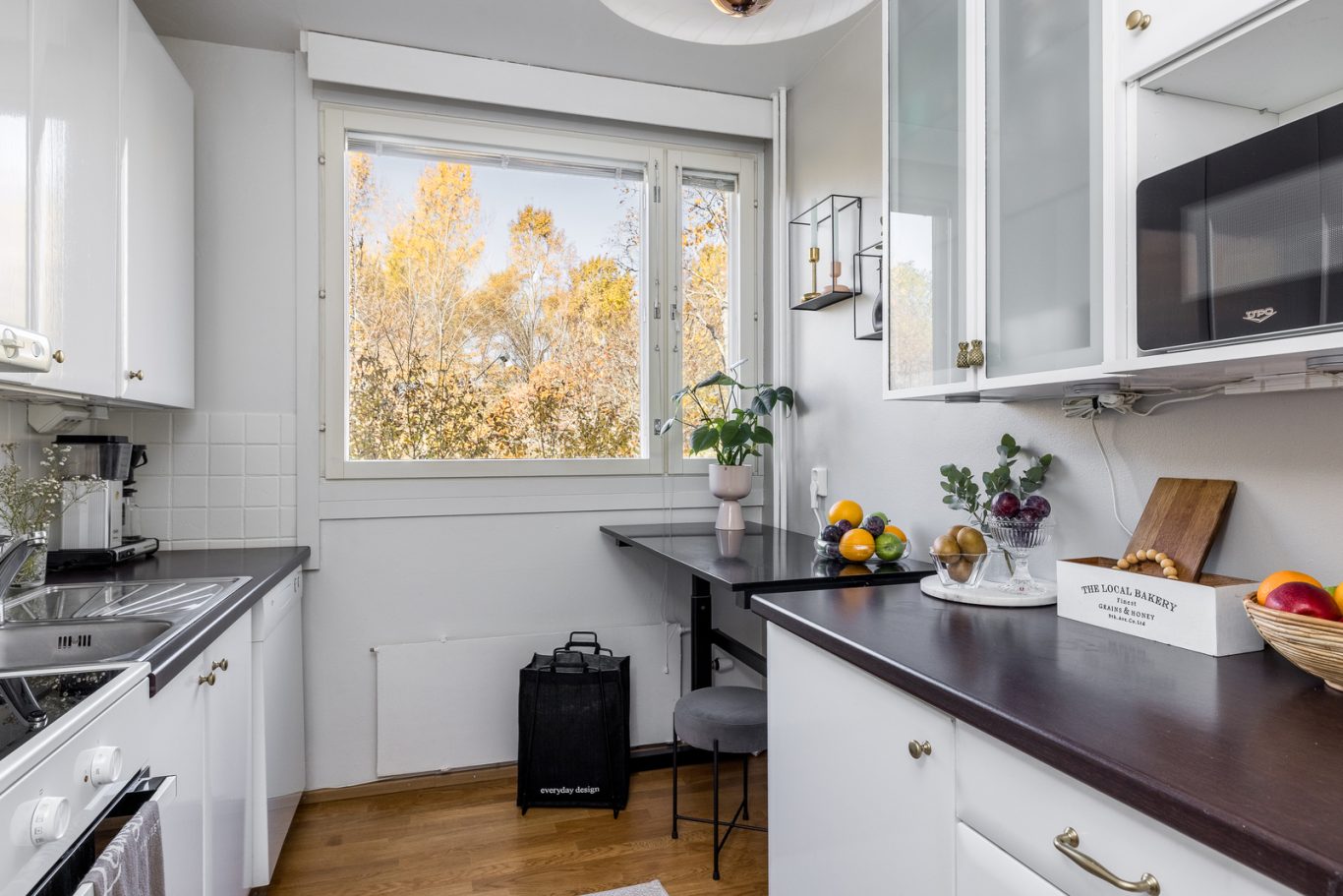 Tämä kaunis ja hyvin suunniteltu koti hurmaa valoisuudellaan, vehreillä näkymillä ja optimaalisella pohjaratkaisullaan. Olohuone on tilava, keittiö hyvin varusteltu ja kylpyhuoneessa on paikka pesukoneelle, kun taas vaatehuoneen ja kaapistojen ansiosta säilytystilaa on runsaasti. Lasitettu parveke toimii viihtyisänä lisähuoneena aikaisesta keväästä pitkälle syksyyn ja on täydellinen paikka aamukahville tai illan rentoutumishetkiin.