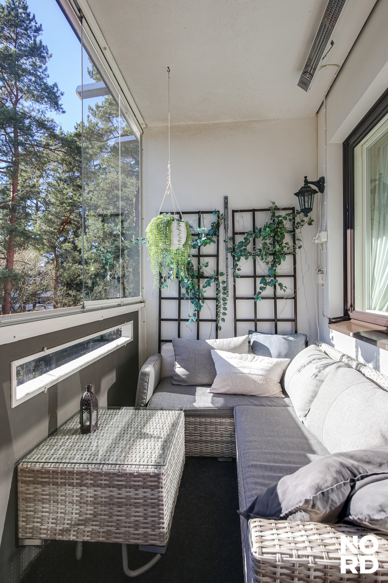 Olohuoneeseen mahtuu kunnolliset sohva-, tv- ja kirjahyllykalusteet. Olohuoneesta on käynti lasitetulle parvekkeelle, jossa pääset nauttimaan lämmöstä ja valosta varhaiskeväästä pitkälle syksyyn. Valkoisessa keittiössä on hyvin työskentely- ja säilytystilaa sekä paikka ruokapöydälle. Asunnossa kaksi isompaa ja yksi pienempi makuuhuone. Niissä kaikissa on hyvät ikkunanäkymät ja vaatesäilytystilaa. Kylpyhuone/wc:ssä hoituu niin peseytyminen kuin pyykinpesukin. Asunnossa on lisäksi arkielämää helpottava erillis-wc.