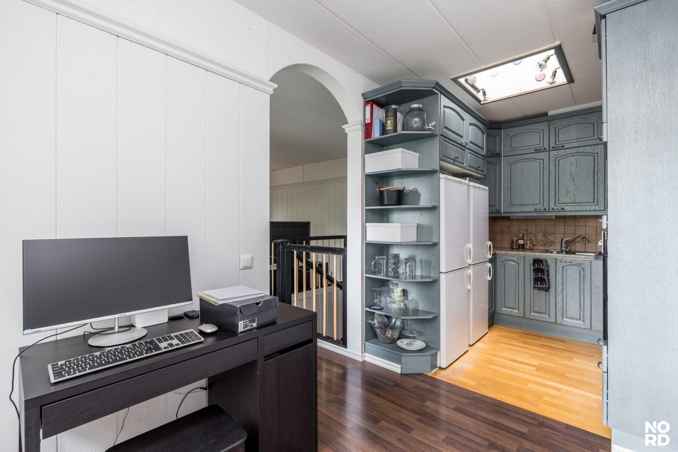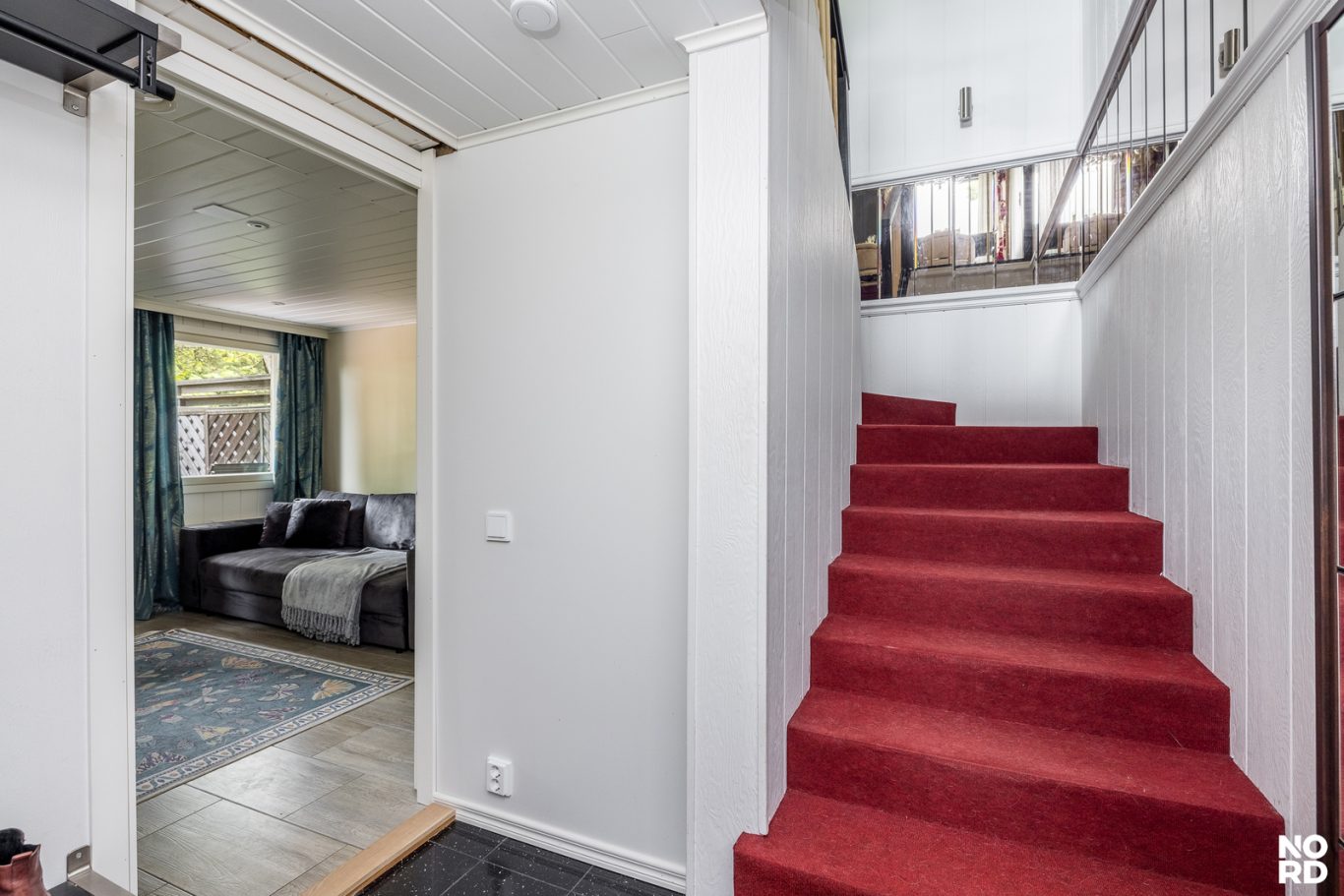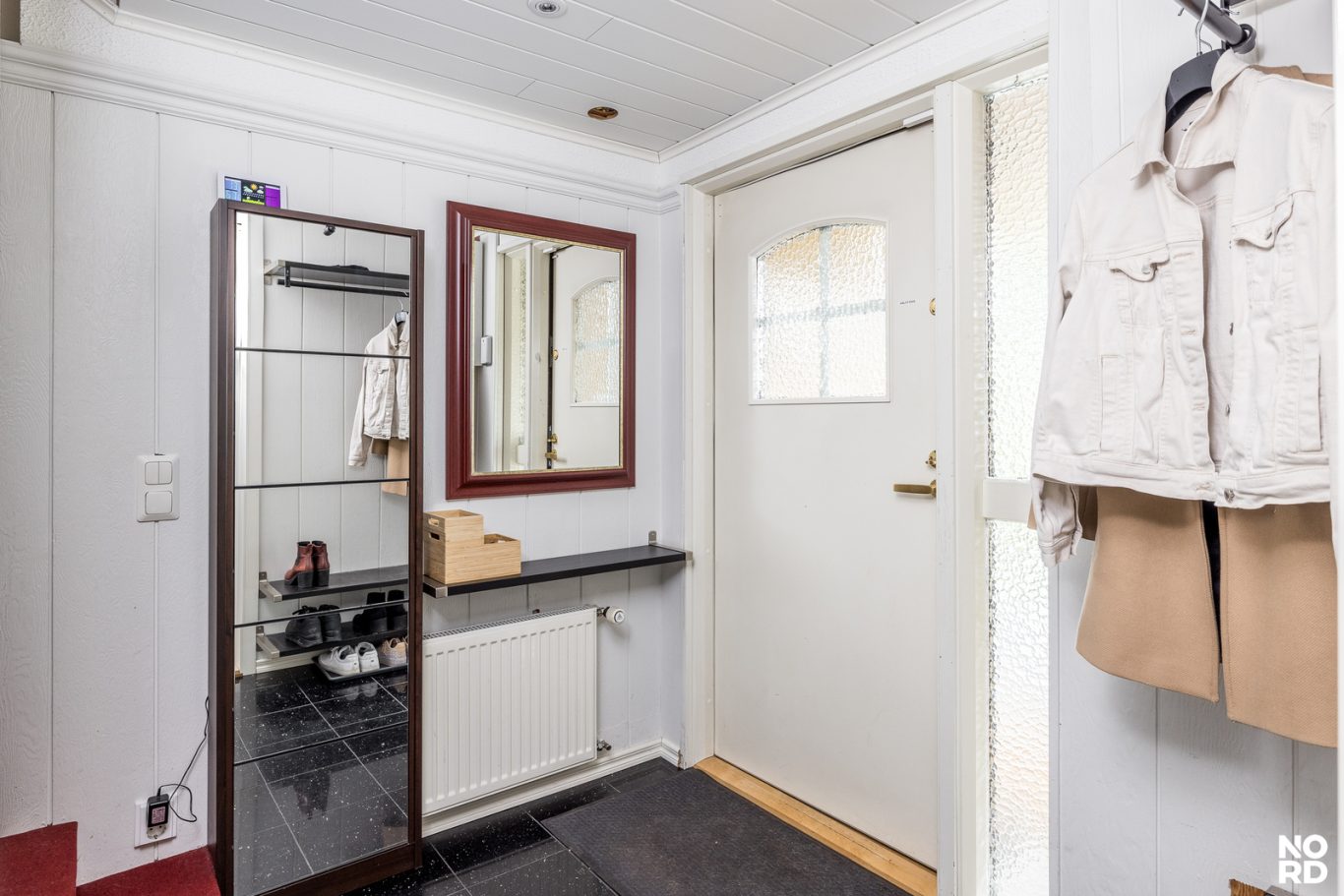 | Tilojen kuvaus | Eteisen lattiamateriaali laatta. Portaissa pinnoitteena matto. Osa asunnon seinäpinnoista kattojen lisäksi paneloitu. |