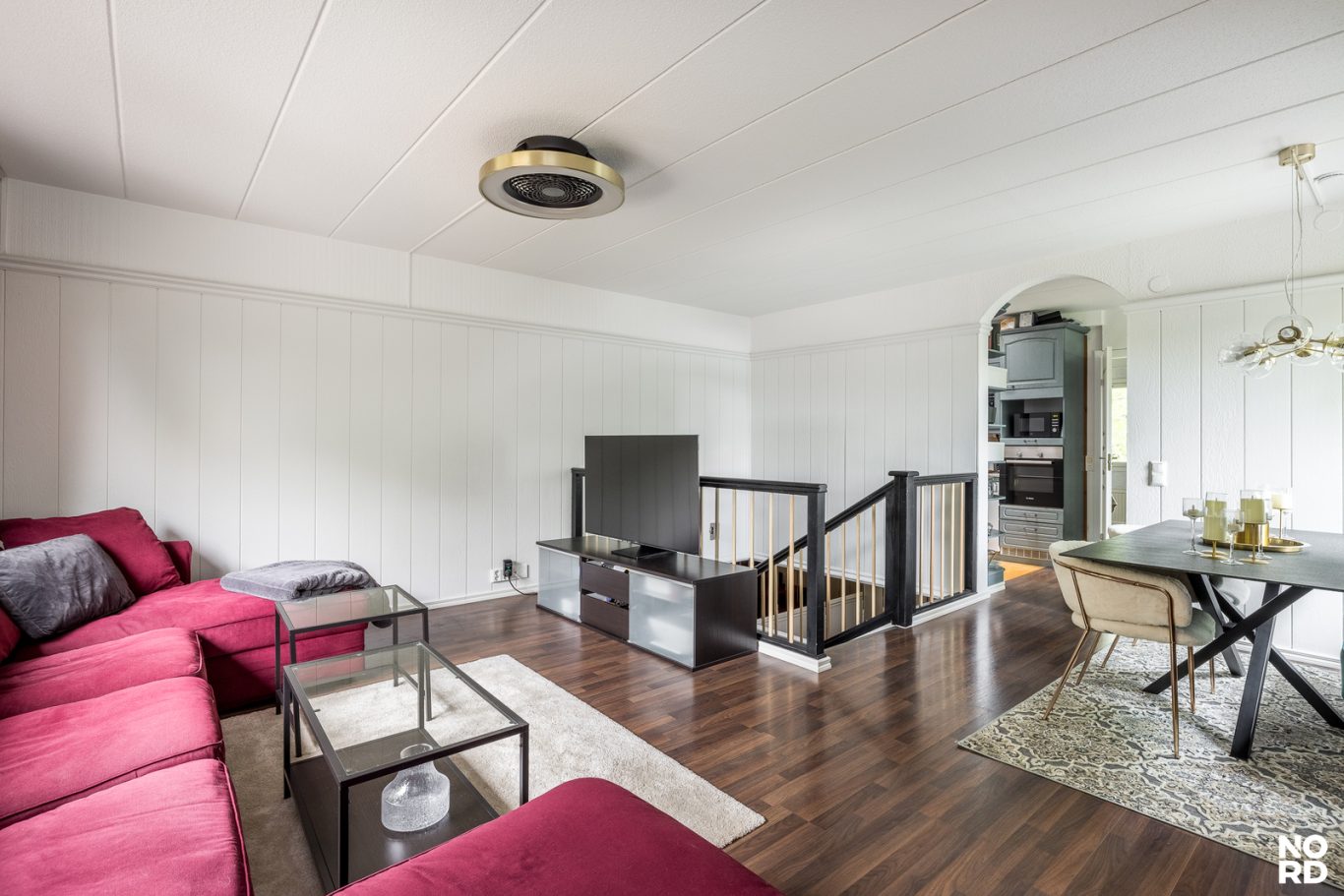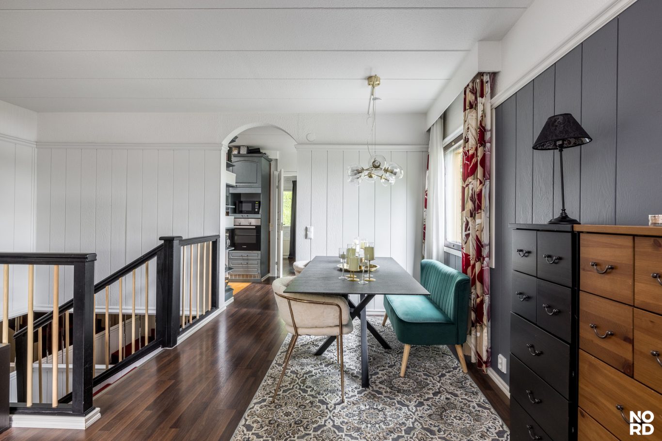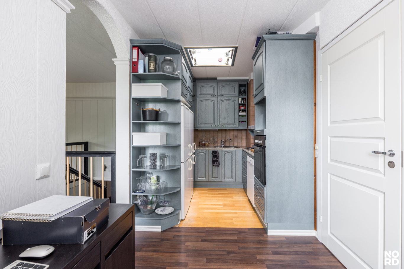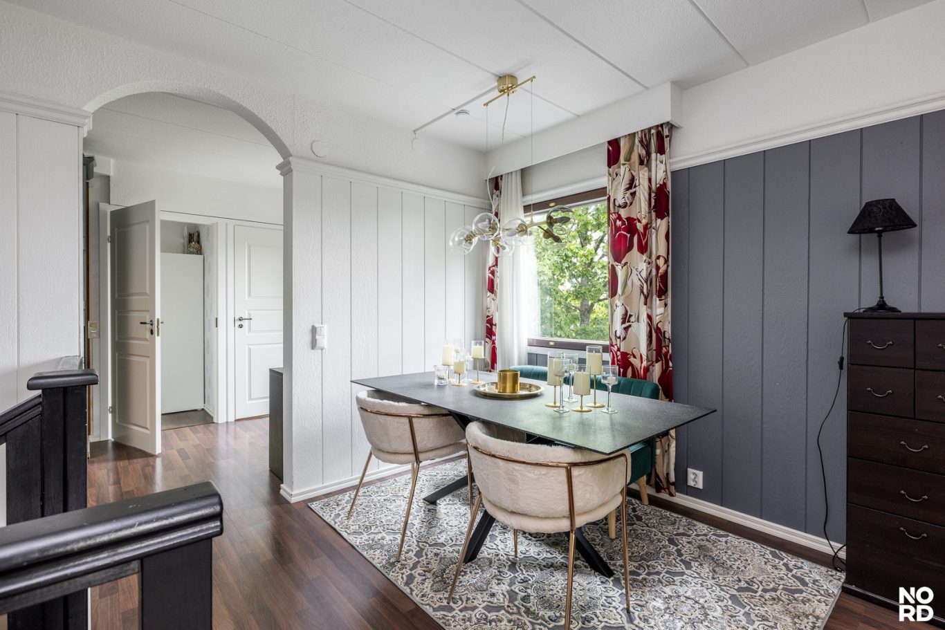 | Tilojen kuvaus | Eteisen lattiamateriaali laatta. Portaissa pinnoitteena matto. Osa asunnon seinäpinnoista kattojen lisäksi paneloitu. |