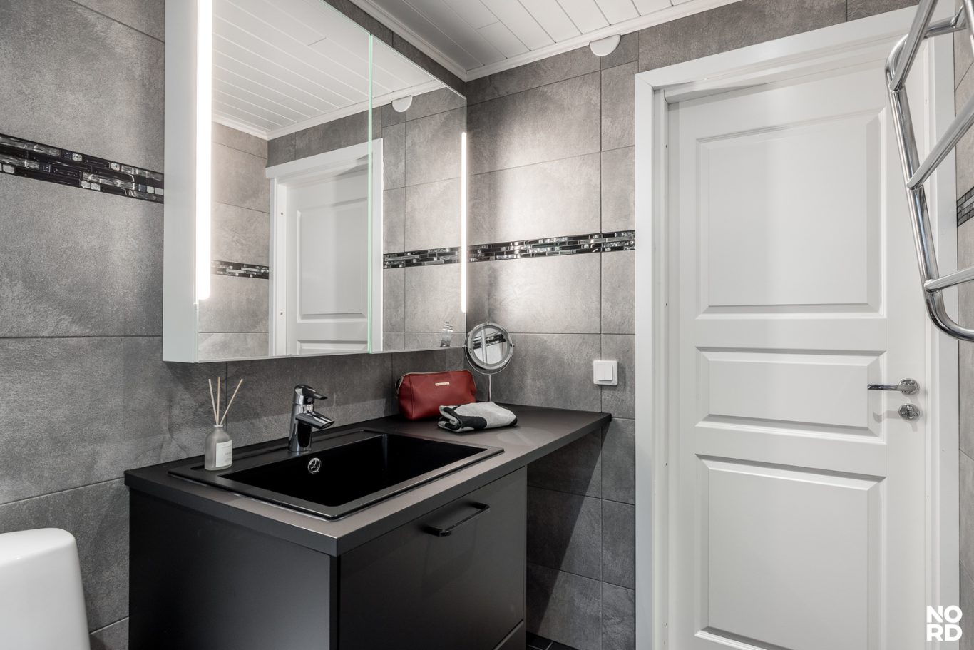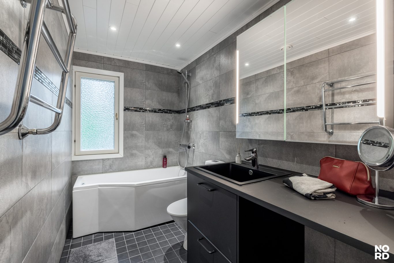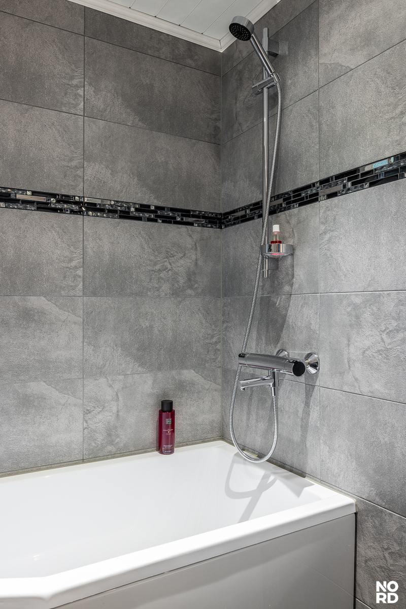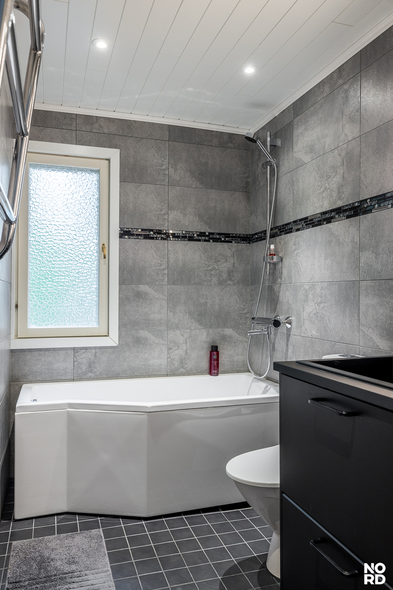Uudistettu, ikkunallinen yläkerran kylpyhuone tarjoaa ammeen ansiosta täydelliset puitteet rentoutumiselle. Myös alakerran kylpyhuone on remontoitu sieltä löytyy käytännöllinen suihku, tilava sauna sekä kätevä tila pesukoneelle. Säilytystilaa löytyy reilusti makuuhuoneen kaapistoista, portaiden alatilasta sekä autotallista.