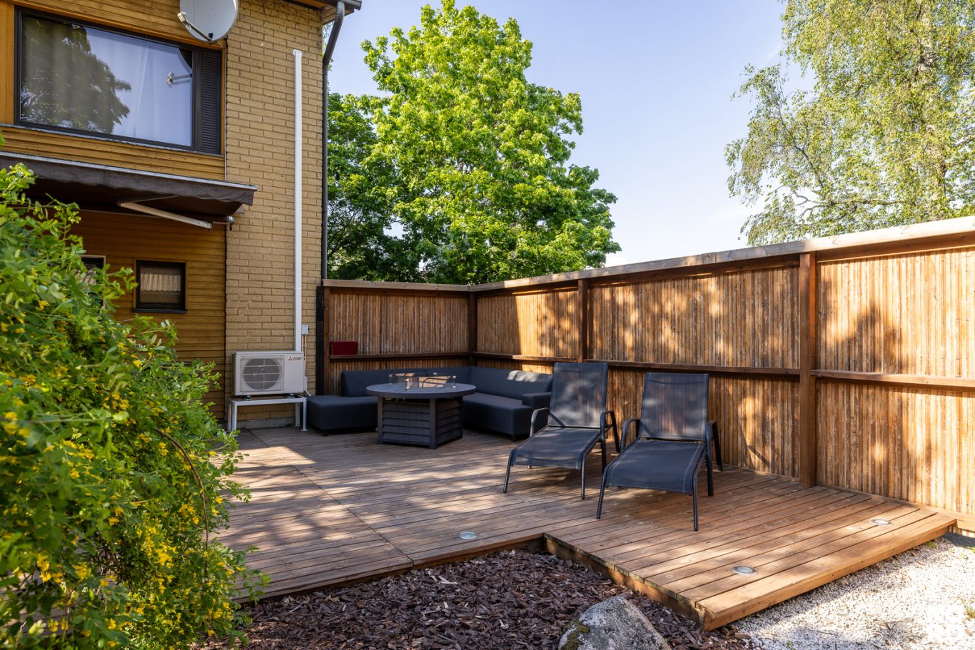 | Tehdyt korjaukset | Lattia uusittu koko asuntoon (lukuun ottamatta keittiötä), molemmat kylpyhuoneet uusittu. Terassi ja piha laitettu kuntoon. Alakerran huone remontoitu. Portaiden kaiteet ja matto kunnostettu/uusittu. Isännöitsijöntodistuksella ilmoitetut huoneiston muutostyöt: 2025 Yläkerran pesu- /wc-tilan alapuolella oleva viemäriputkitus uusittu (ilmoitettu taloyhtiölle), 2020 Saunatila uusittu (ilmoitettu taloyhtiölle), 2001 Saunatila laatoitettu (ilmoitettu taloyhtiölle), 1988-1998 Saunatila uusittu (ilmoitettu taloyhtiölle), 1988-1998, 2001 ja 2019 Yläkerran pesu- /wc-tila uusittu (ilmoitettu taloyhtiölle). |