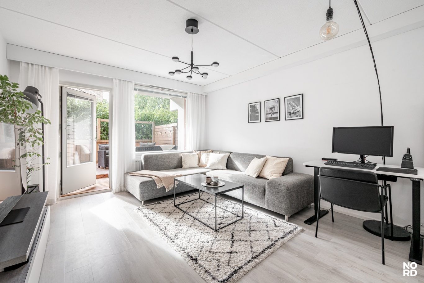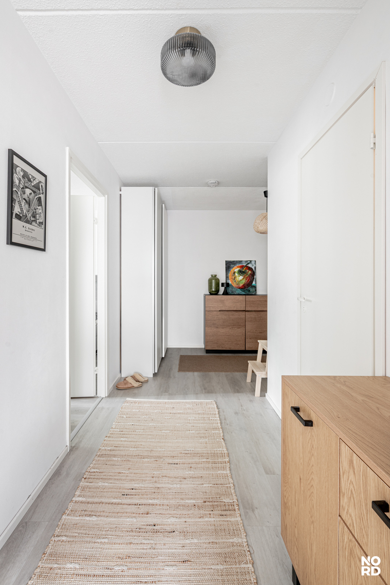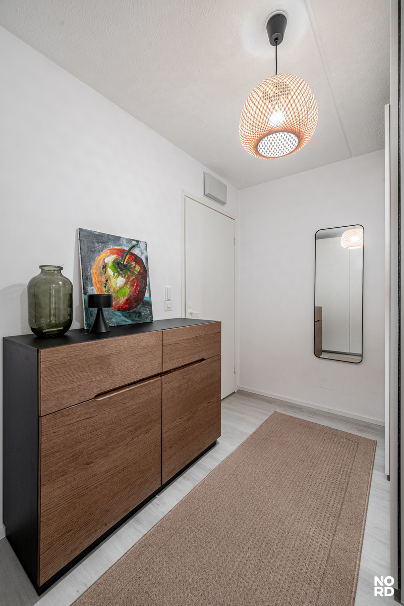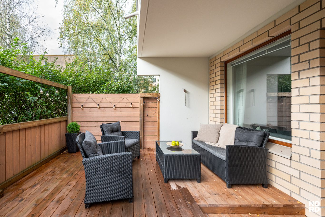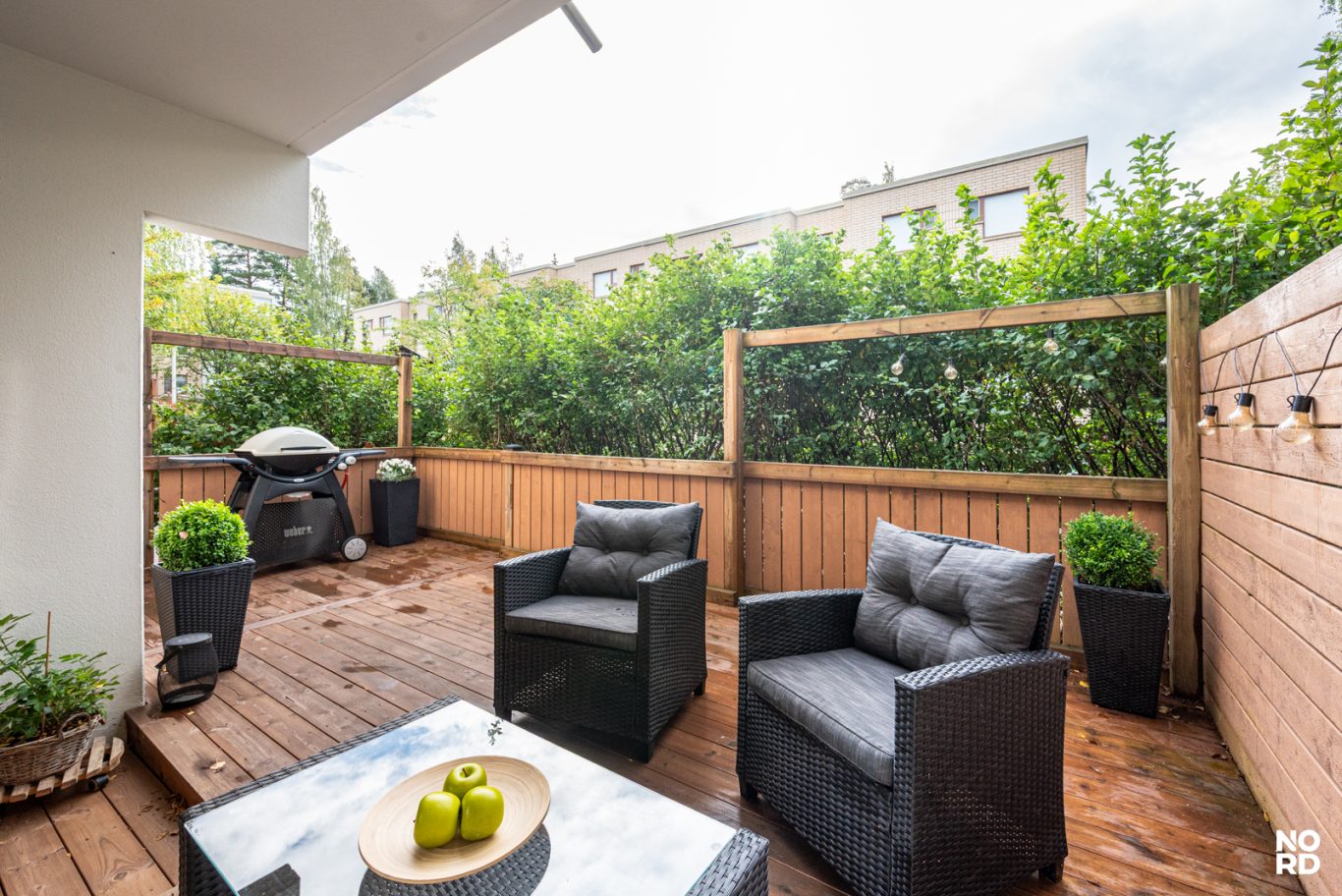 Moderni vaalea keittiö, jossa hyvin kaappi- ja laskutilaa, ja keittiön yhteyteen mahtuu hyvin ruokapöytä ikkunan ääreen. Avara olohuone, josta käynti aidatulle suojaisalle terassipihalle. Täällä on mukava keväästä syksyyn grillata sekä nautiskella auringosta. Makuuhuoneeseen mahtuu parisänky, ja lisäksi vaikkapa työpiste. Tilava kylpyhuone. Eteinen, jossa reilusti kaappitilaa. Asunto on todella siisti ja nätisti pidetty.