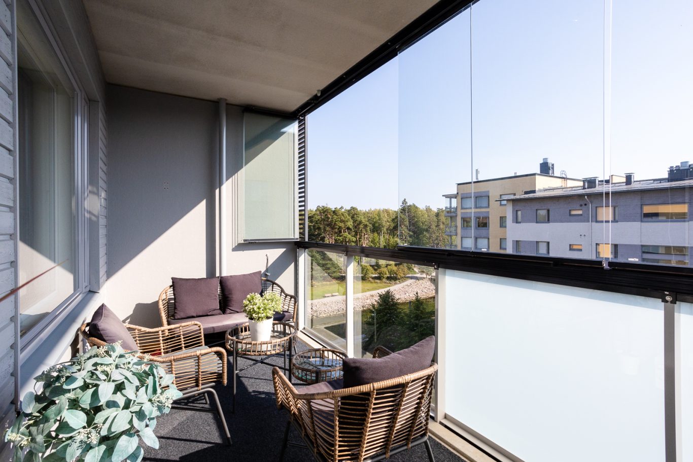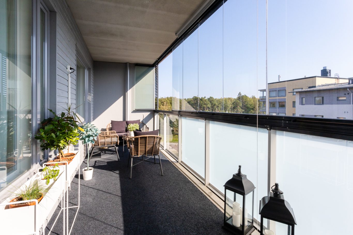 Huoneiston levyinen lasitettu parveke tuo kotiin lisää valoa ja toimii upeana lisähuoneena aikaisesta keväästä myöhäiseen syksyyn, aivan loistava paikka luovan ja tuottoisan etätyön tekemiselle.