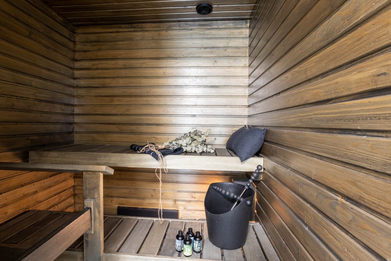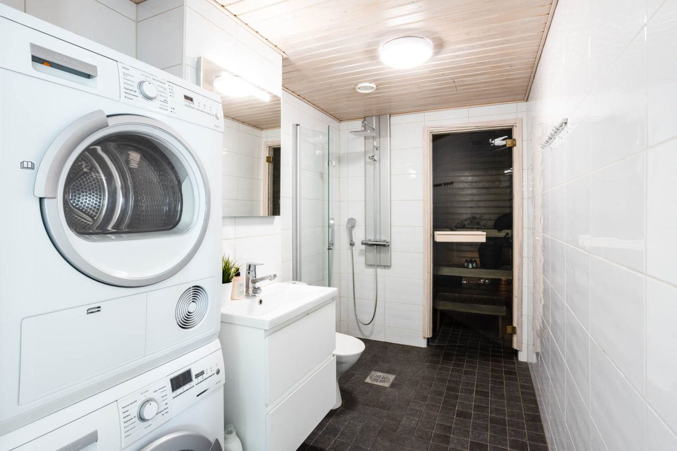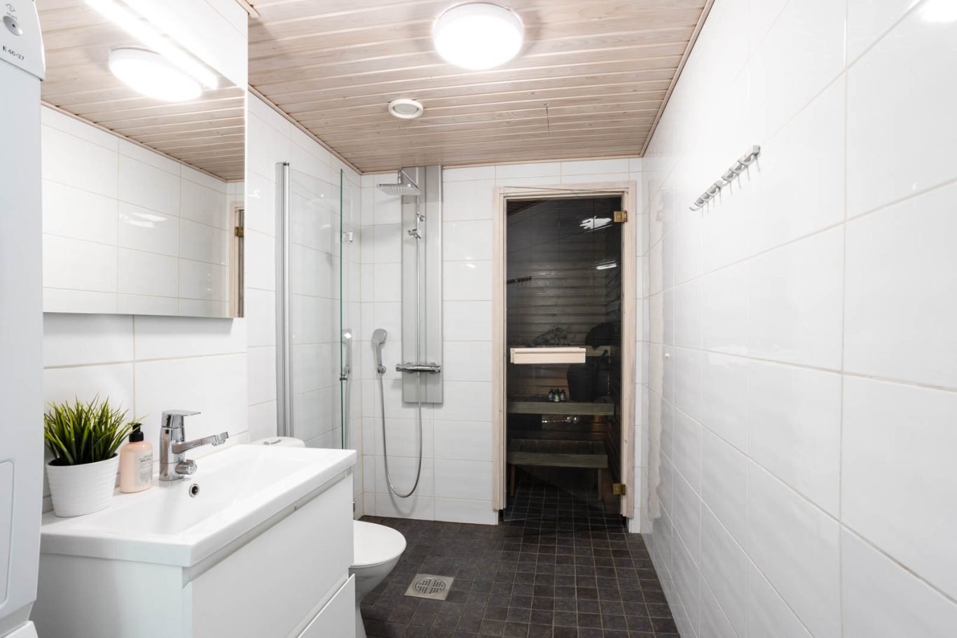 Tyylikkään tilavassa kylpyhuoneessa pääsee rentoutumaan oman kodikkaan saunan lämmössä.