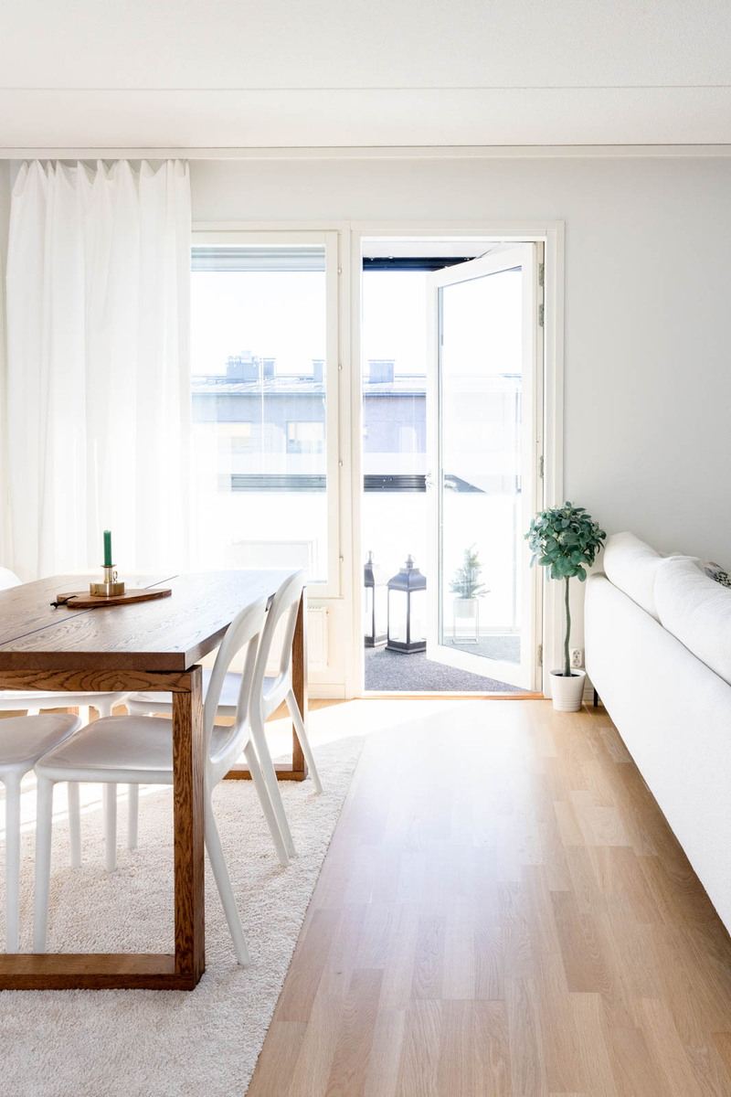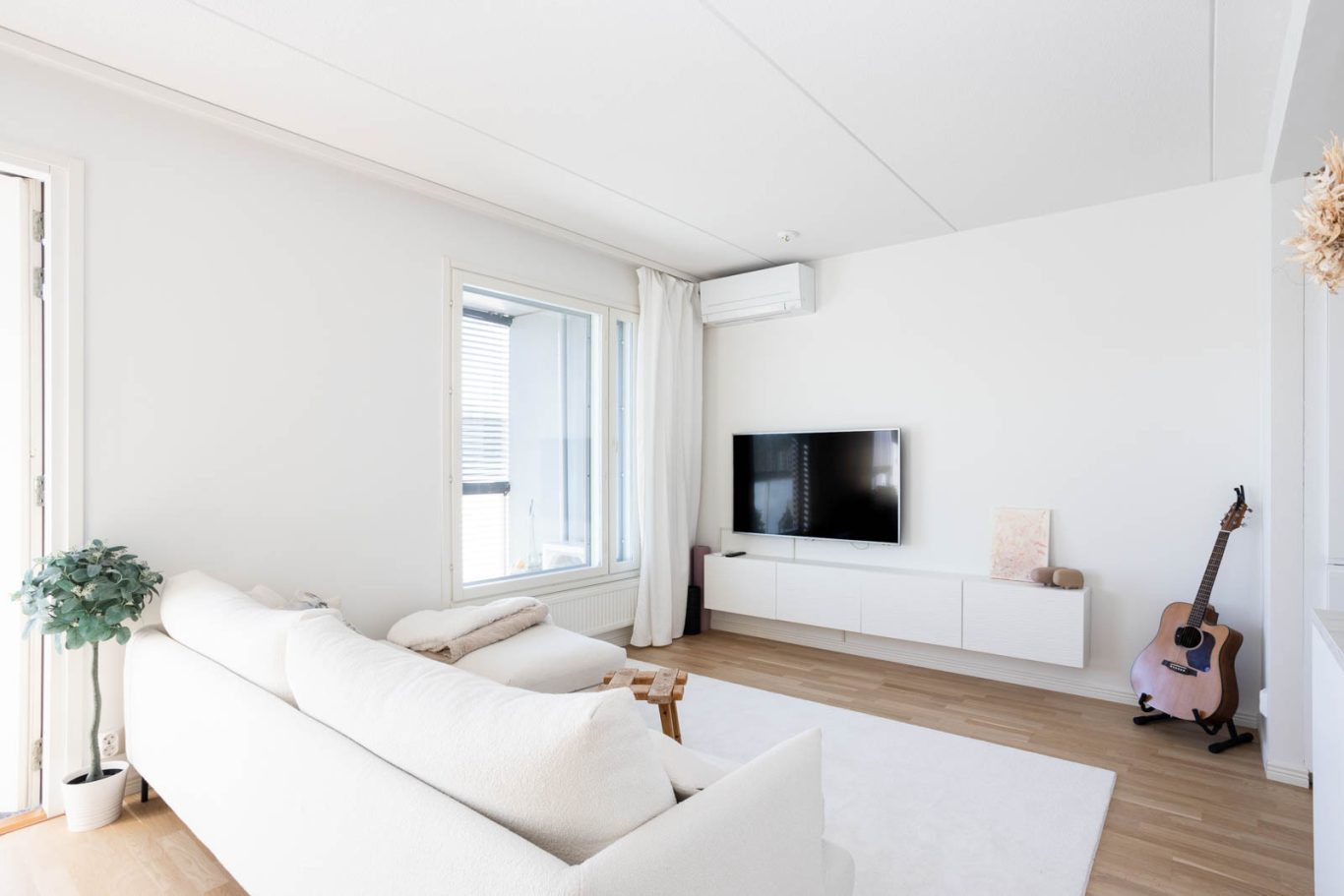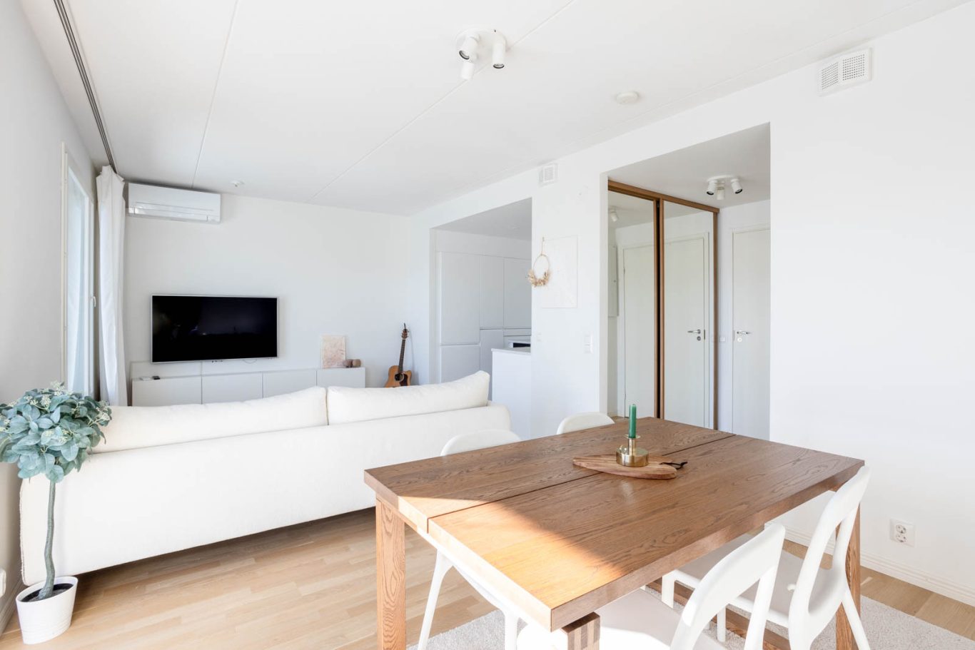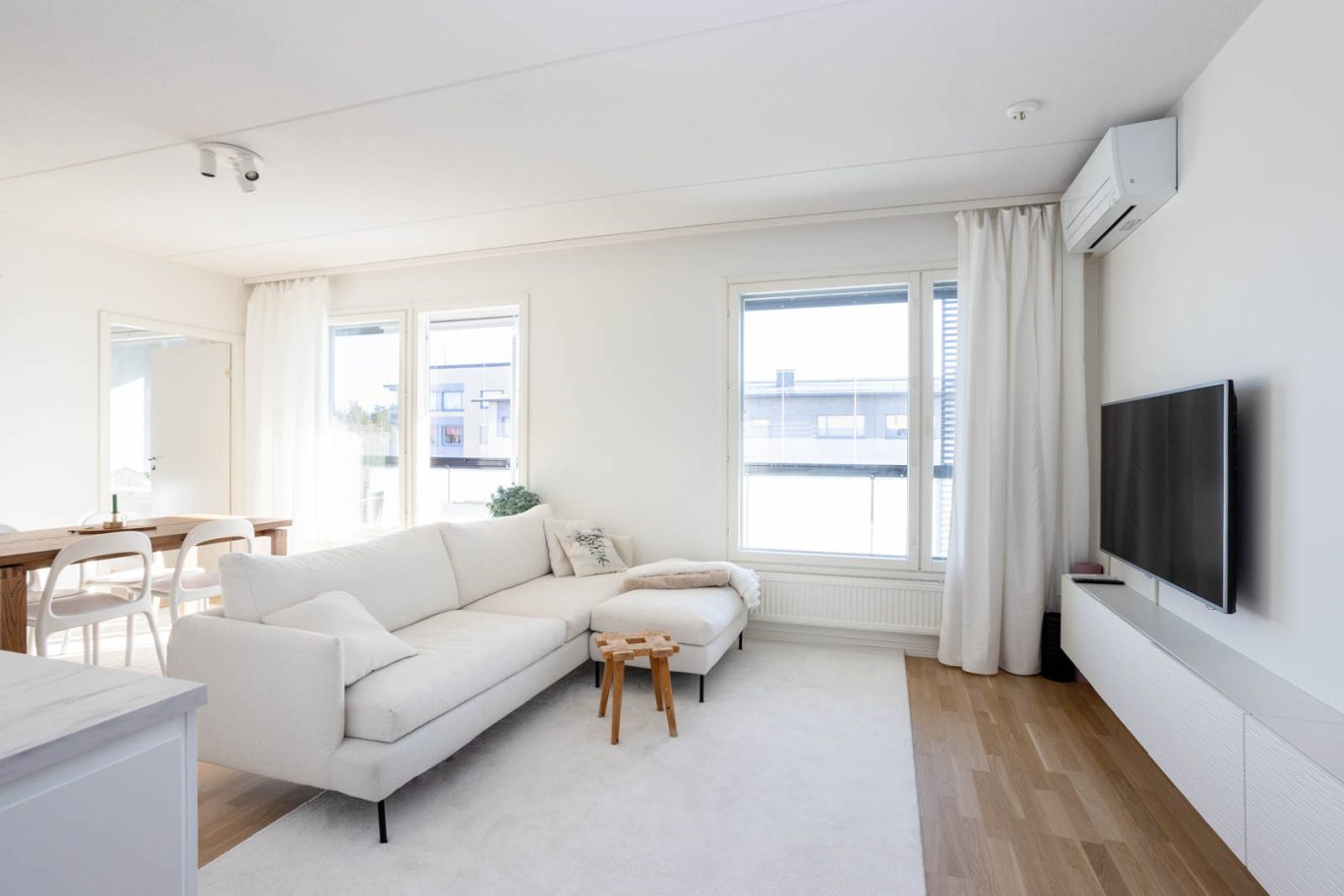 Huoneiston vaaleat pintamateriaalit ja suuret ikkunat korostavat asunnon avaruutta ja luovat raikkaan, modernin ilmeen.