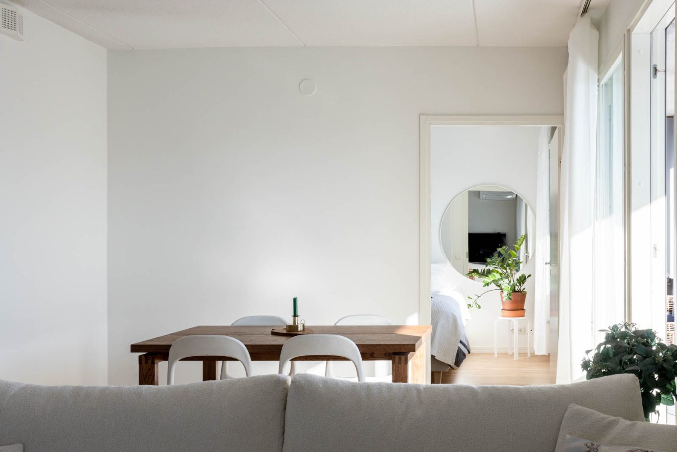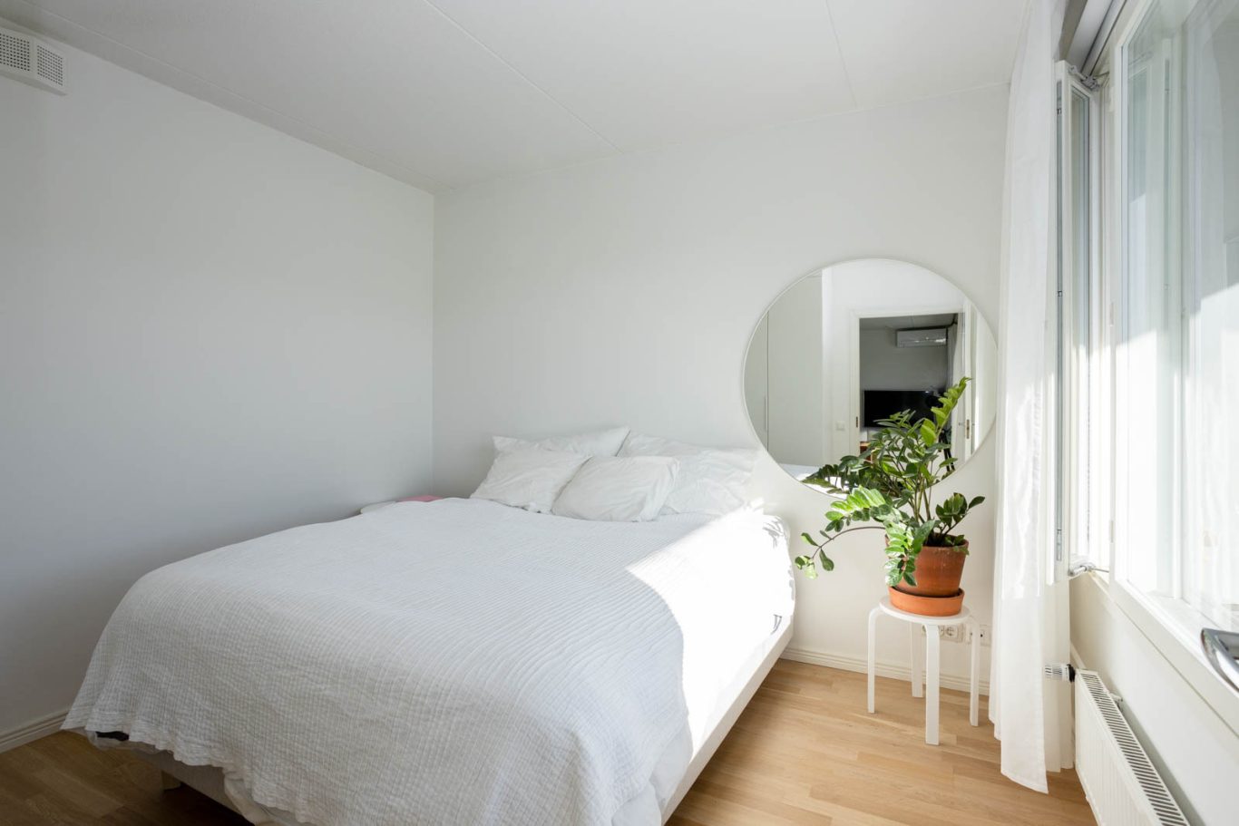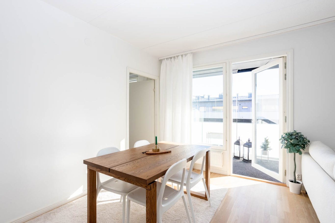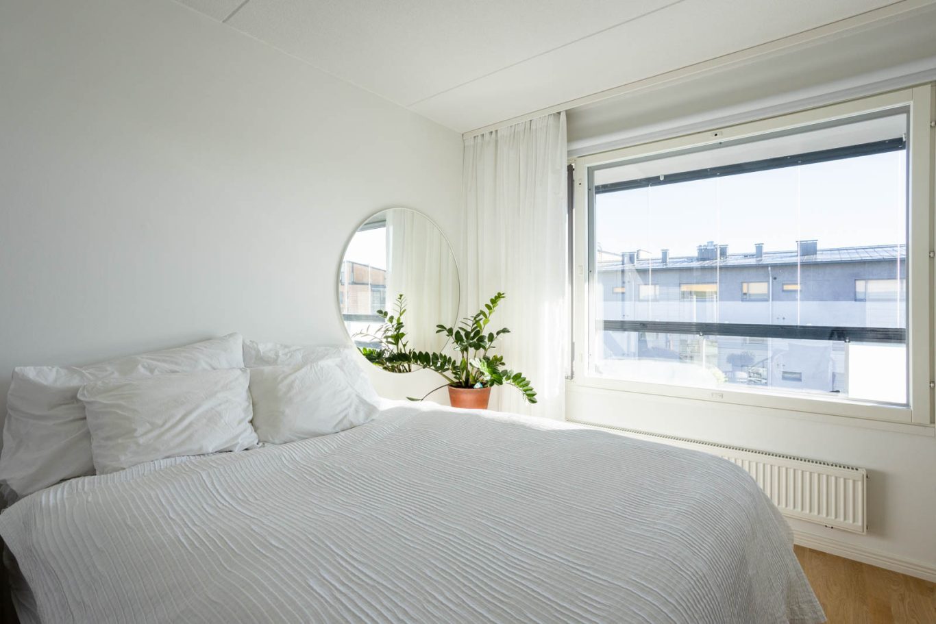 Huoneiston vaaleat pintamateriaalit ja suuret ikkunat korostavat asunnon avaruutta ja luovat raikkaan, modernin ilmeen.
