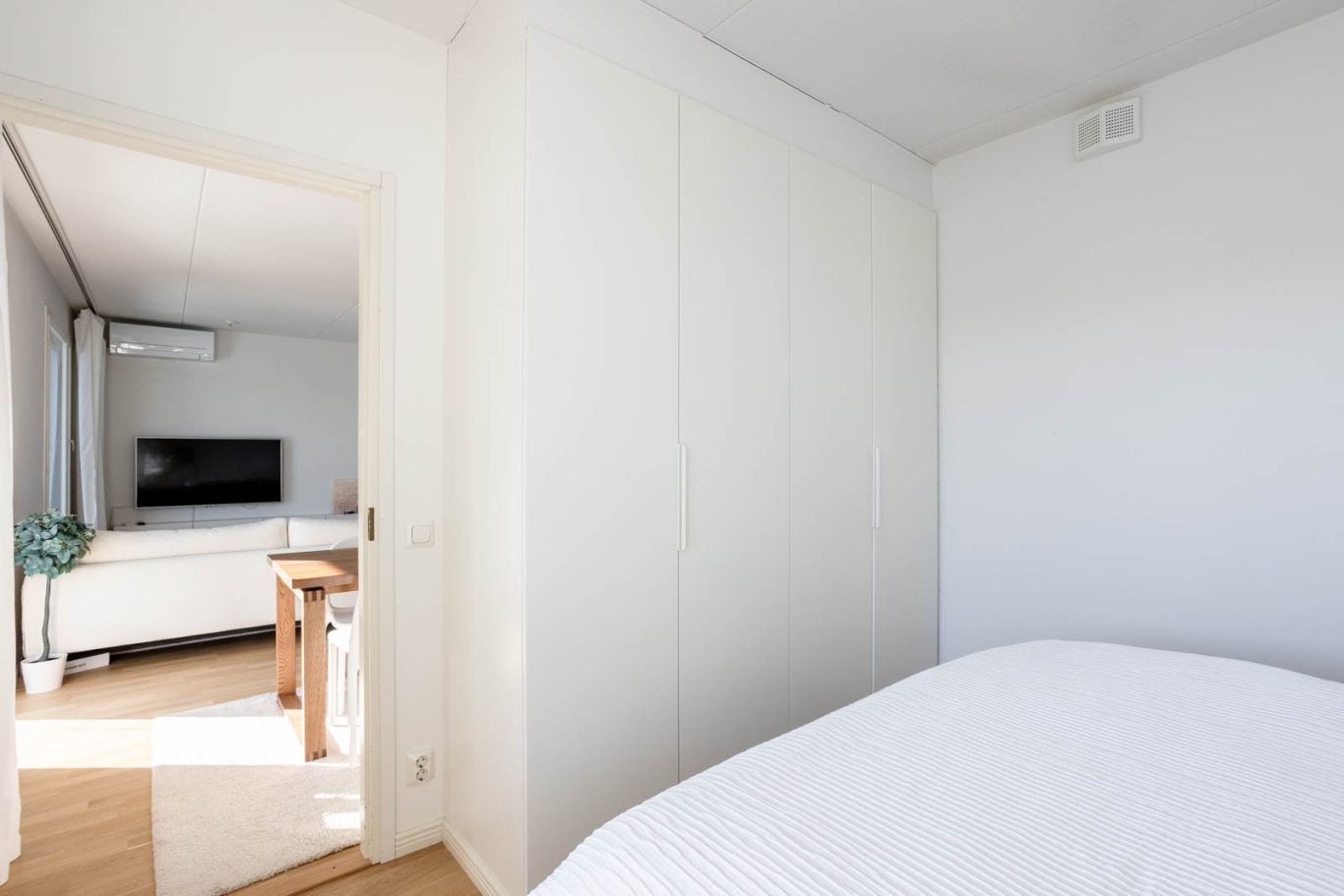 Tilava makuuhuone tarjoaa runsaasti säilytystilaa vaatekaapiston ansiosta, tilaa jää silti myös suurelle sängylle ja etätyöpisteelle upeilla maisemilla.