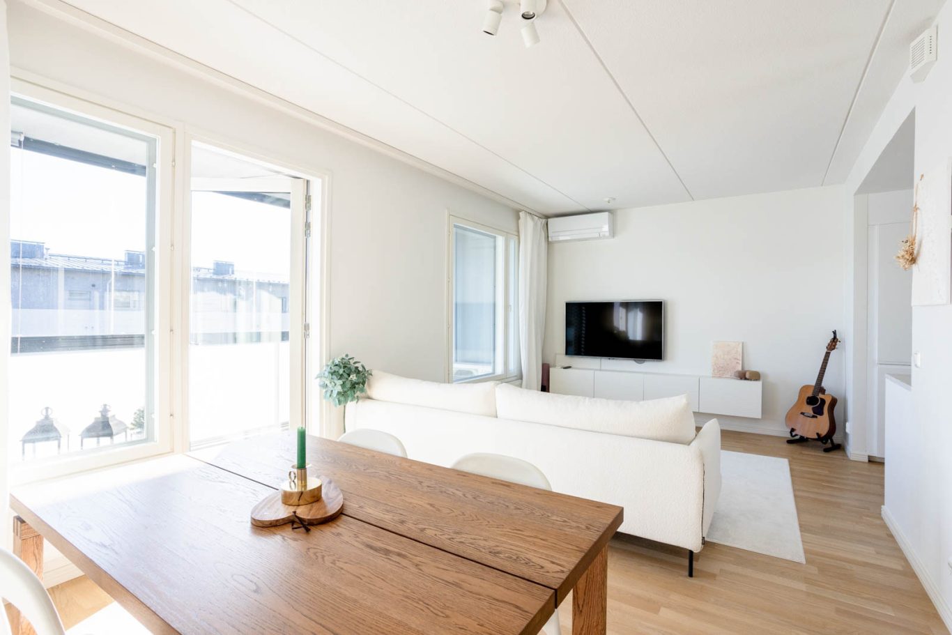 Tämä ylimmän kerroksen asunto hurmaa valoisuudellaan, erinomaisella pohjaratkaisullaan ja modernilla tyylillään.