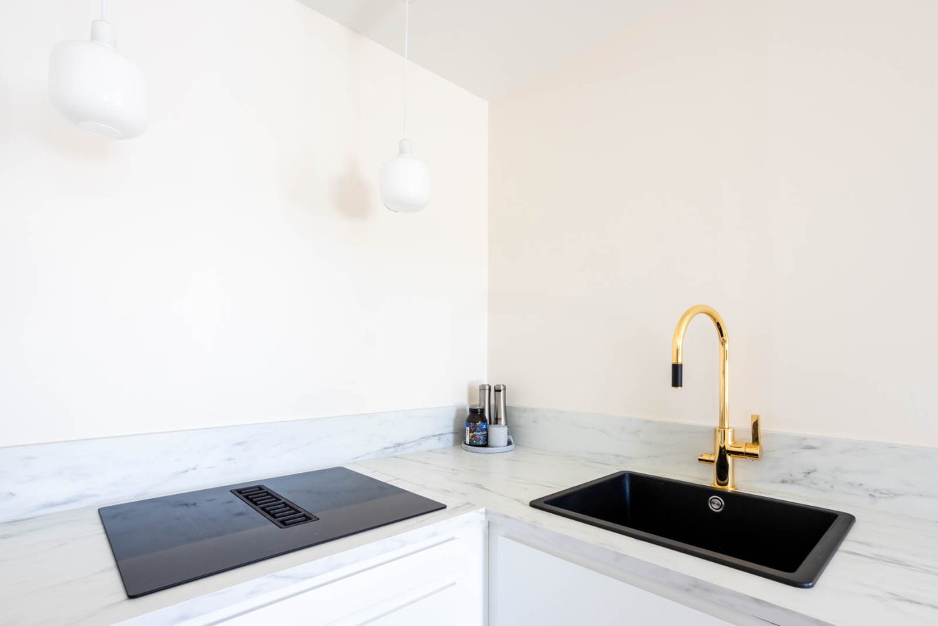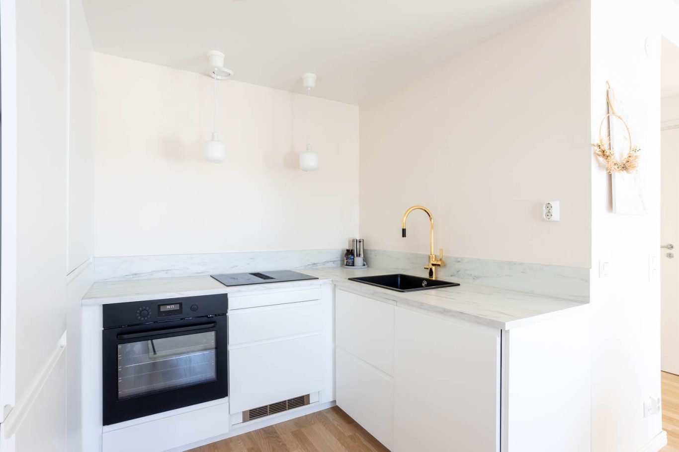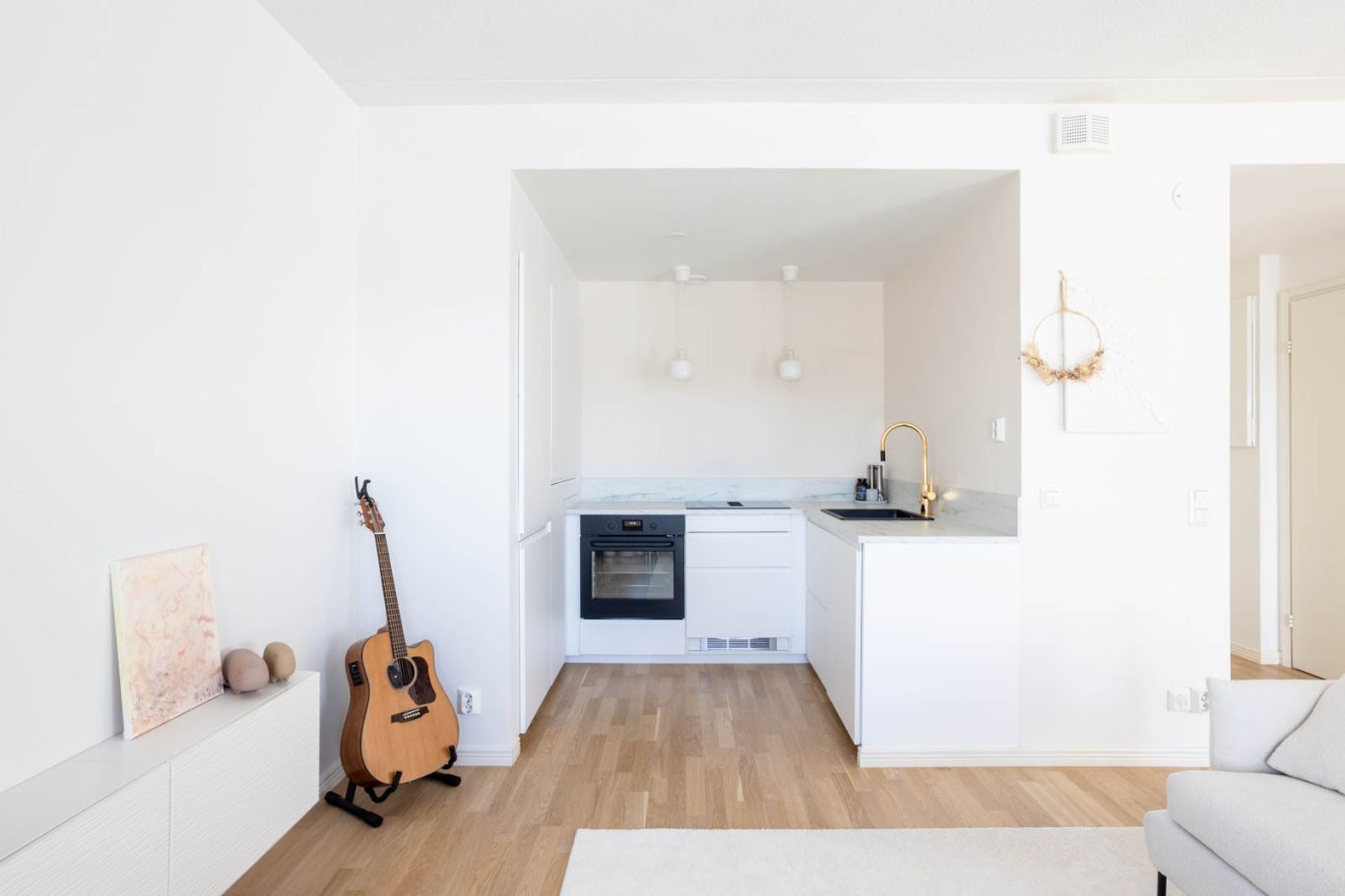 Avara valoisa olohuone yhdistyy saumattomasti täysin remontoituun keittiöön, jossa arjen luksusta lisää trendikäs aamiaiskaappi sekä tyylikkäät materiaalit.
