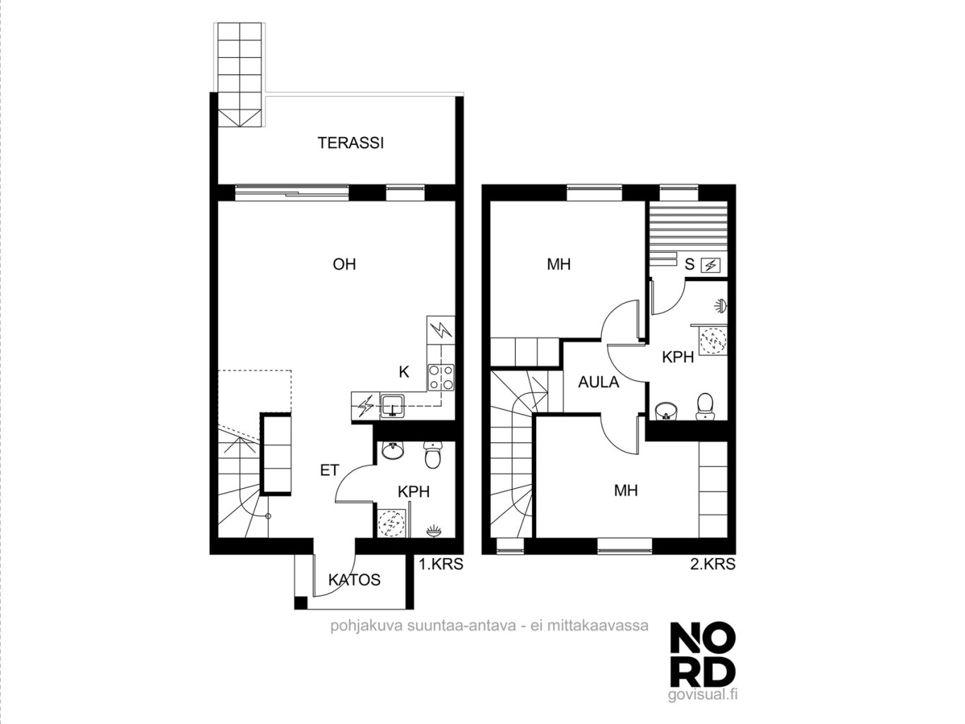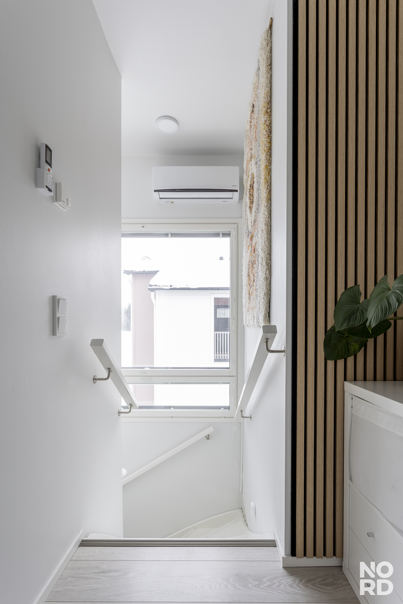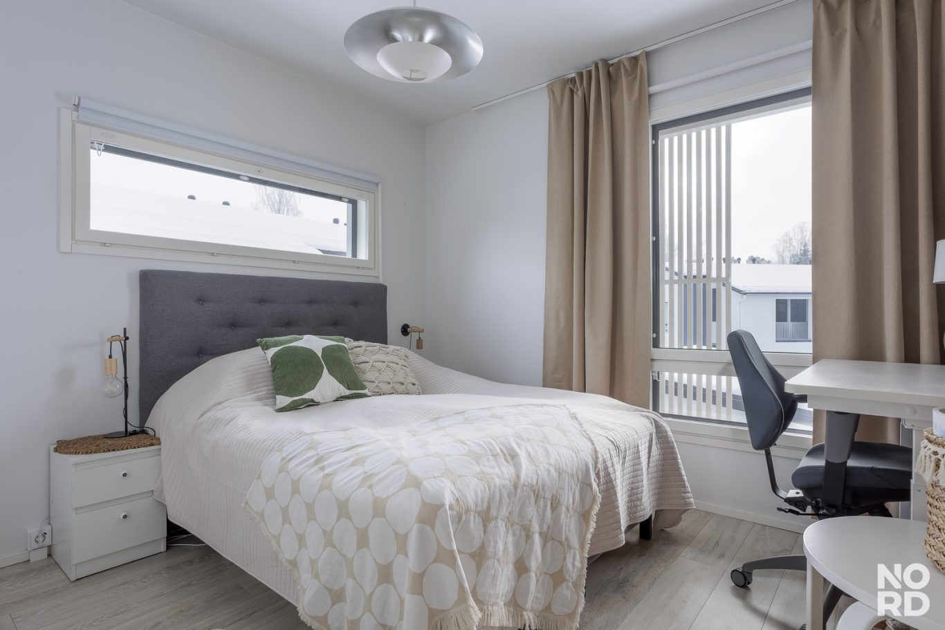 Huoneisto on kahdessa tasossa. Pohjaratkaisu on toimiva ja huoneet hyvänkokoisia.