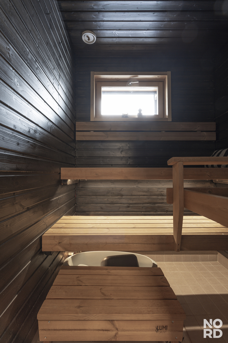 Yläkerrassa makkarit sekä sauna ja kylpyhuone.
