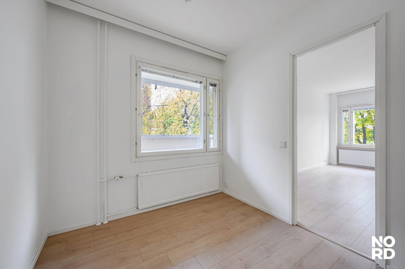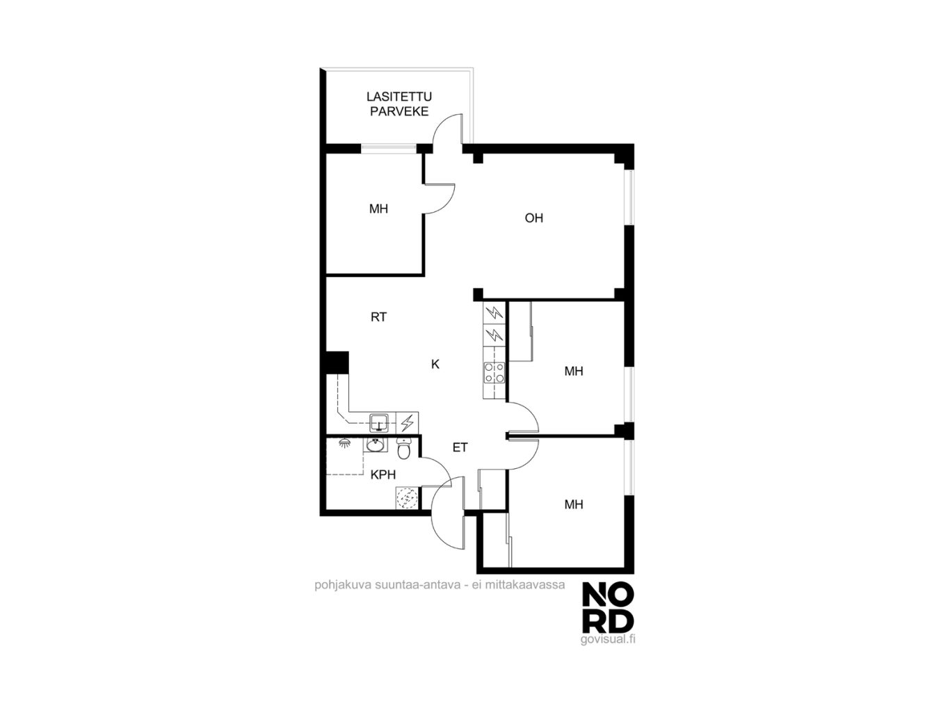 | Lisätietoja pinta-alasta | Huoneistoselitelmä on yhtiöjärjestyksen ja isännöitsijäntodistuksen mukaan 3h+k ja pinta-ala 75m². Asuntoon on muodostettu ikkunallinen lisähuone taloyhtiön valvomana osakasmuutostyönä vuonna 2025. Mainittu pinta-ala saattaa tämän ikäisessä kohteessa poiketa olennaisesti nykyisten mittaustapojen ja standardien mukaan laskettavasta pinta-alasta. Asunnon todellinen pinta-ala voi siten olla myynti-ilmoituksessa mainittua pinta-alaa merkittävästi pienempi tai suurempi. Kohteen pinta-ala ei ole tarkastusmitattu. |