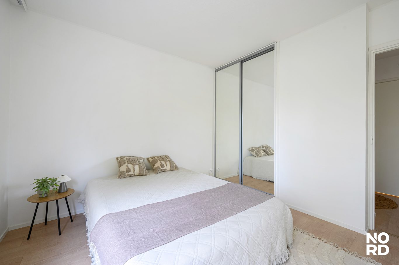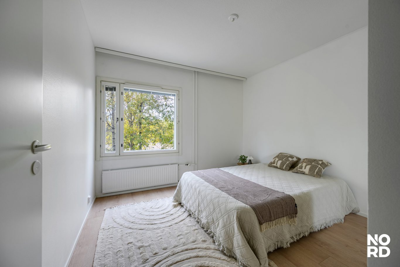 Päämakuuhuone on reilu niin nukkumiseen kuin etätyöskentelyynkin. Myös kaksi muuta makuuhuonetta ovat viihtyisiä. Asunnossa on kolmessa eri tilassa korkeita peililiukuovikomeroita vaatesäilytystä varten. Raikassävyinen kylpyhuone/wc on tilava. Siellä mahtuu niin peseytymään, kaunistautumaan kuin hoitamaan kotiaskareitakin.