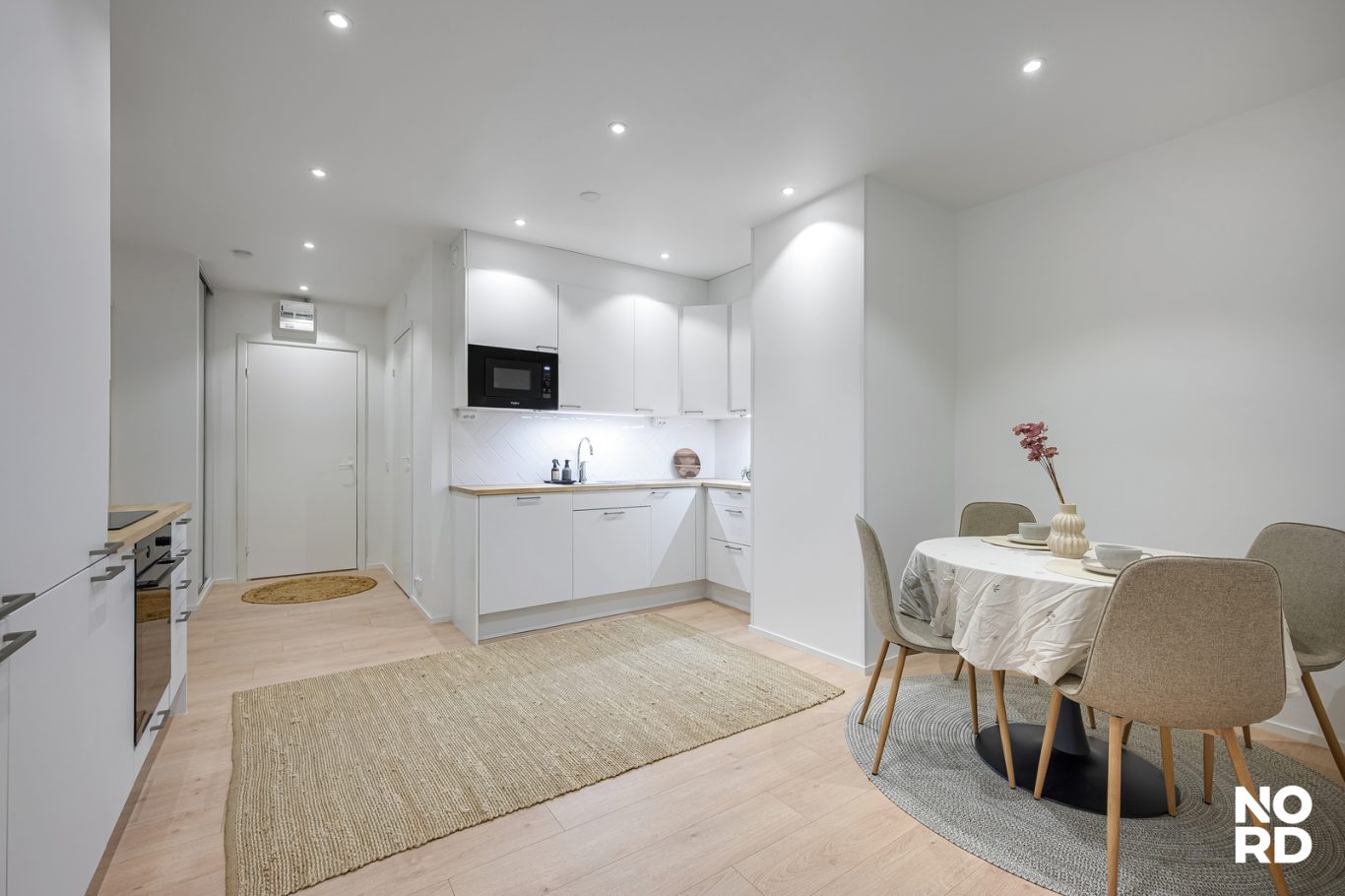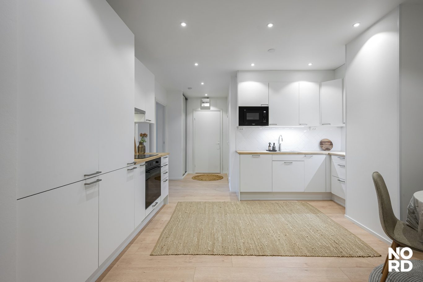 Asunnon keskiössä on hieno Parma-keittiö, joka on suunniteltu arkielämän käytännön tarpeet huomioon ottaen. Työskentely- ja säilytystilaa on hyvin. Tasot ovat massiivipuuta. Led-välitilavalaisimet ovat moderneja ja hipaisukytkimellä varusteltuja. Keittiössä on lisäksi hyvätasoinen yleisvalaistus useilla kiinteillä led-valoilla. Jääkaappi-pakastin on neliovinen ja iso. Keittiön ruokailutilaan mahtuu kuuden henkilön ruokailuryhmä ilman ahtauden tunnetta.