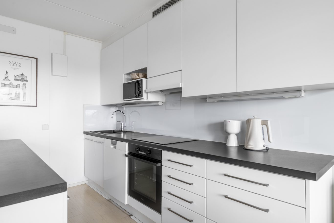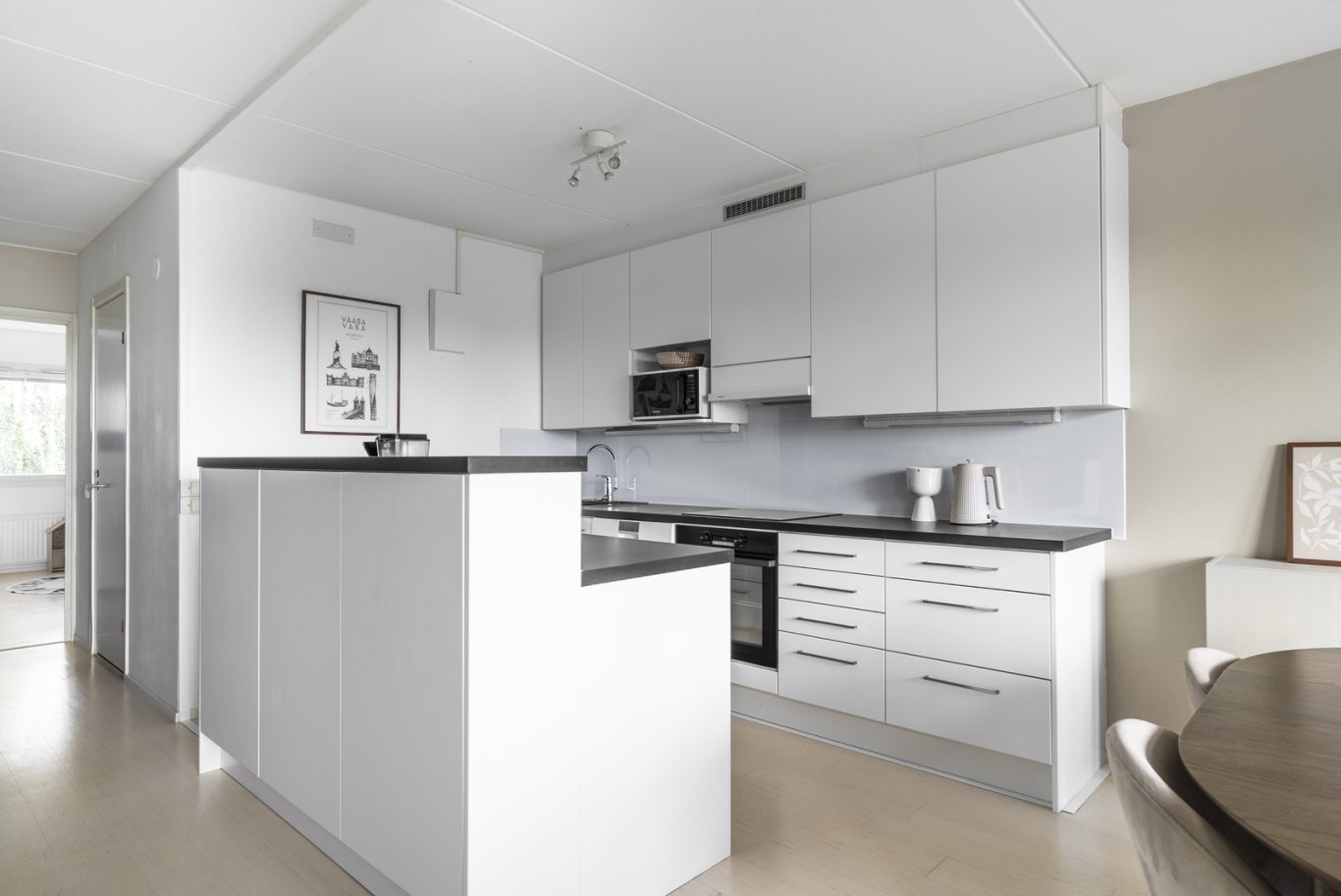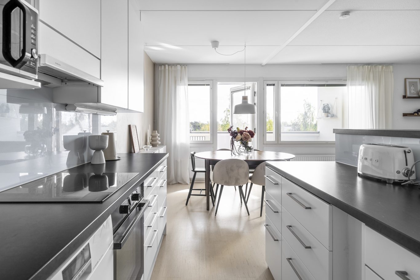 Asunnossa on käytännöllinen pohjaratkaisu: kaksi tilavaa makuuhuonetta, moderni ja tyylikäs keittiö sekä viihtyisä olohuone. Koko asunto on tyylikkäästi remontoitu laadukkailla materiaaleilla, ja vaaleat pinnat tuovat valoisuutta sekä avaruuden tuntua.