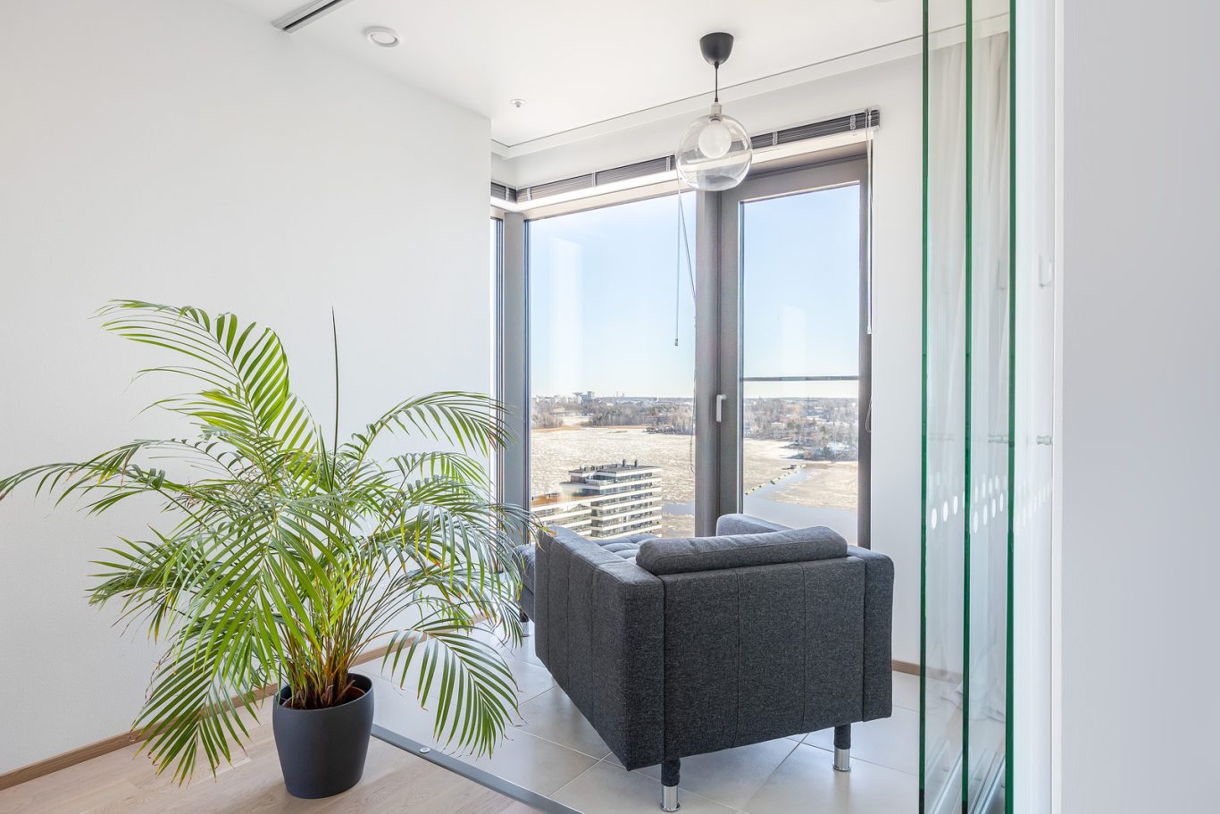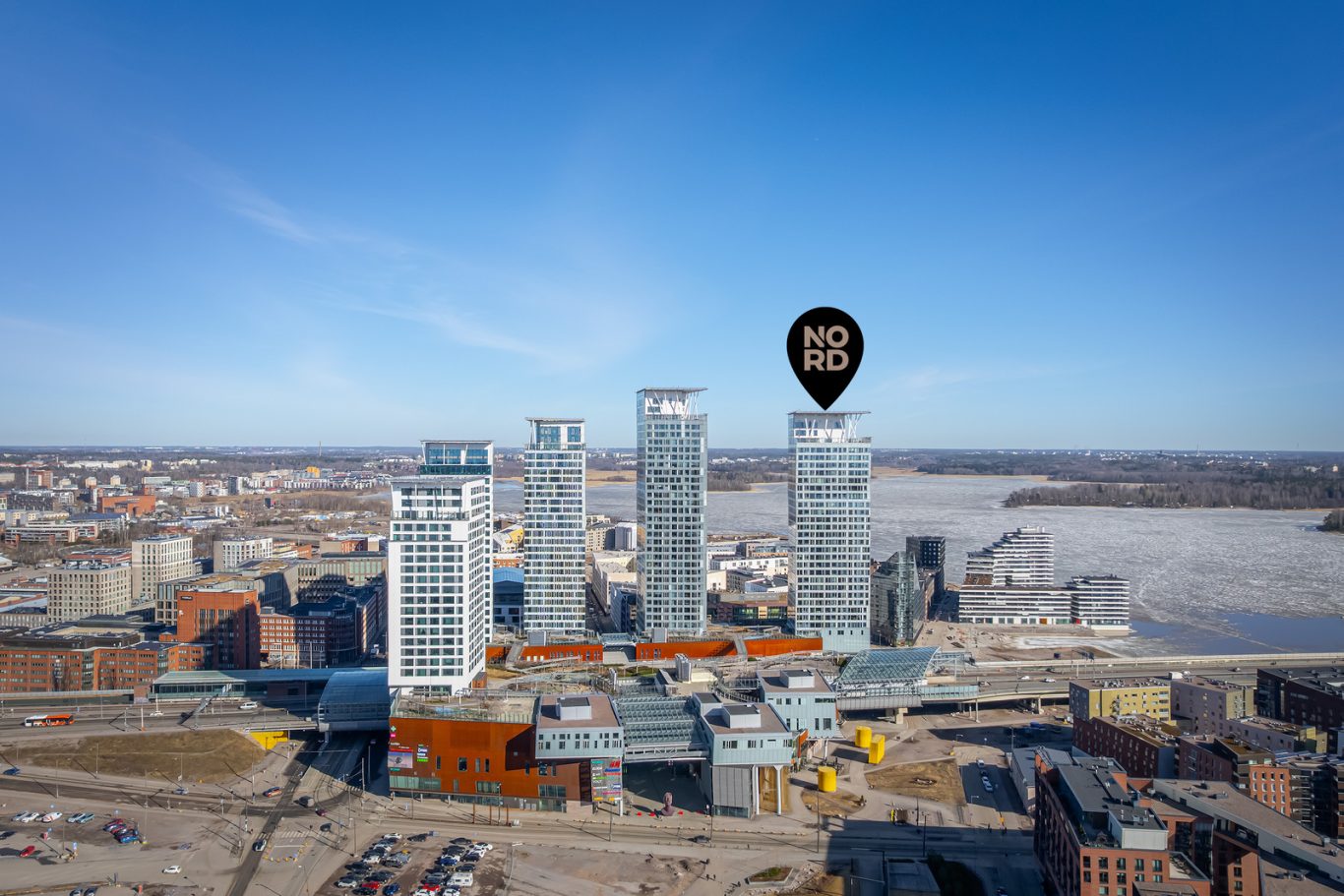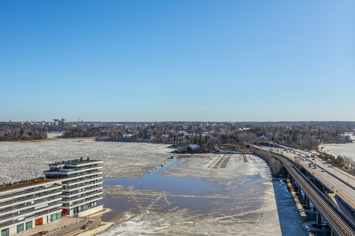 Kenties yksi talon parhaista kaksion pohjaratkaisuista, naapureiden kanssa yhteistä seinää vain pieni pätkä! 13. kerroksen hyväkuntoinen koti laadukkailla materiaaleilla. Novartin harmoninen keittiö AEG:n kodinkoneilla, moderni kylpyhuone sadesuihkulla, hyvänkokoinen olohuone sekä tyylikkäillä lasiliukuovilla jaettu makuuhuone. Säilytystilaa vaatehuoneessa, eteisen kaapistoissa sekä huoneistokohtaisessa irtaimistovarastossa.