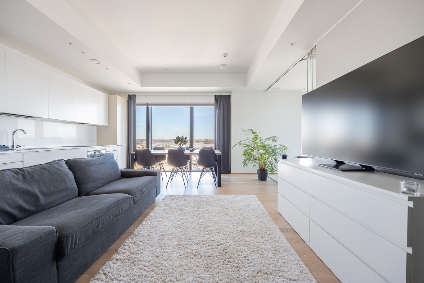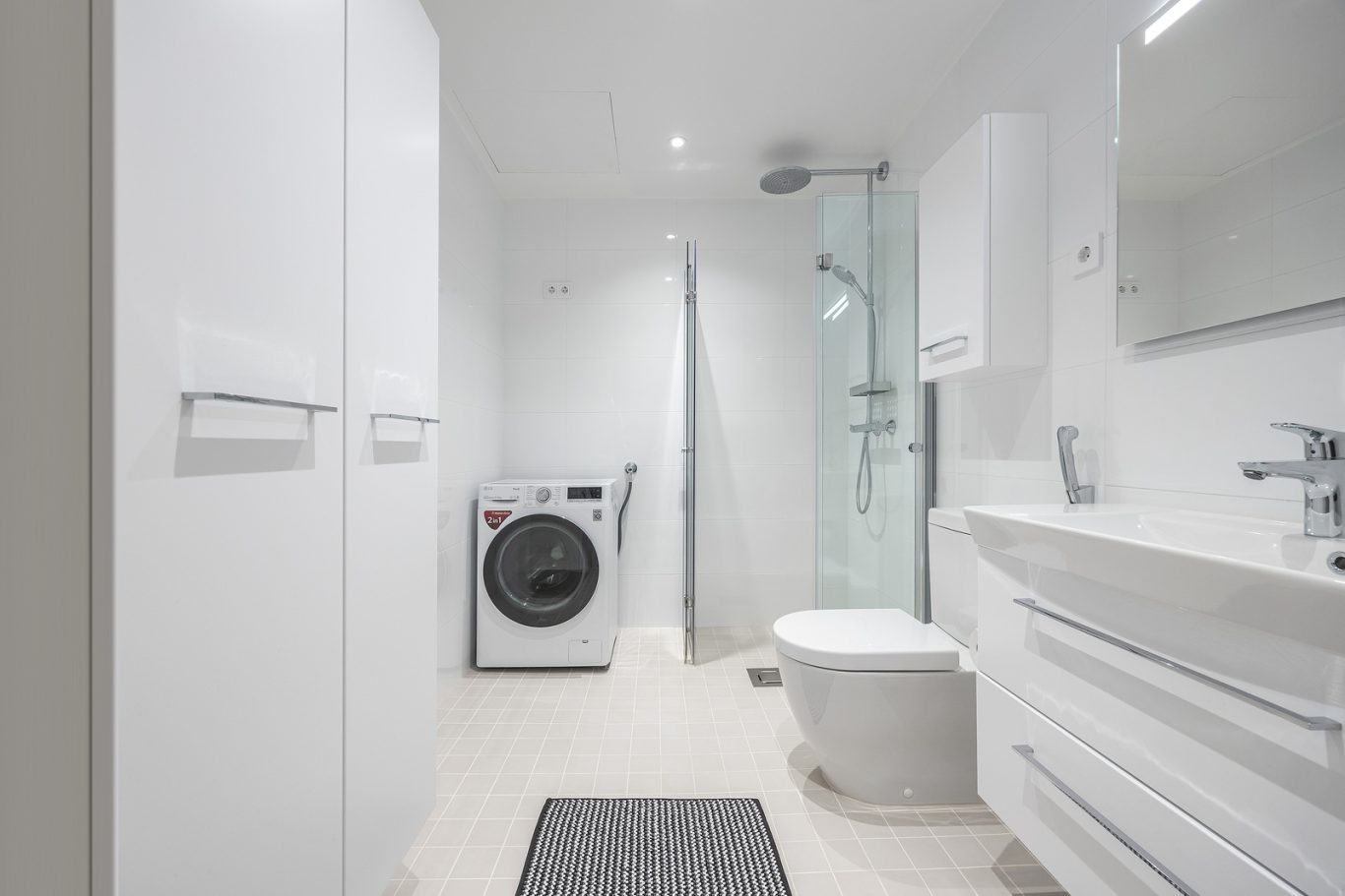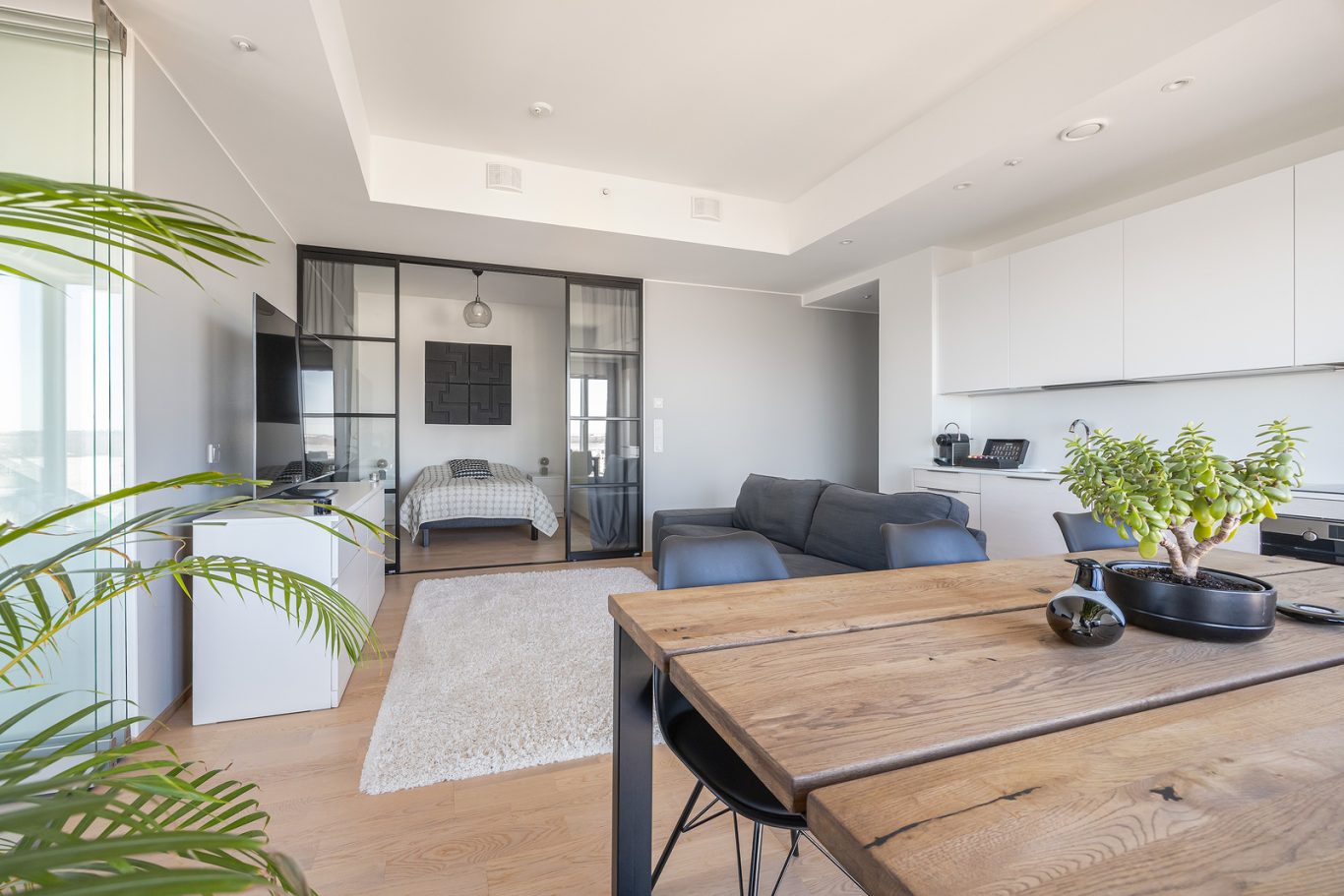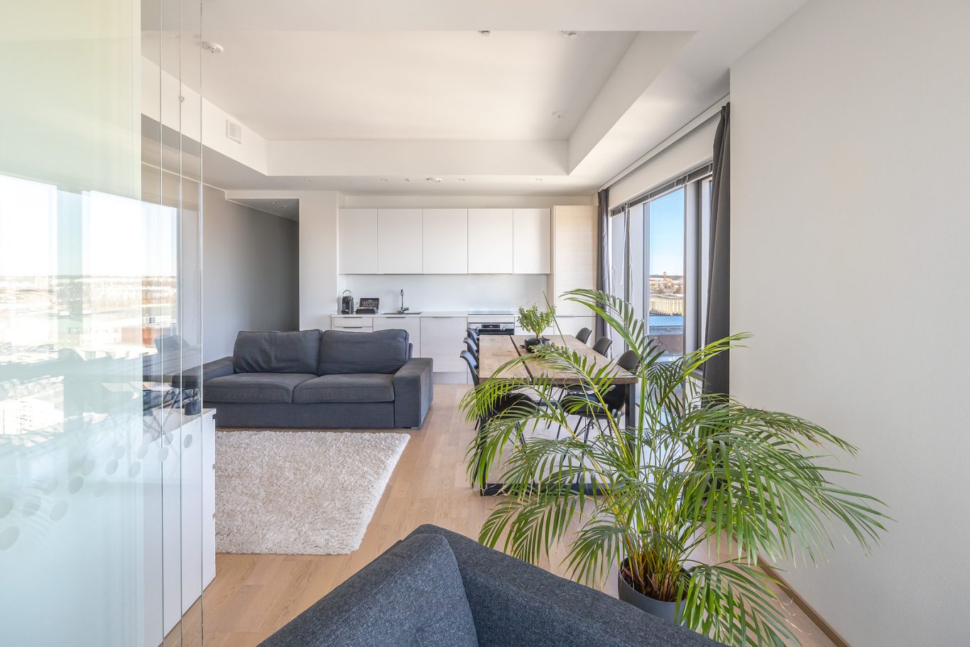 Kenties yksi talon parhaista kaksion pohjaratkaisuista, naapureiden kanssa yhteistä seinää vain pieni pätkä! 13. kerroksen hyväkuntoinen koti laadukkailla materiaaleilla. Novartin harmoninen keittiö AEG:n kodinkoneilla, moderni kylpyhuone sadesuihkulla, hyvänkokoinen olohuone sekä tyylikkäillä lasiliukuovilla jaettu makuuhuone. Säilytystilaa vaatehuoneessa, eteisen kaapistoissa sekä huoneistokohtaisessa irtaimistovarastossa.