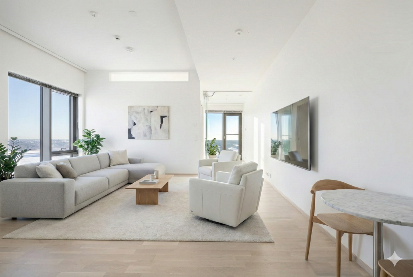 Hyväpohjainen kulmahuoneisto, josta löytyy kaikki tarpeellinen isoista ikkunoista vesikiertoiseen lattialämmitykseen sekä viilennykseen. Modernit materiaalivalinnat, jotka sopivat sisustukseen kuin sisustukseen. Asunnossa hyvänkokoiset makuuhuoneet, toimiva avokeittiö + olohuone sekä viherhuone joka soveltuu erinomaisesti esim. työhuoneeksi.