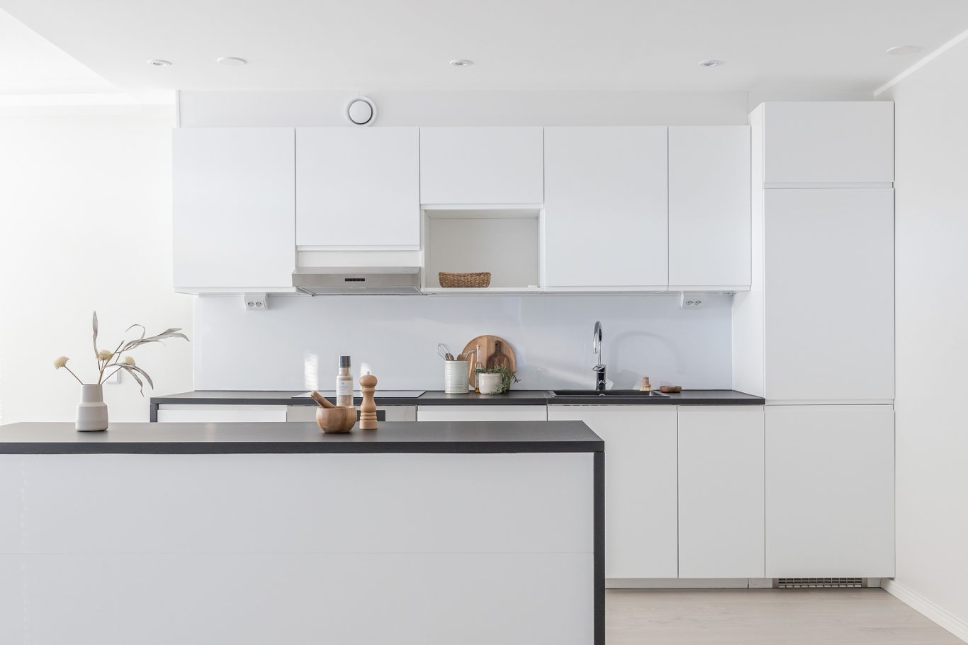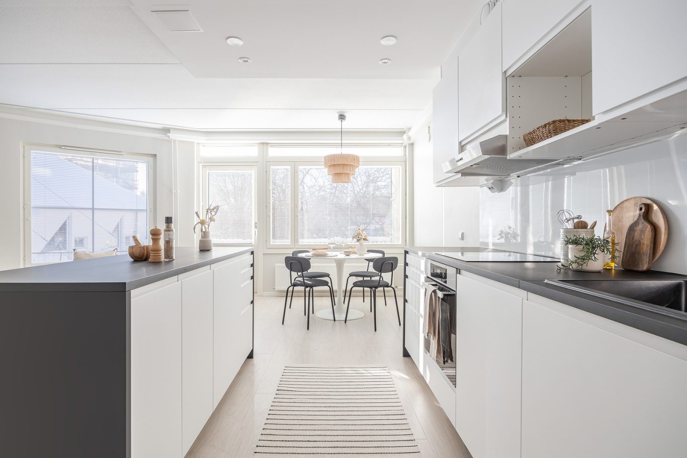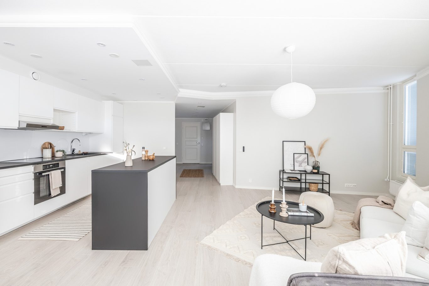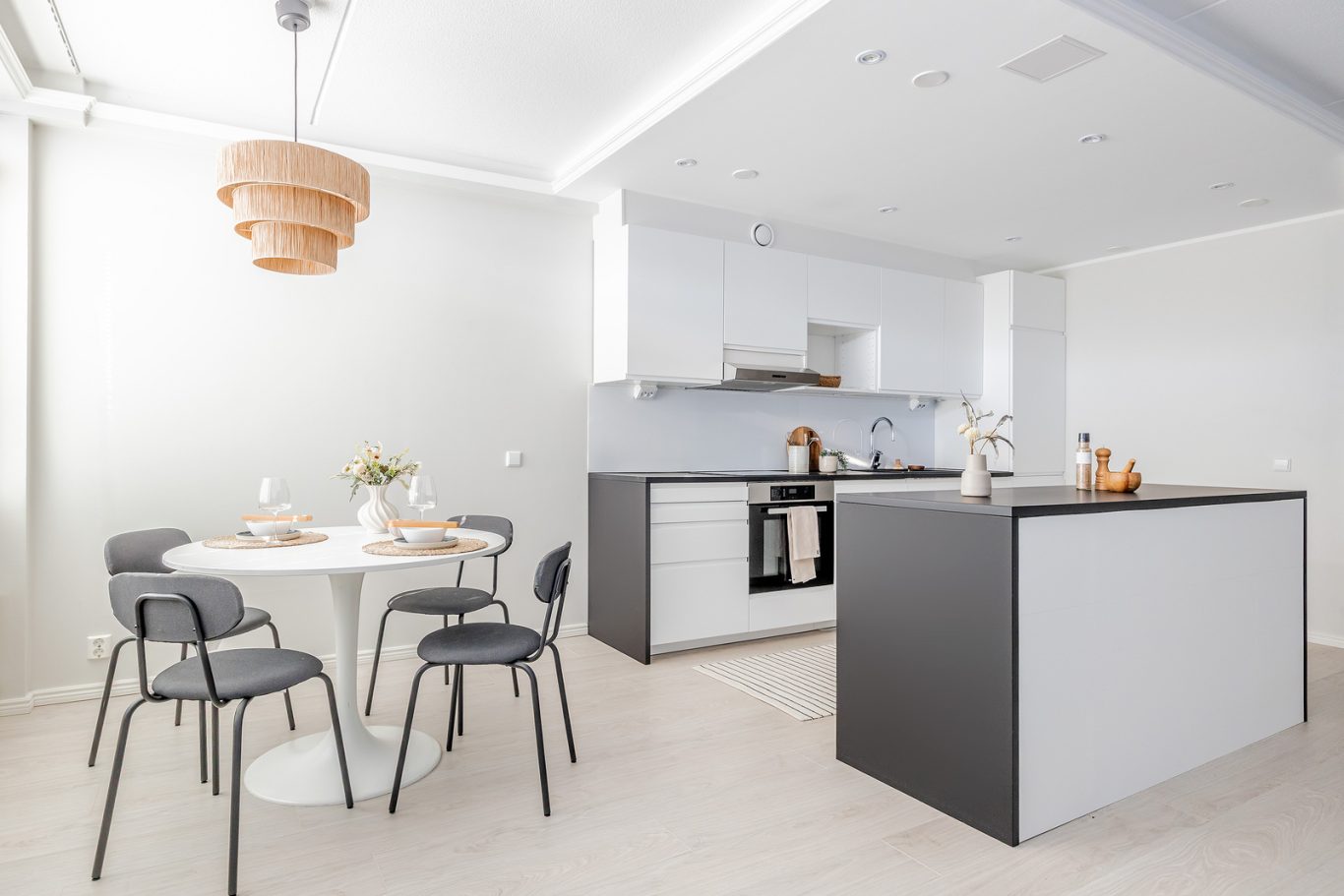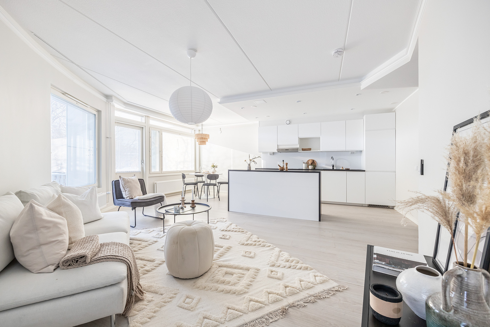 Kaunis saarekkeellinen avokeittiö valoisan olohuoneen ja ruokailutilan yhteydessä.