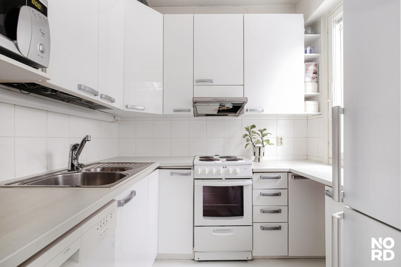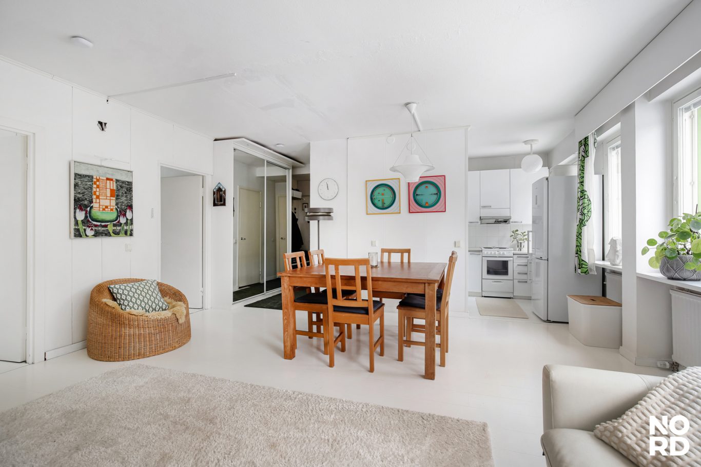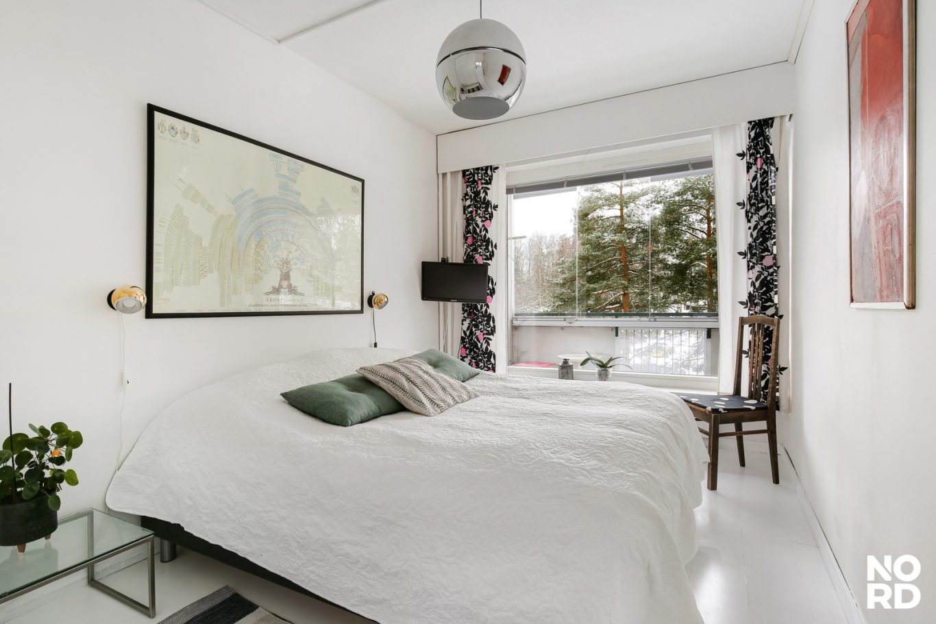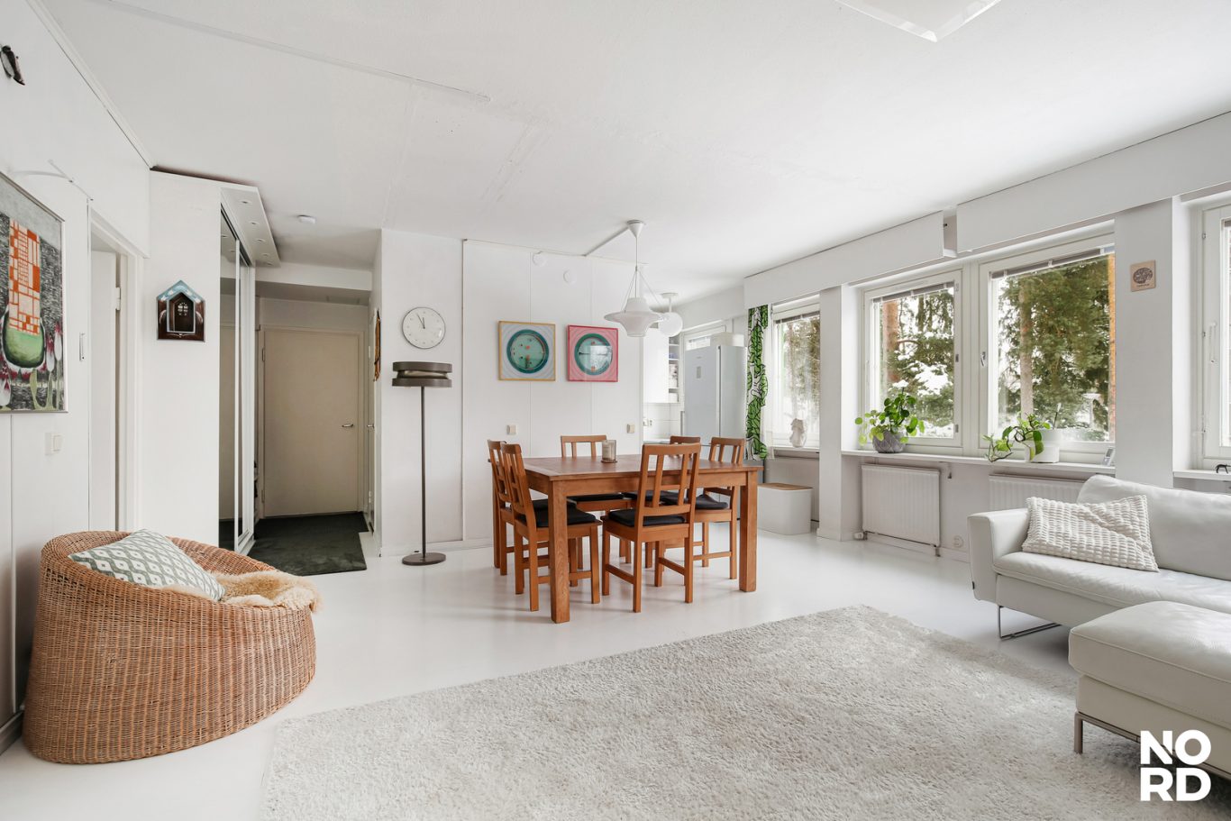 Tämä tyylikäs asunto on kauniin valkoinen ja ympärivuotisesti valoisa. Olohuone-ruokailutila on suurta yhtenäistä tilaa ja näkymät monista ikkunoista ovat vehreään männikköön. Mittasuhteet kalustamiselle ovat hyvät. Tilaan mahtuu reilun kokoiset olohuoneen kalusteet ja iso ruokailuryhmä. Keittiössä on tilaa tarpeellisille toiminnoille ja säilytykselle.