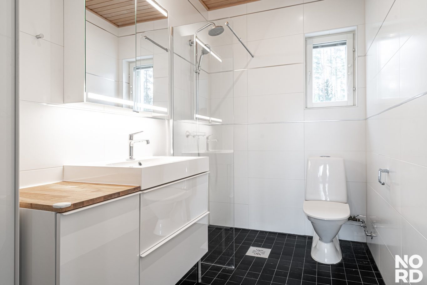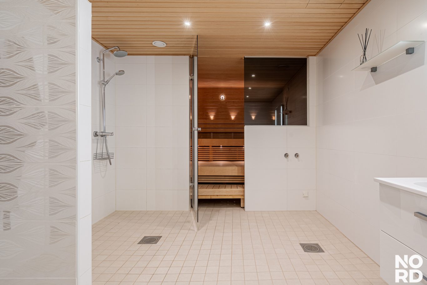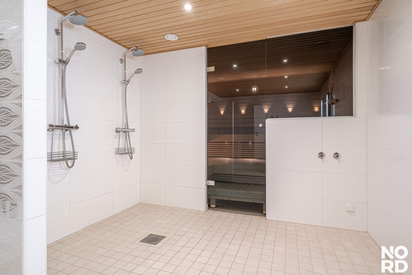 Alakerrasta löytyvät saunaosasto kahdella sadesuihkulla, kodinhoitohuone kurapisteineen, vaatehuone, tilava tyylikäs aula ja suuri makuuhuone, joka soveltuu erinomaisesti myös työtilaksi.