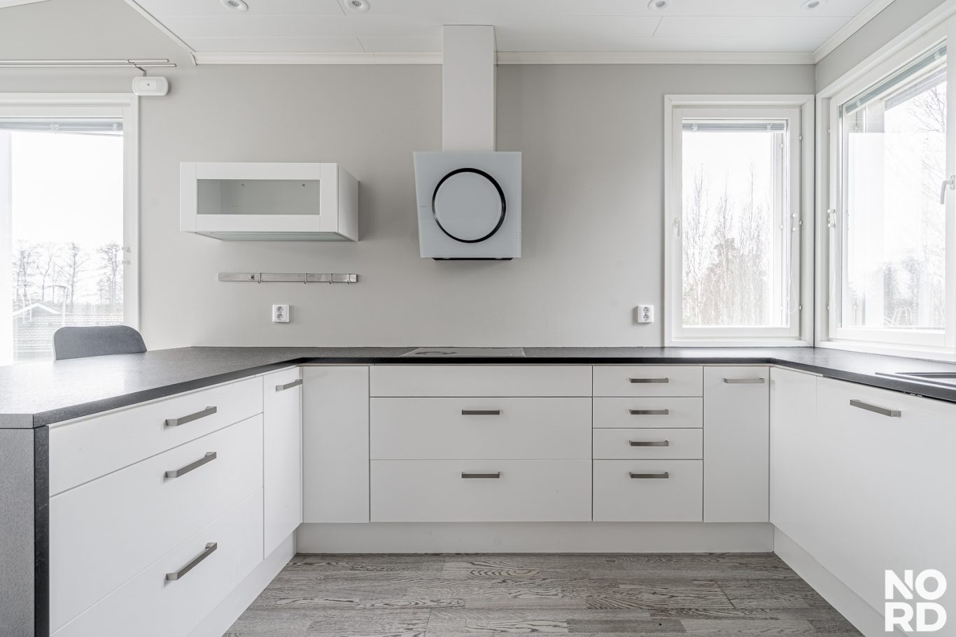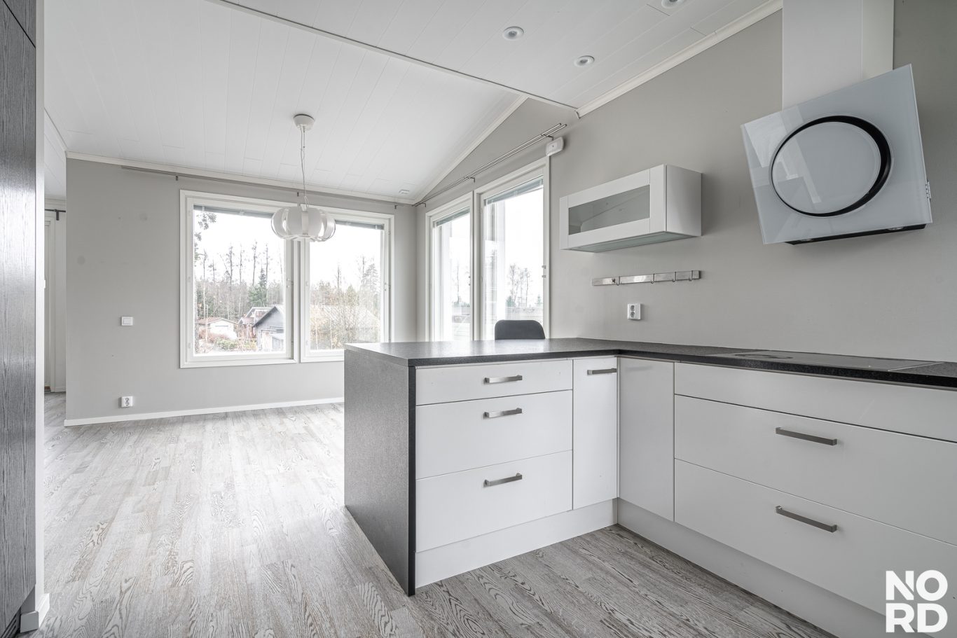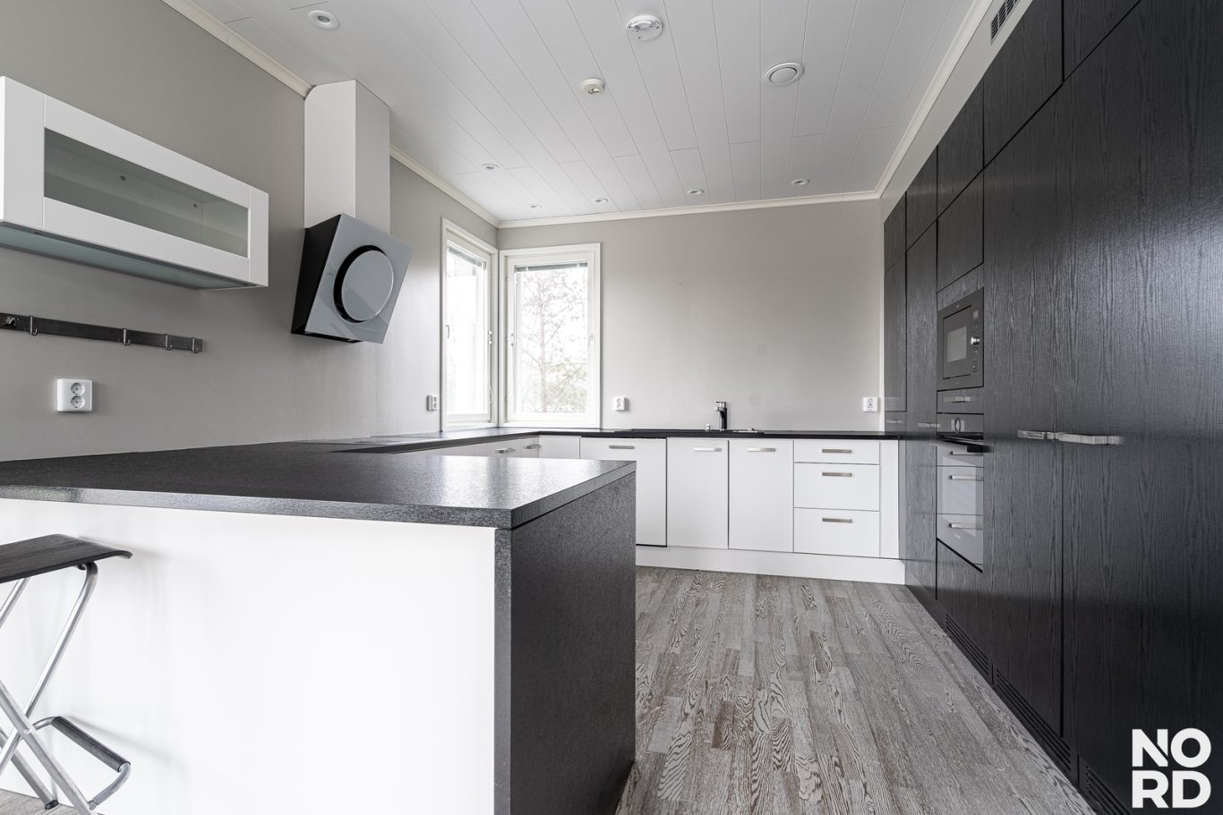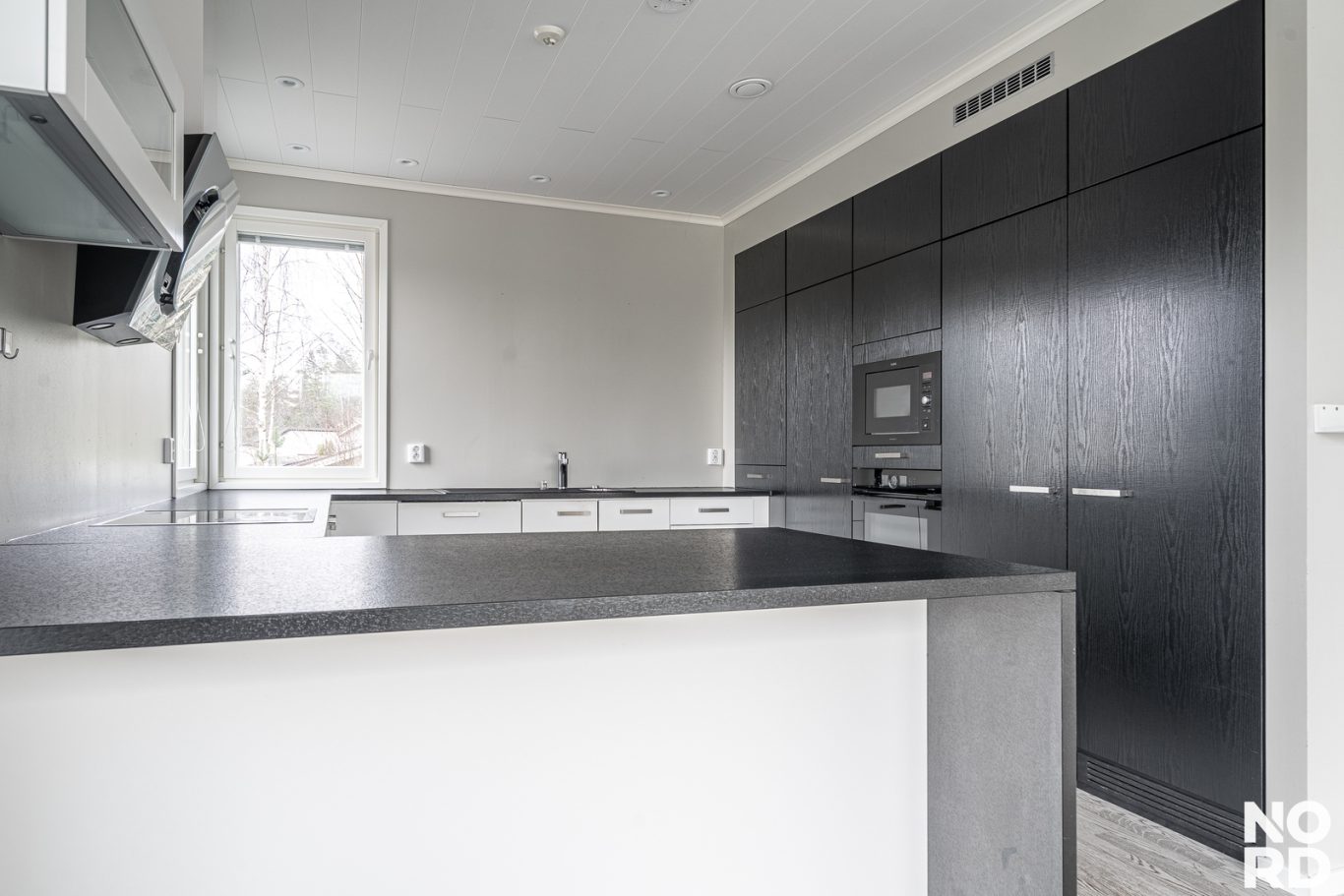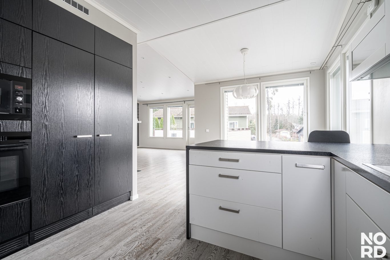 Keittiö on suunniteltu sekä estetiikka että käytännöllisyys mielessä. Tummasävyiset kalusteet, laadukkaat kodinkoneet ja saareke luovat harmonisen ja toimivan kokonaisuuden. Yläkerrasta löytyy myös kolme kivan kokoista makuuhuonetta ja kodin toinen kylpyhuone .