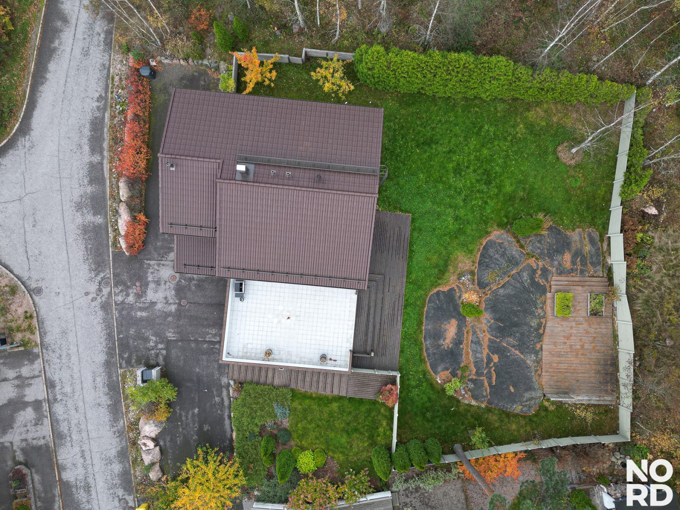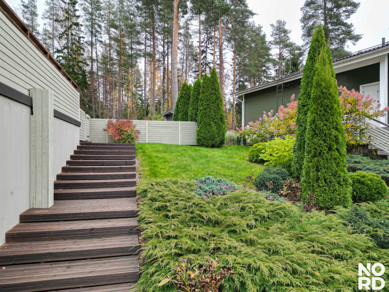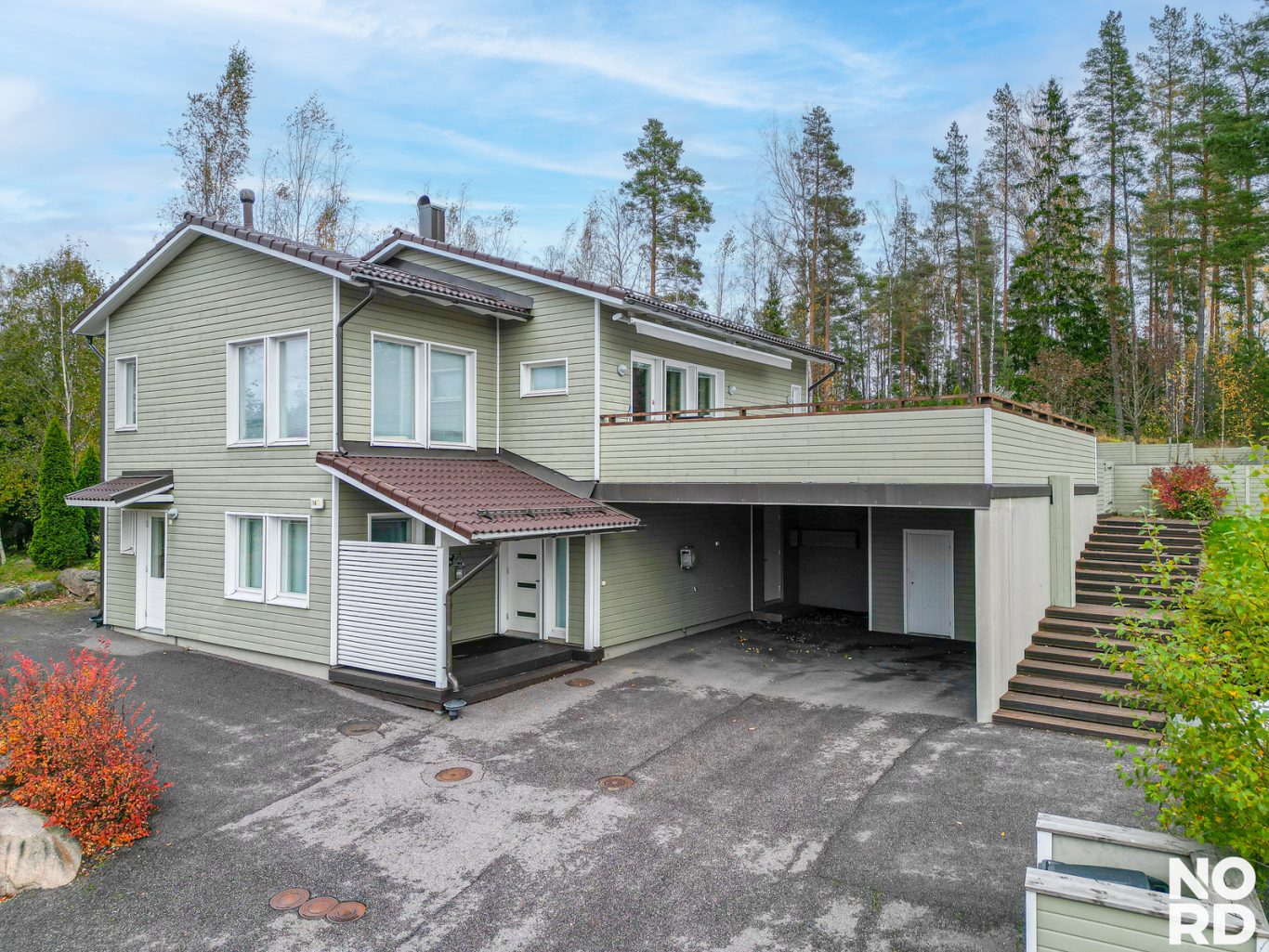 Vehreä metsään rajautuva rinnetontti on viimeistelty ja helppohoitoinen. Takapihalla on näyttävä patio sekä aurinkoinen laatoitettu aurinkoterassi, joka jatkaa kodin tiloja luontevasti ulos. Pihassa on ihastuttavia istutuksia, asfaltointi, autokatos ja lämmin varasto.