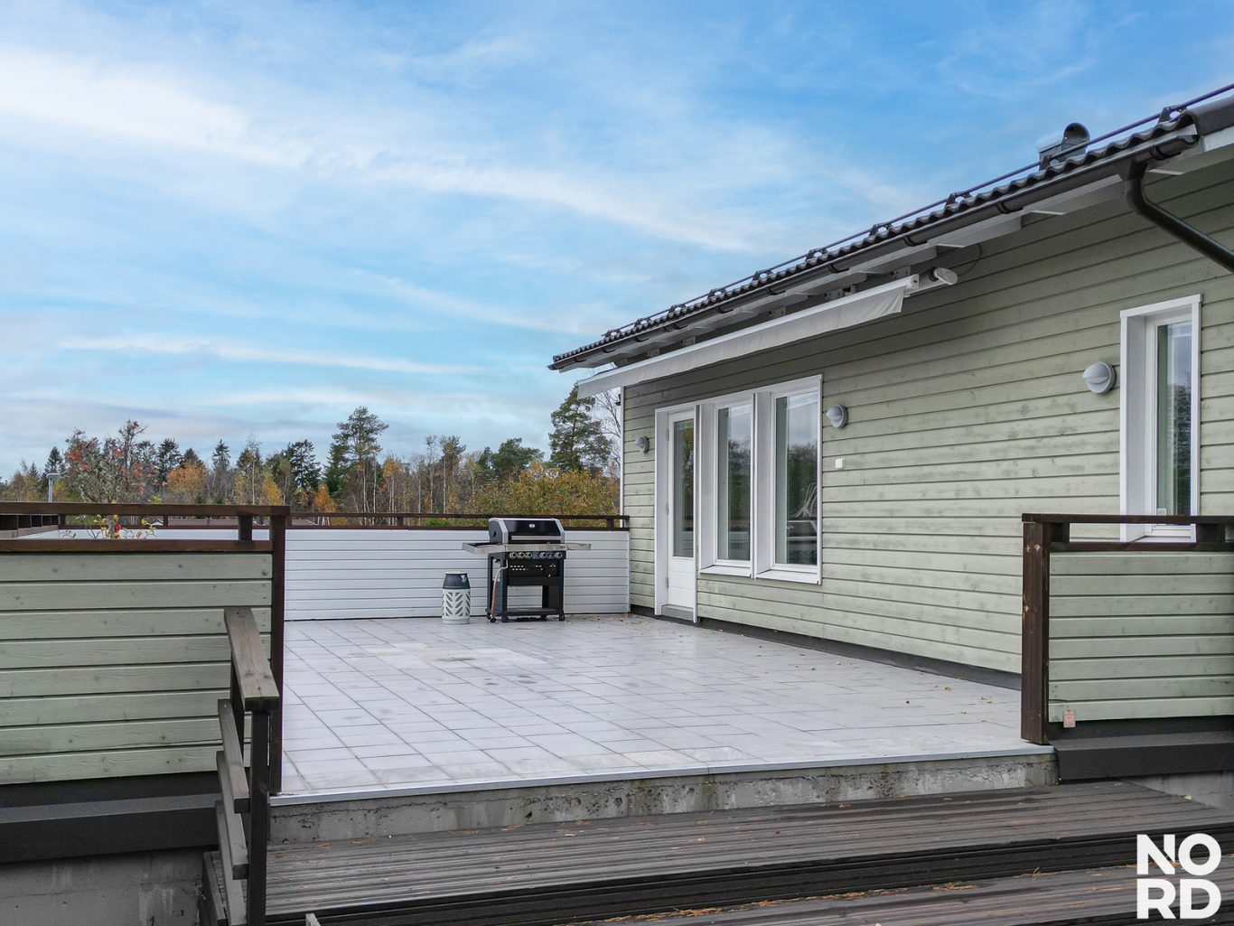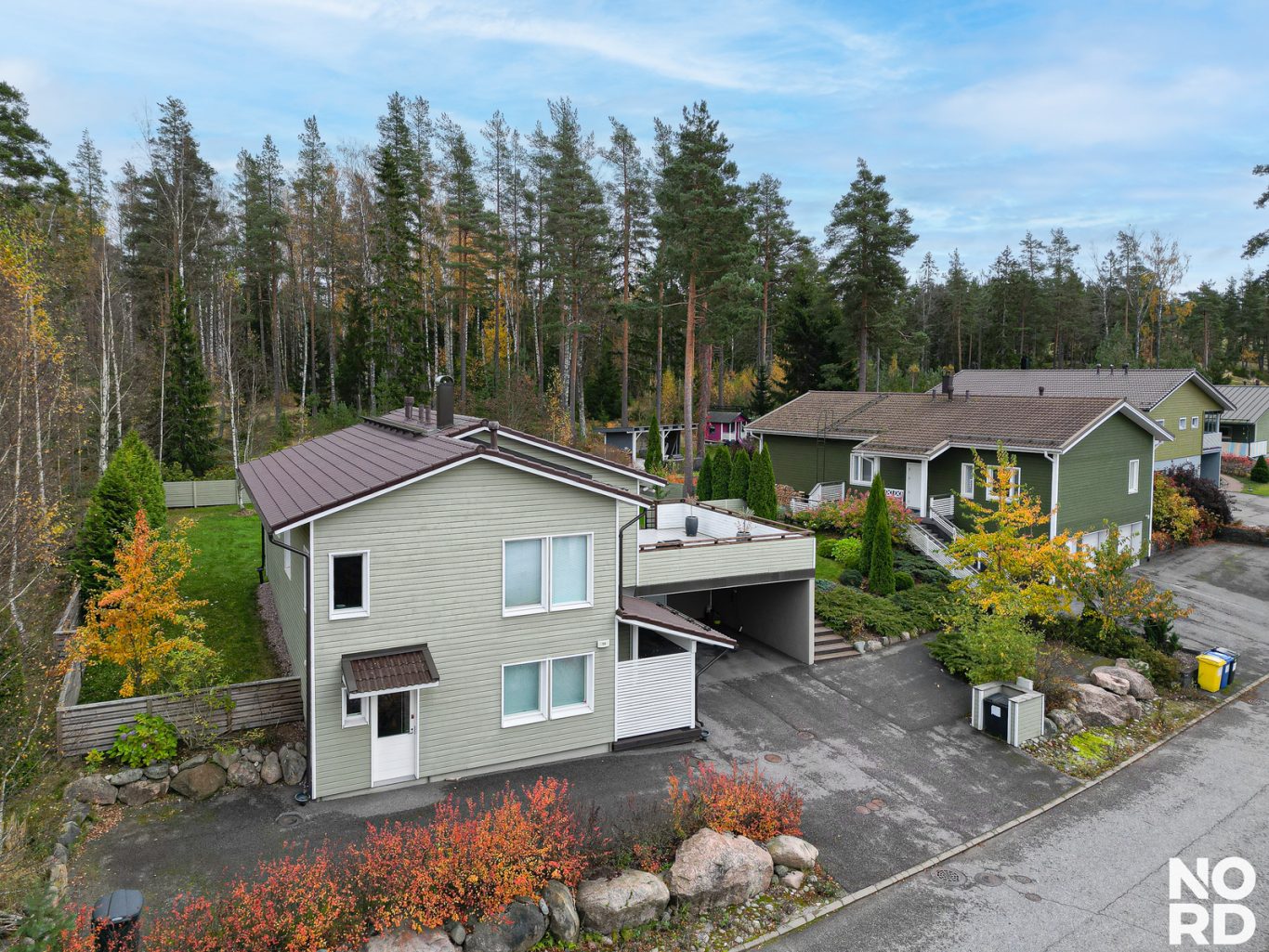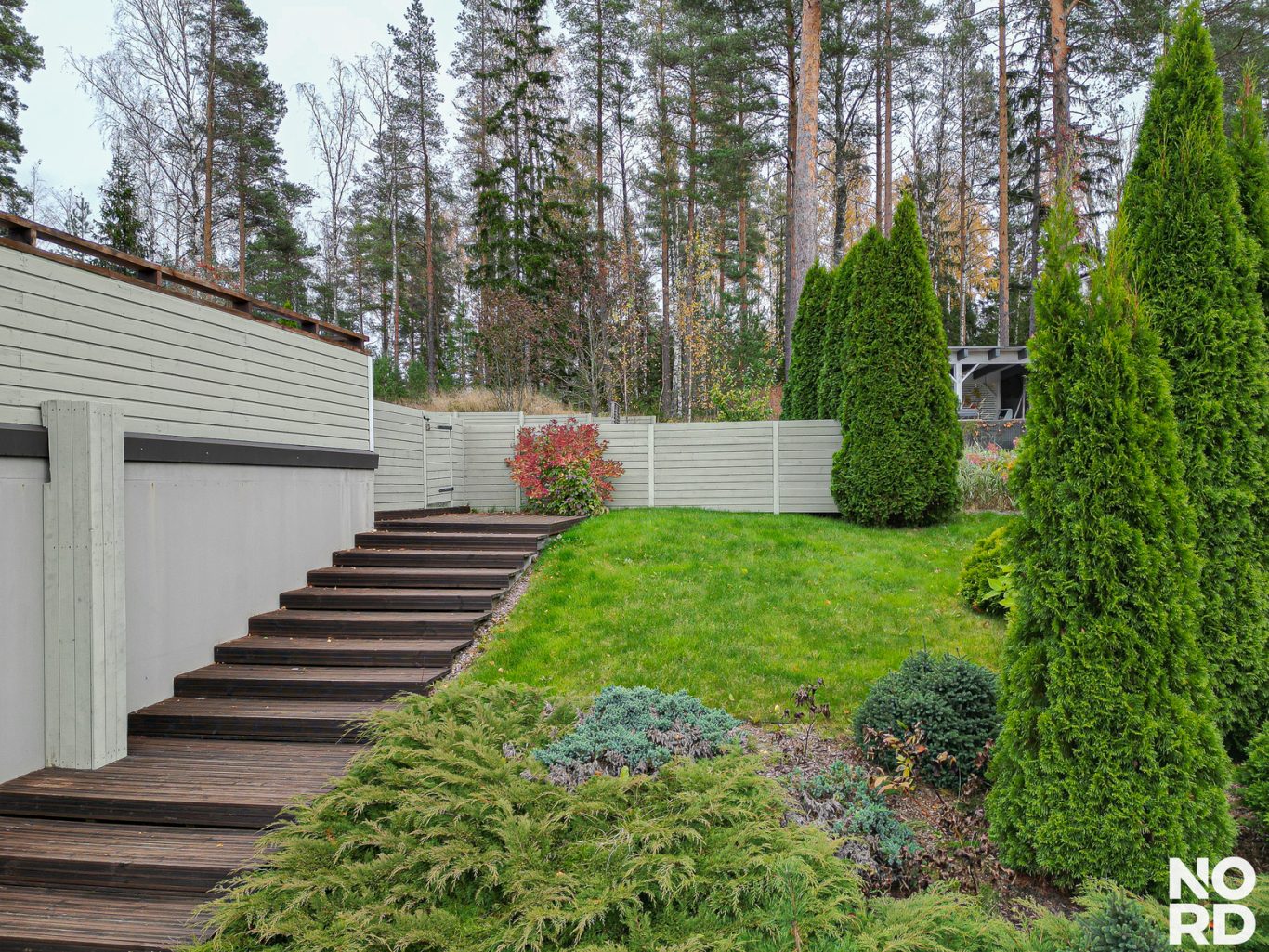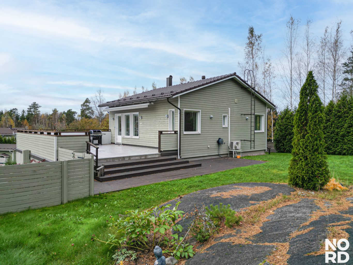 Vehreä metsään rajautuva rinnetontti on viimeistelty ja helppohoitoinen. Takapihalla on näyttävä patio sekä aurinkoinen laatoitettu aurinkoterassi, joka jatkaa kodin tiloja luontevasti ulos. Pihassa on ihastuttavia istutuksia, asfaltointi, autokatos ja lämmin varasto.