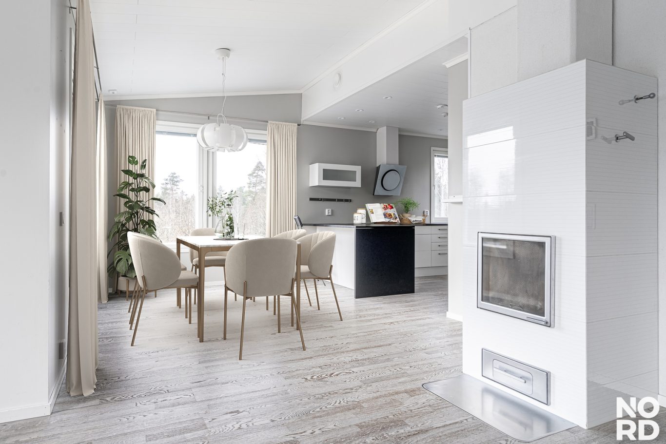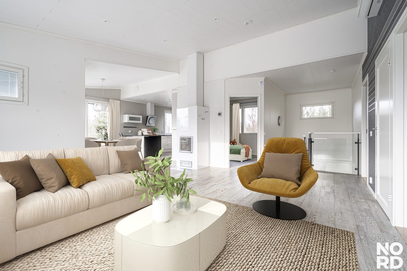 Kodin sydän on avara olohuone, jossa luonnonvalo tulvii sisään suurista ikkunoista ja tunnelmaa luo varaava takka. Olohuone yhdistyy saumattomasti tyylikkääseen avokeittiöön ja ruokailutilaan, josta on käynti suurelle, aurinkoiselle terassille täydellinen paikka kesäpäivien viettoon ja yhteisiin hetkiin perheen ja ystävien kanssa.