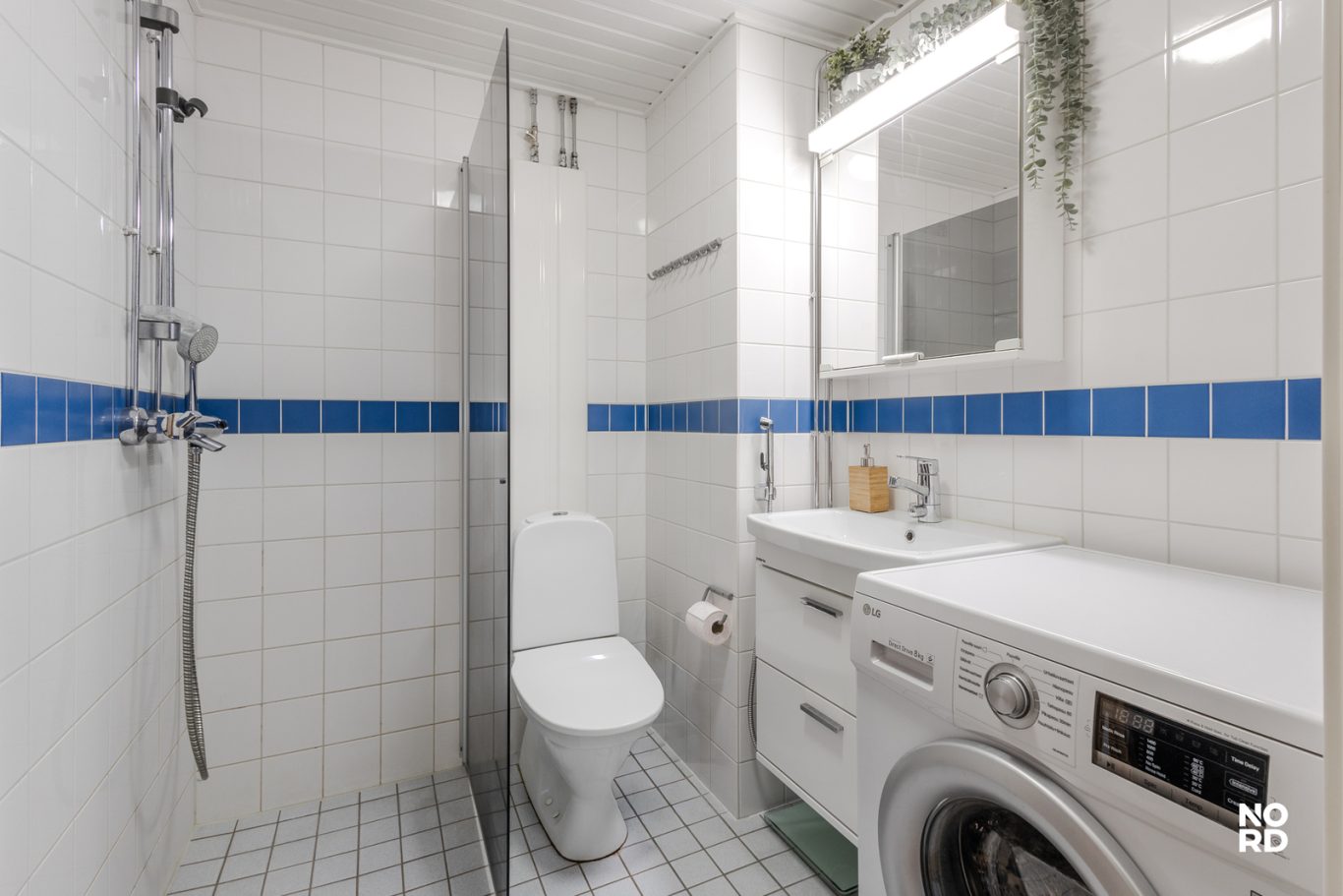 Kylpyhuoneeseen mahtuu hyvin pesukone ja tässä kodissa on oma sauna.