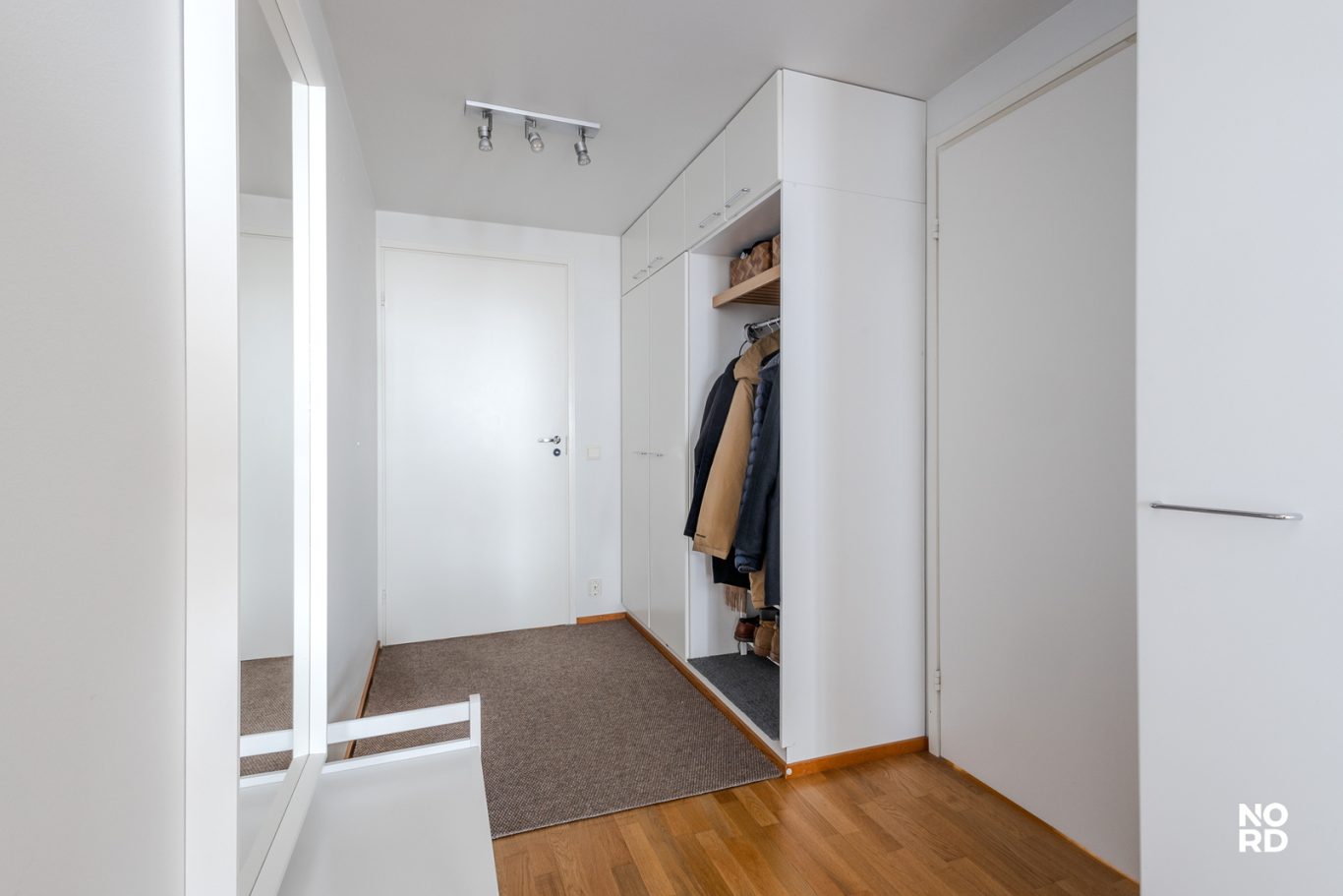 Leveässä eteisessä on paljon kaappitilaa.