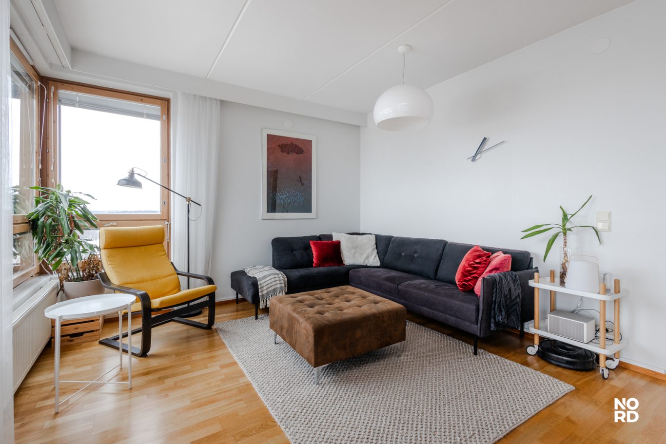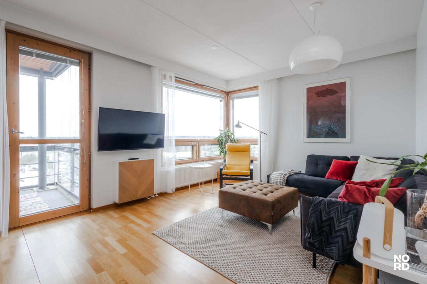 Olohuone on valoisa ja tilava, luonnonvaloa tulvii upeiden näkymien lisäksi myös kulmaikkunasta.