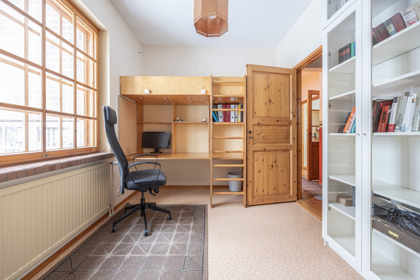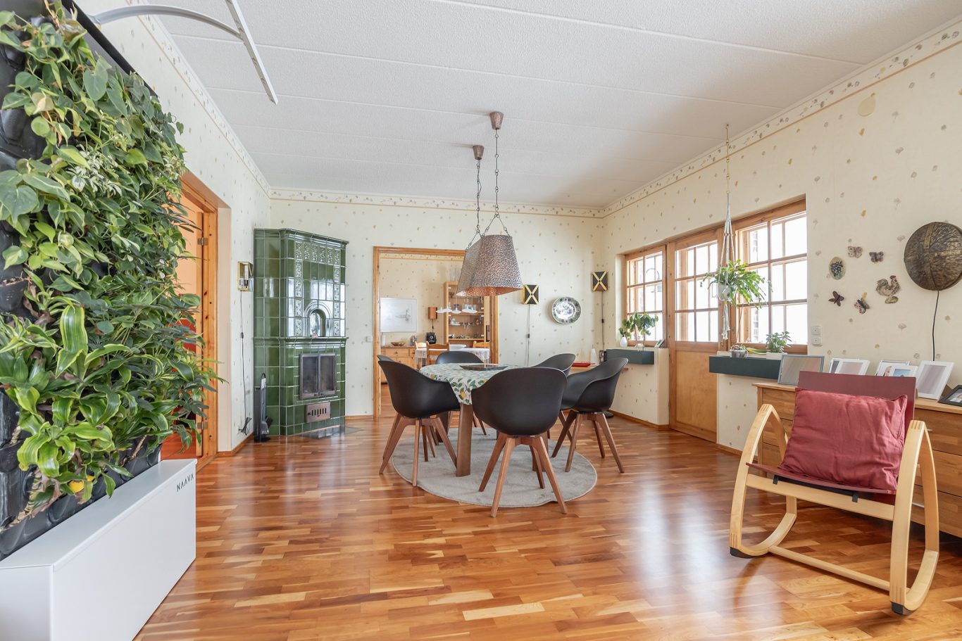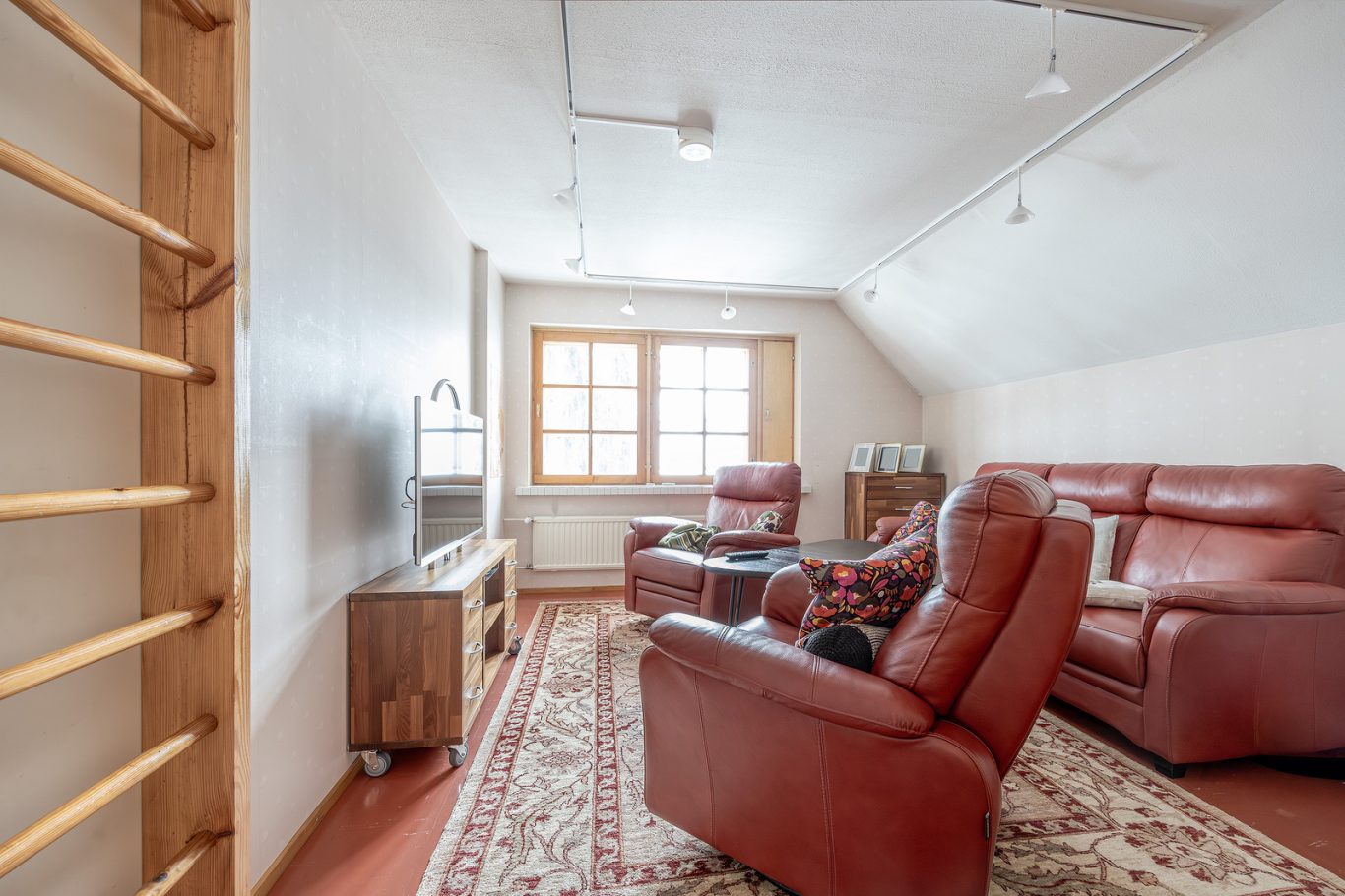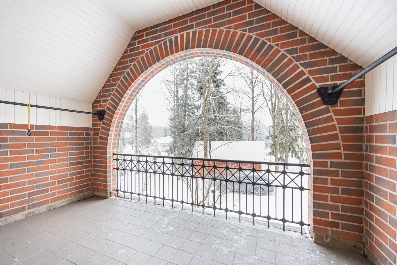 | Tilojen kuvaus | Alakerrassa: Tilava harraste/kuntoiluhuone, takkahuone, kodinhoitohuone, kylmäkellari ja varasto, tekninen tila. Keskikerroksessa: Iso ikkunallinen sisääntulokuisti, lasitettu terassi. Yläkerrassa: 2 kpl parveke. Käyttöullakolla: Kolme erillistä käyttöullakko tilaa, joissa linoleumlattia. |
