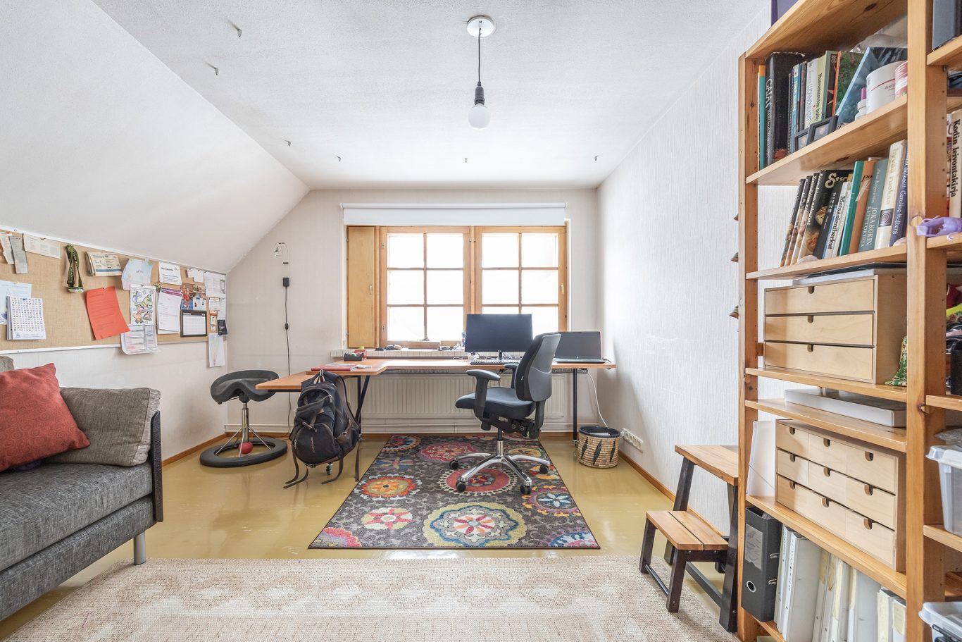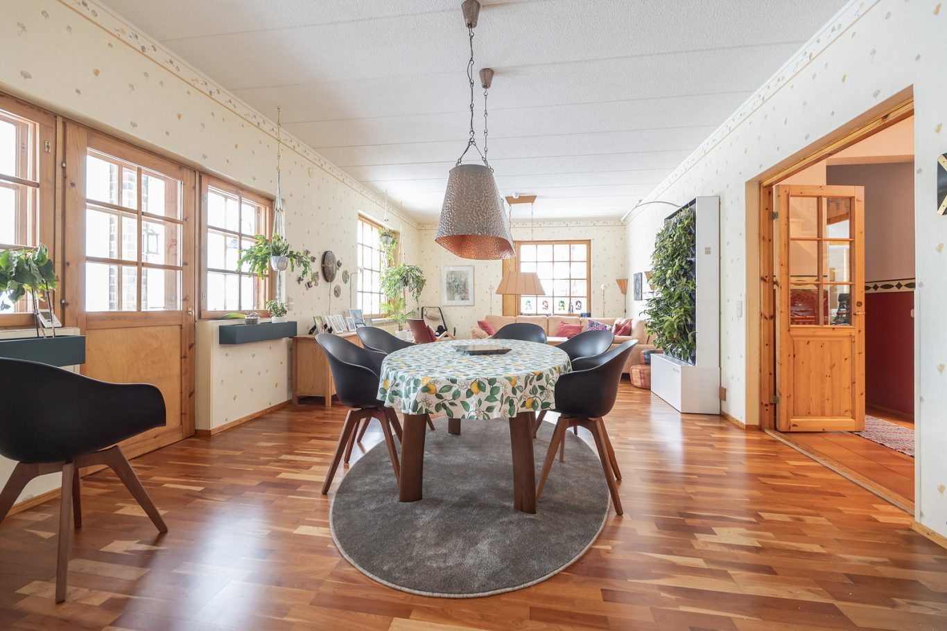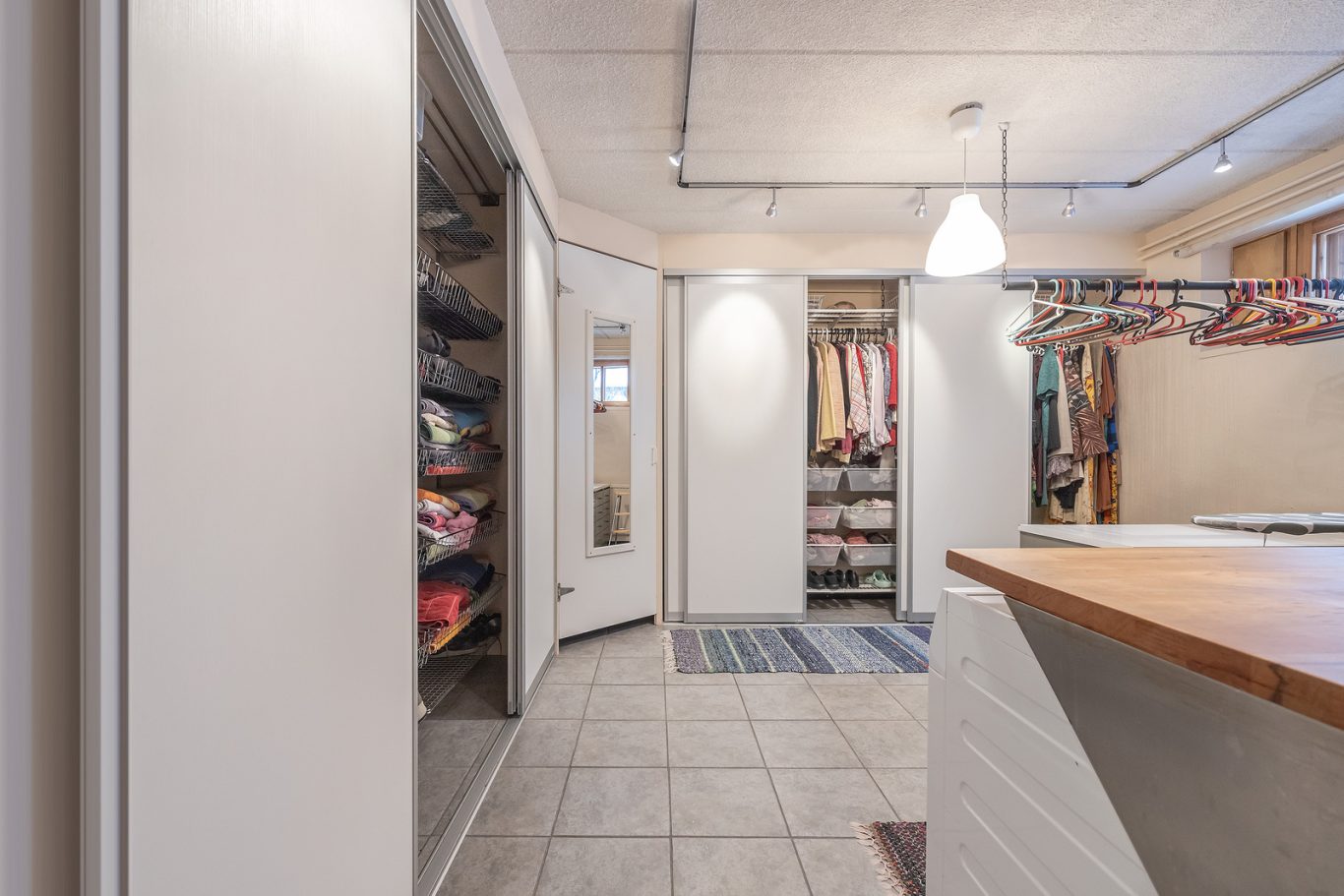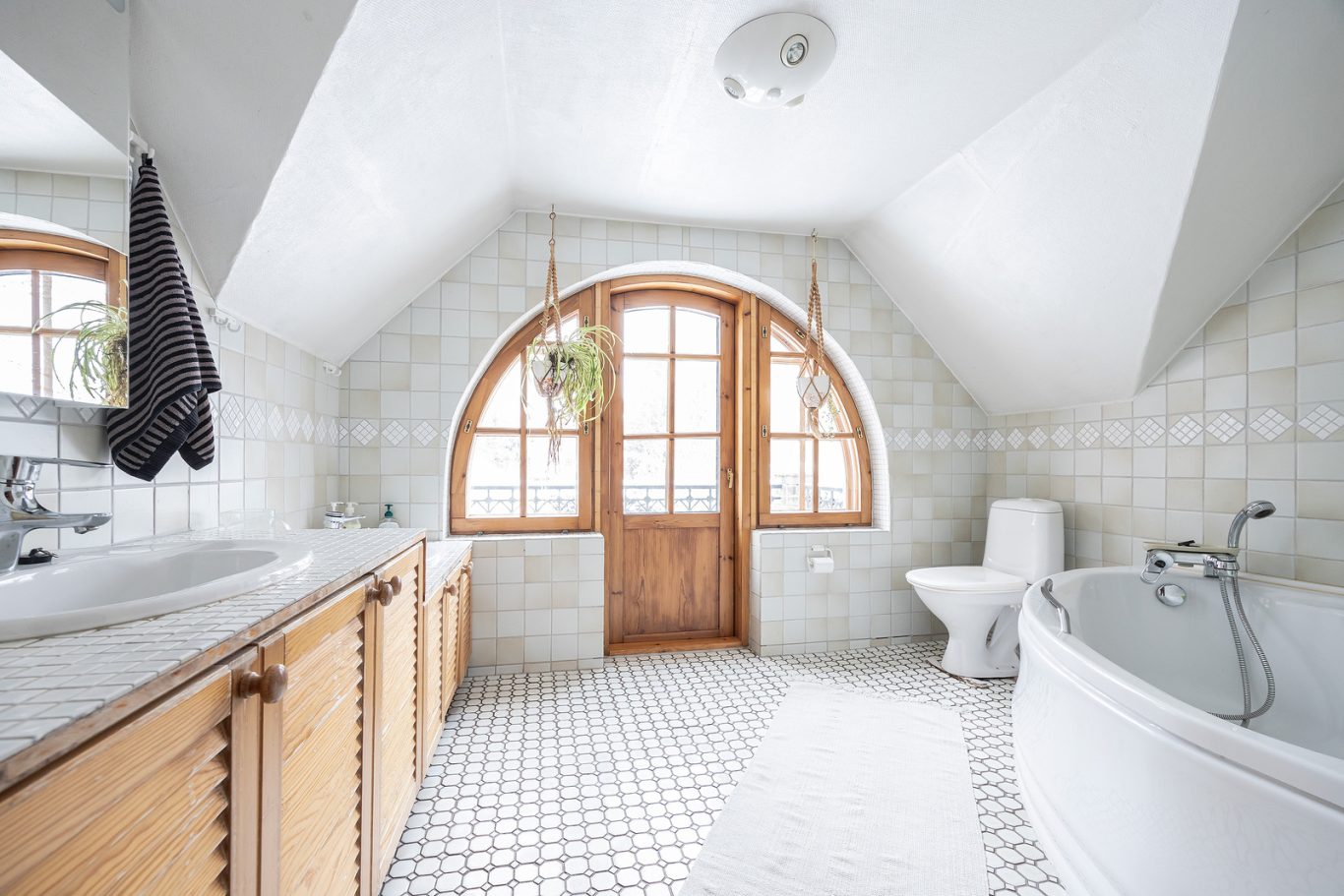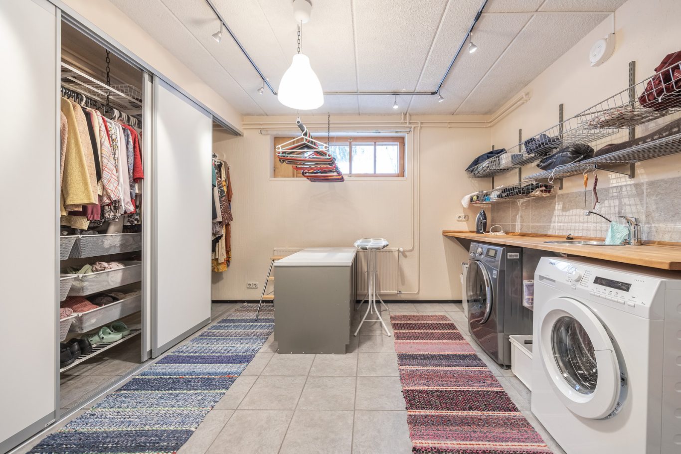 | Tilojen kuvaus | Alakerrassa: Tilava harraste/kuntoiluhuone, takkahuone, kodinhoitohuone, kylmäkellari ja varasto, tekninen tila. Keskikerroksessa: Iso ikkunallinen sisääntulokuisti, lasitettu terassi. Yläkerrassa: 2 kpl parveke. Käyttöullakolla: Kolme erillistä käyttöullakko tilaa, joissa linoleumlattia. |