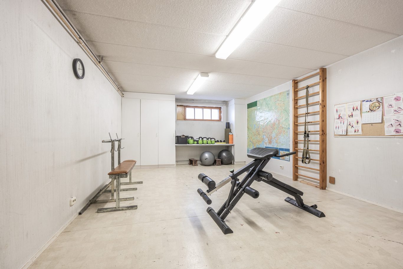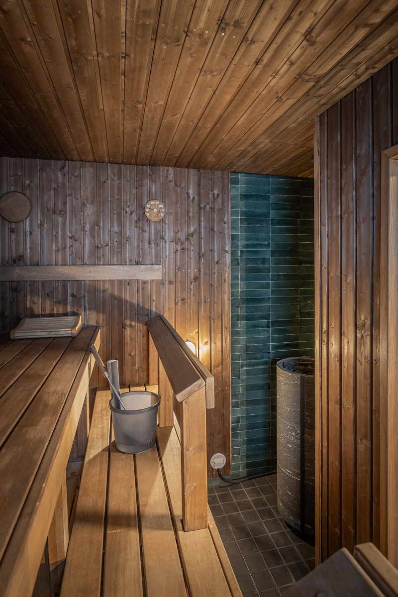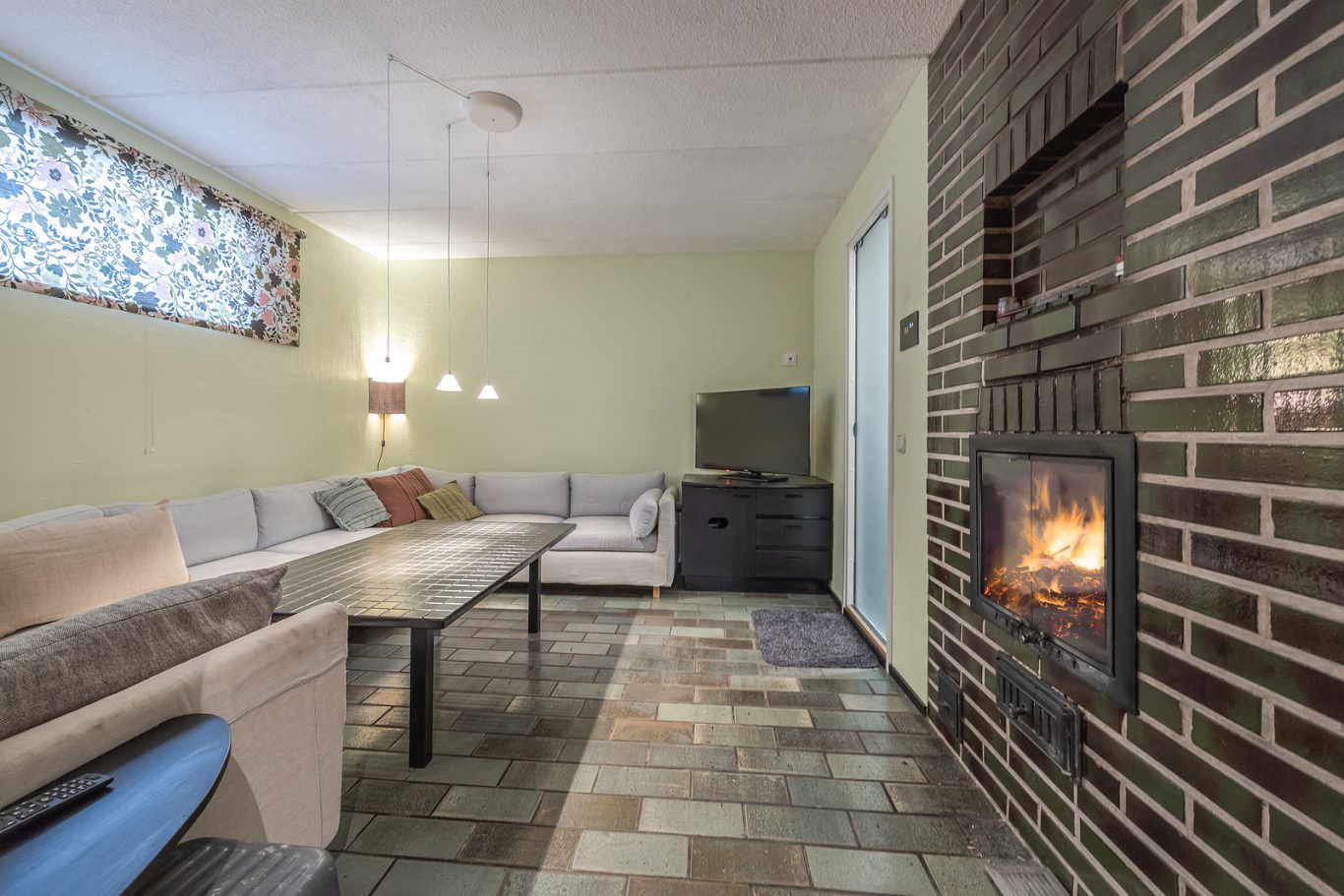 Alakerrassa on takkahuone varaavalla takalla, remontoitu kylpy- ja saunaosasto, harraste-/kuntoiluhuone, kodinhoitotilat, erillis wc, kylmäsäilytystilat ja varasto, tekniset tilat.