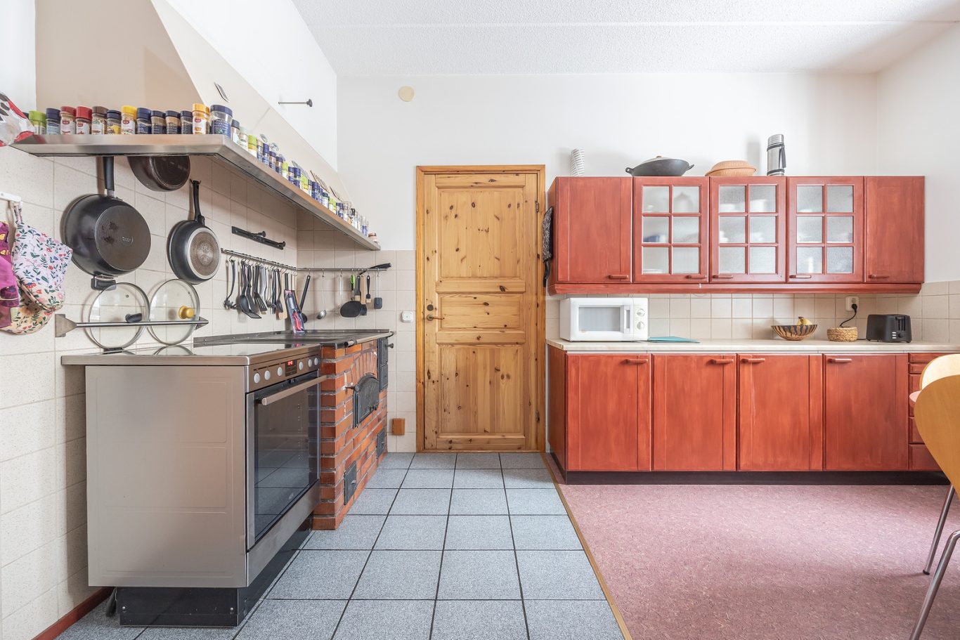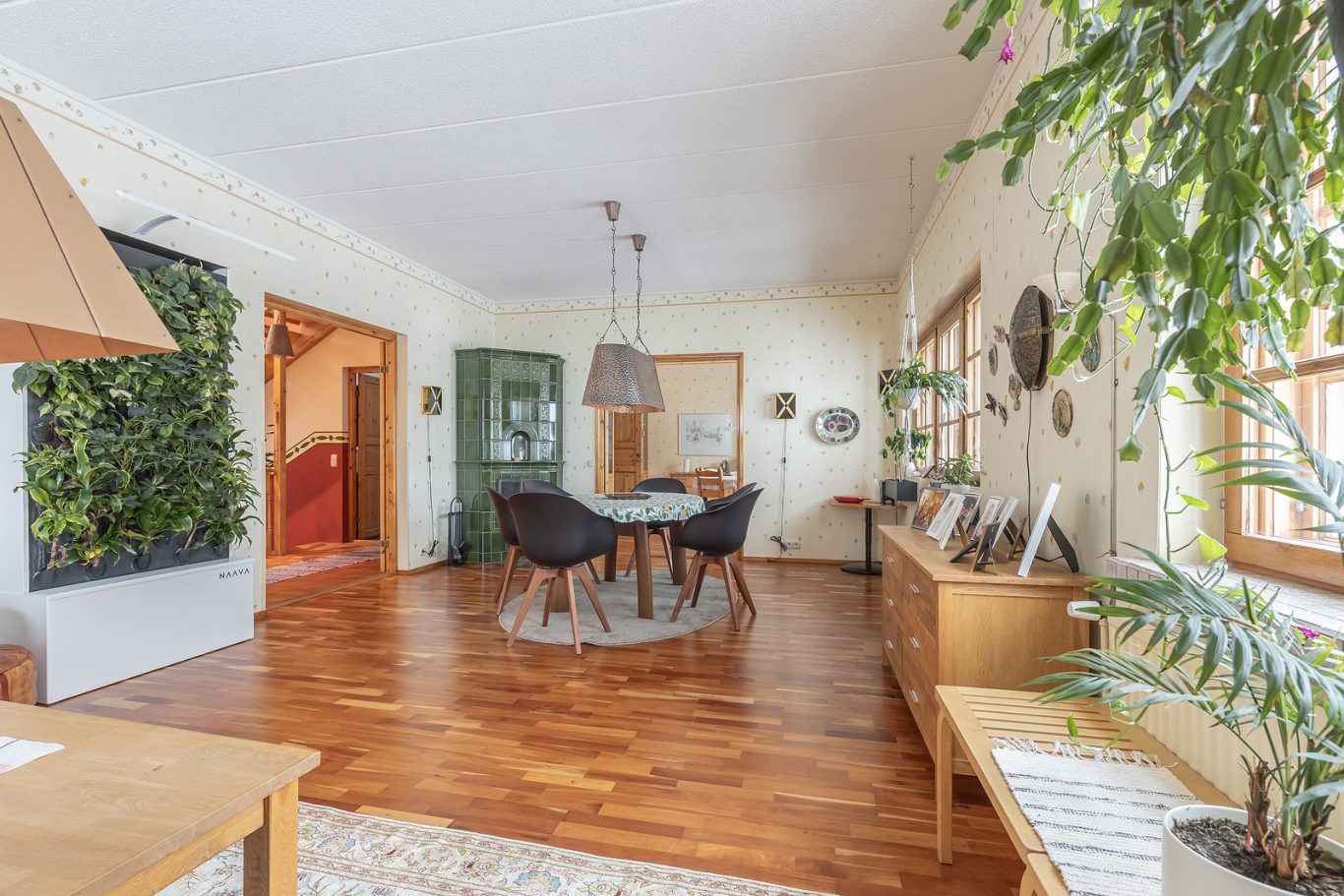 Sisääntulokerroksessa iso ikkunallinen sisääntulokuisti. Avara olohuone kauniilla Kermansaven varaavalla kakluunilla. Erillinen tilava ruokailuhuone. Olohuoneesta on käynti lasitetulle terassille, josta pääsee suurelle piha-alueelle. Keittiössä on normaalien kodinkoneiden lisäksi puulämmitteinen hella/leivinuuni, ruokapöytä mahtuu. Makuu-/työhuone, erillis wc.