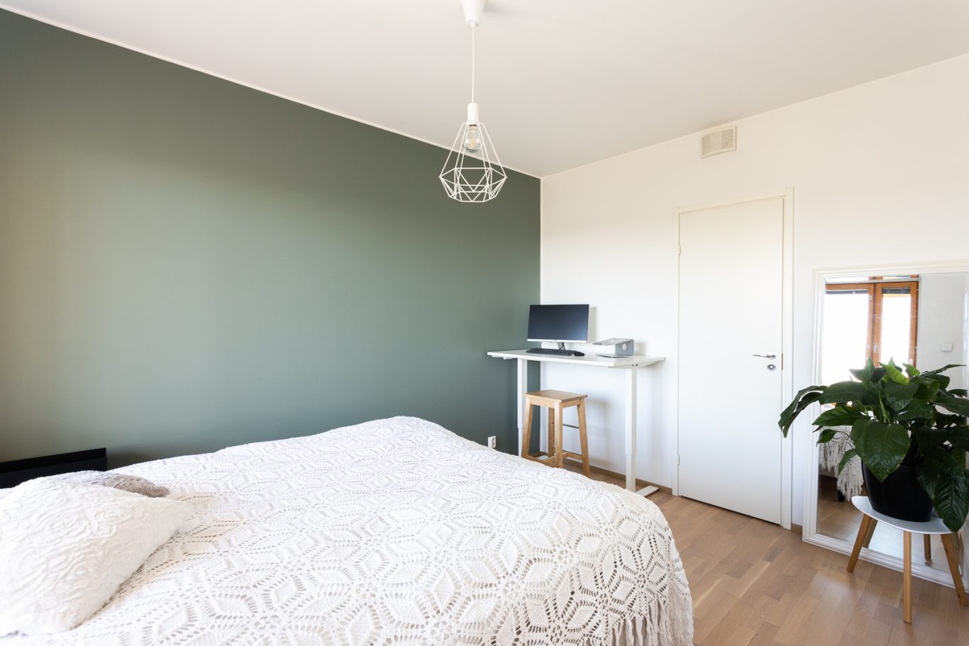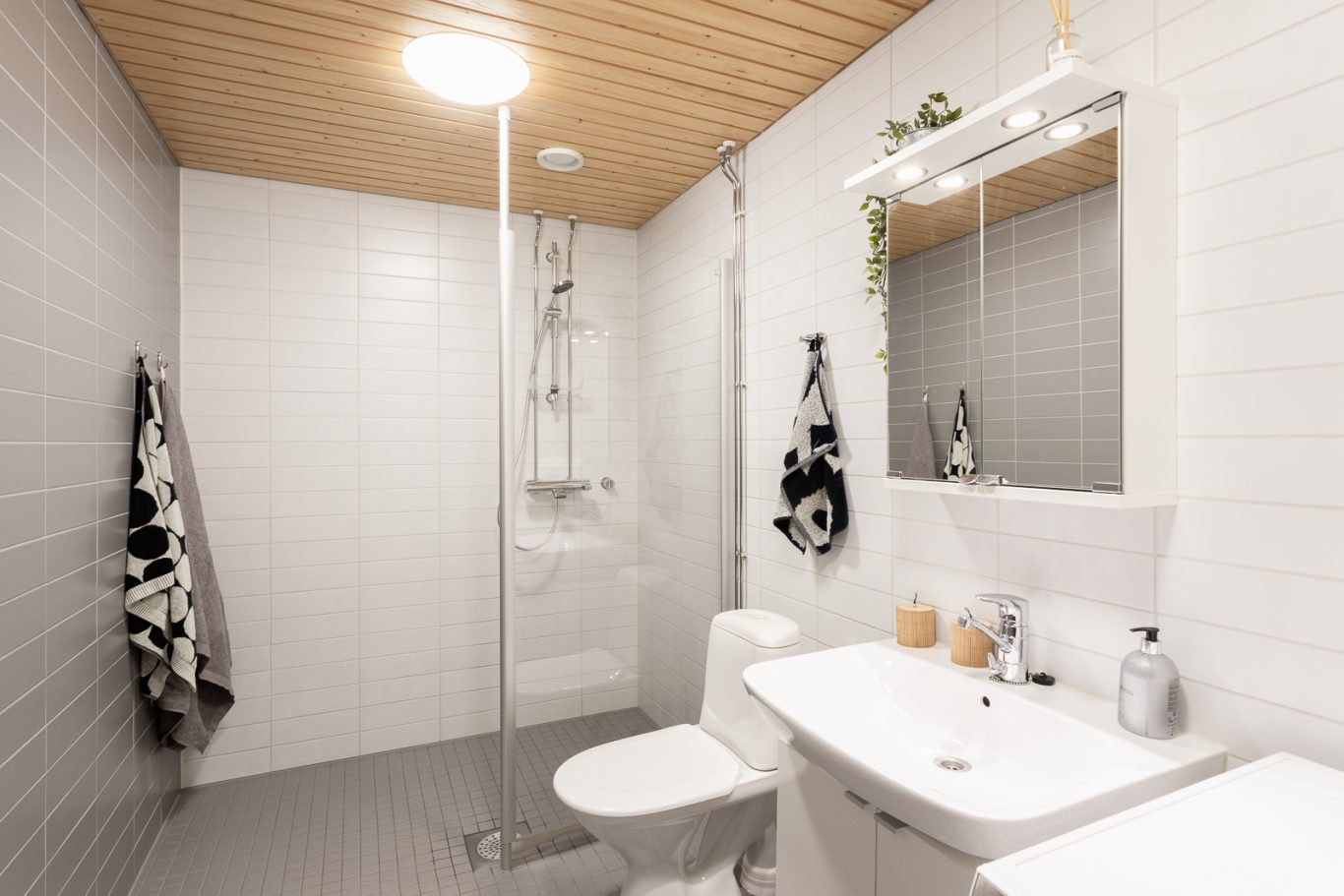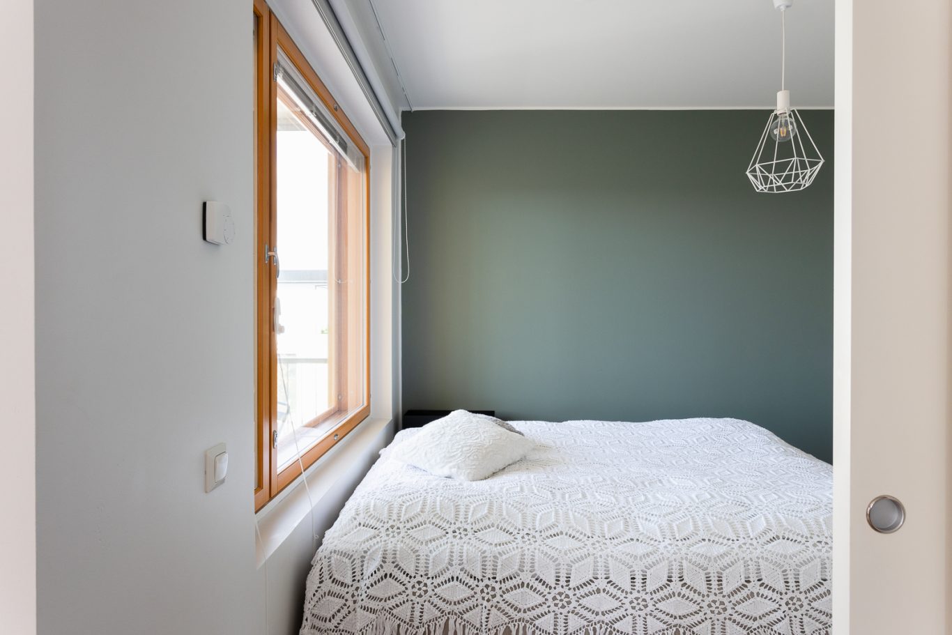 Rauhallinen makuuhuone kätkee sisäänsä käytännöllisen vaatehuoneen hyllyineen ja vaatetankoineen. Tyylikkäässä kylpyhuoneessa on paikka pesutornille sekä erillinen pyykkikaapisto. Toimivuutta ja viimeisteltyä ilmettä täydentävät eteisen laattalattia, reilut säilytystilat sekä luonnonvaloa tuova ikkuna.