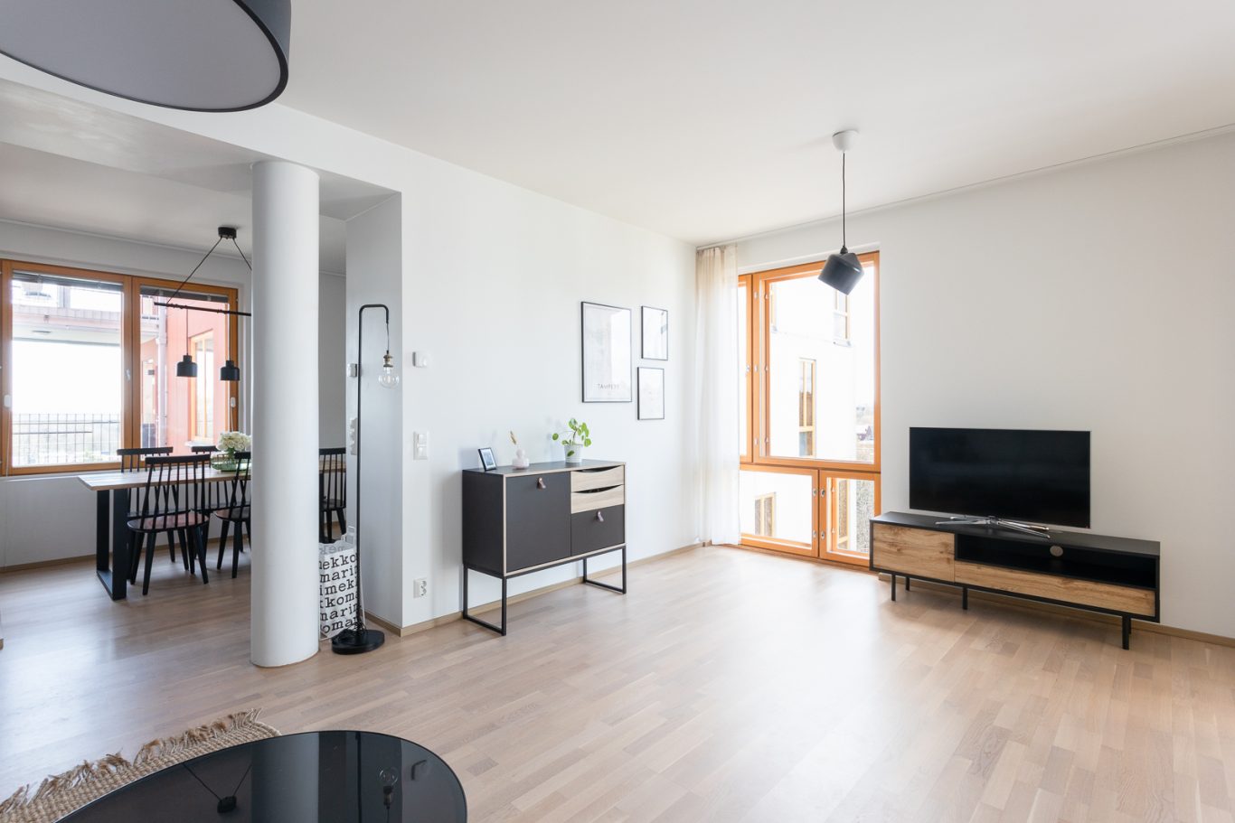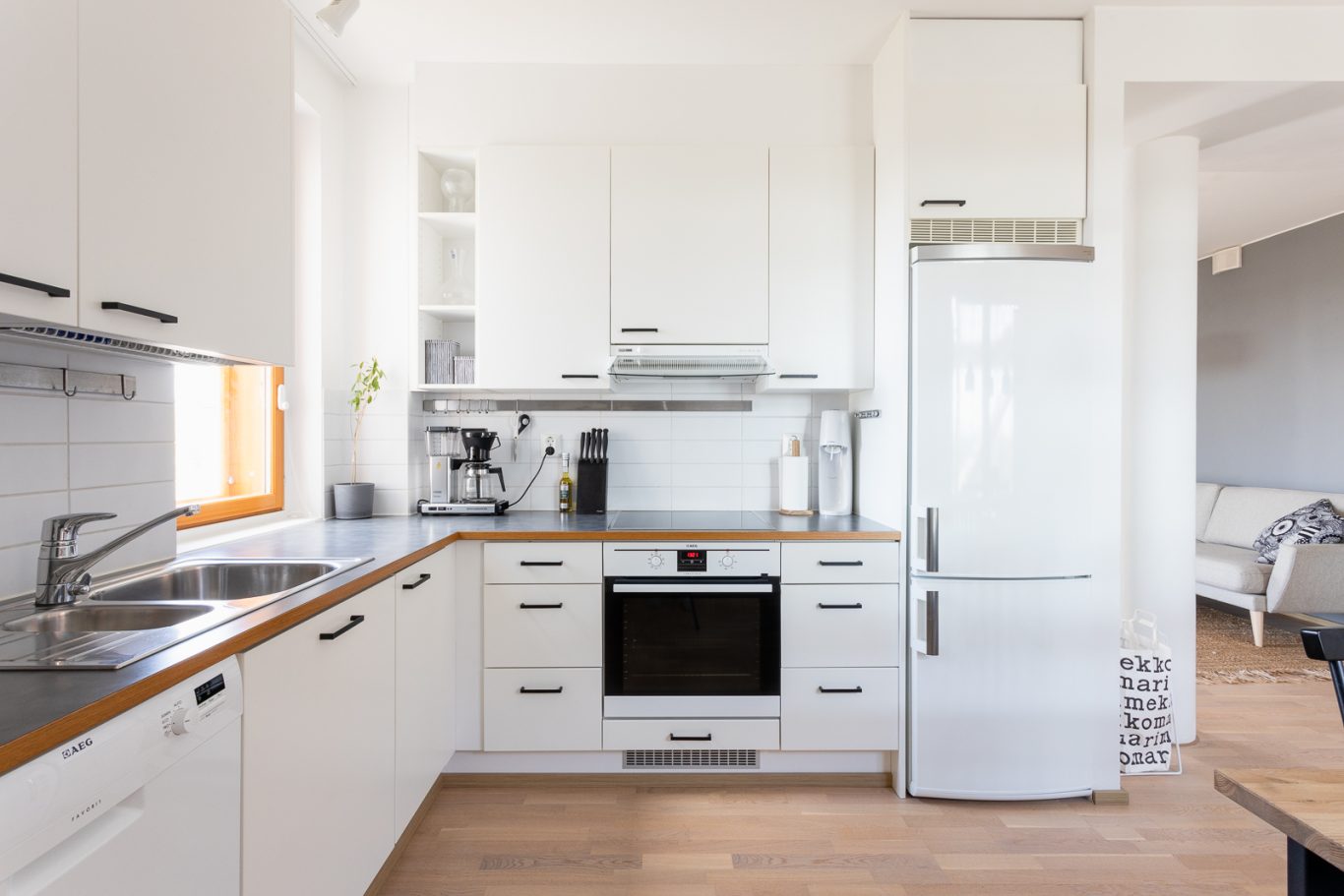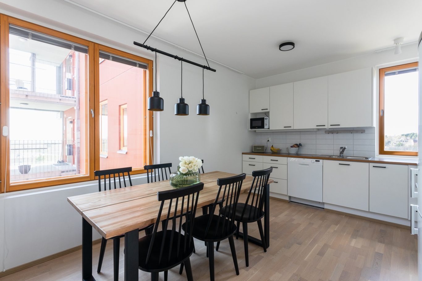 Tilava olohuone kutsuu viihtymään ja tarjoaa loistavat puitteet myös etätyöpisteelle työpäivän lomassa voit ihailla vaihtuvia jokimaisemia. Keittiö on poikkeuksellisen tilava ja toimiva, ja se tarjoaa runsaasti kaappi- ja laskutilaa sekä luontevan paikan suuremmallekin ruokapöydälle. Ikkunat kahteen ilmansuuntaan tuovat asuntoon runsaasti luonnonvaloa ja avaruutta.