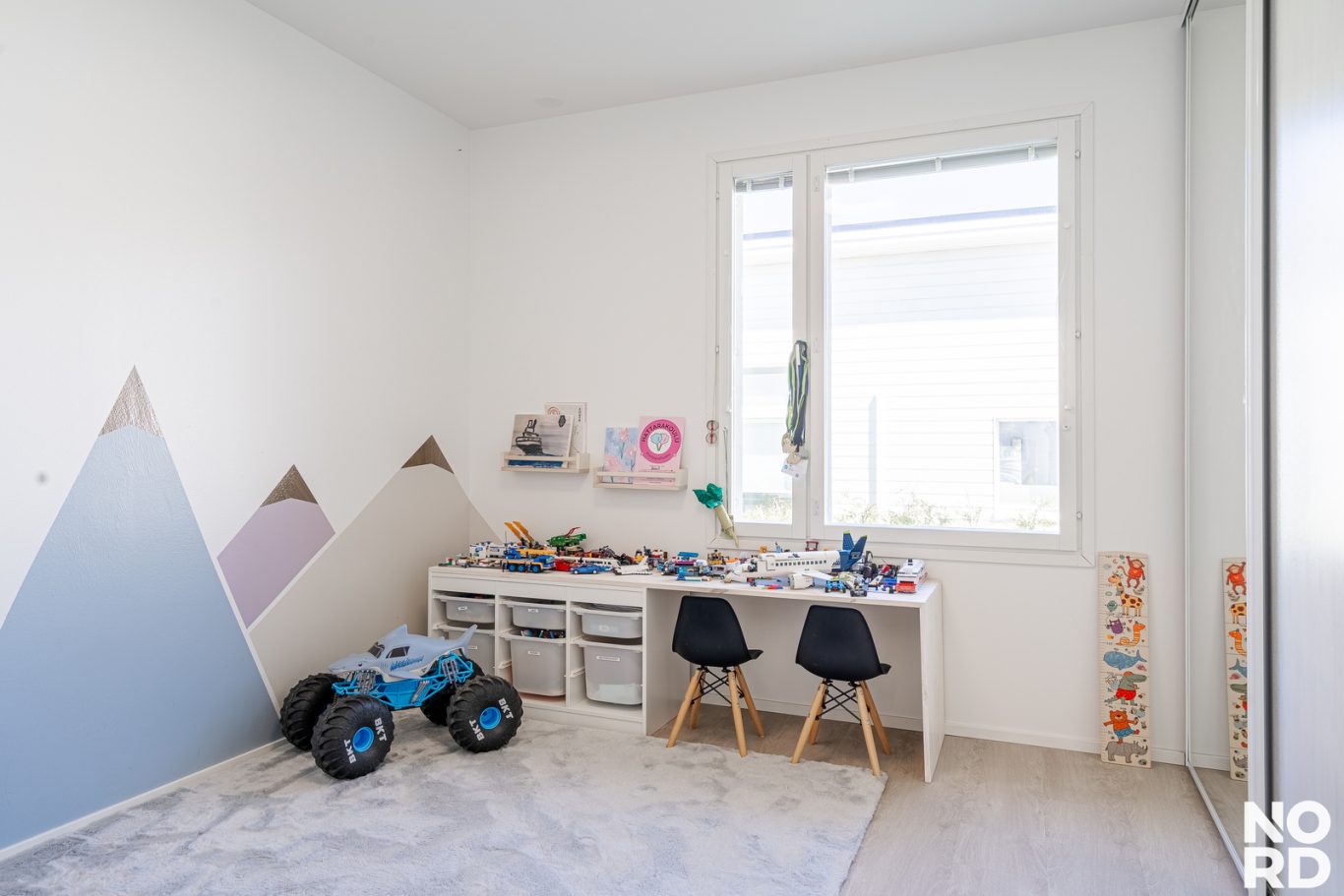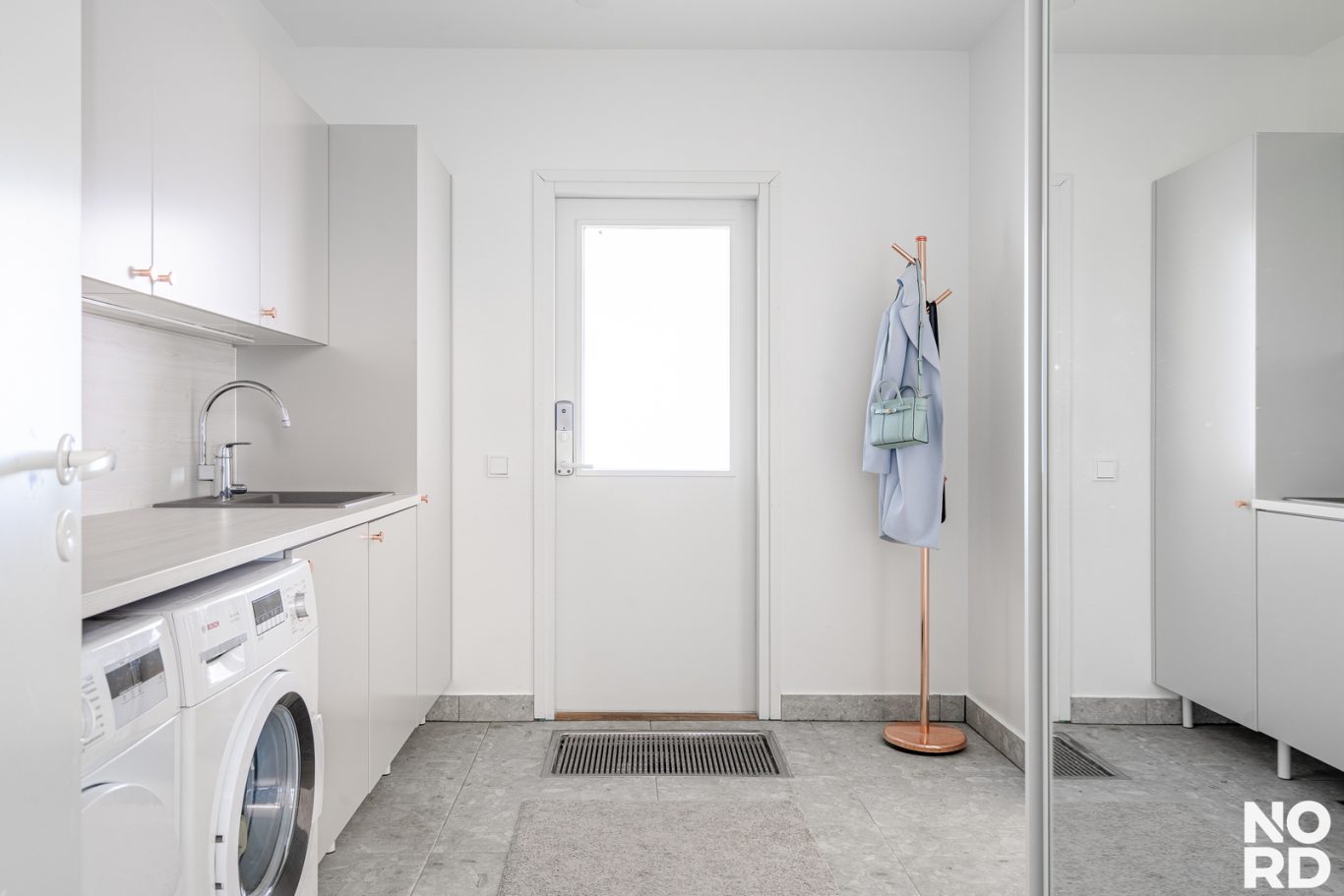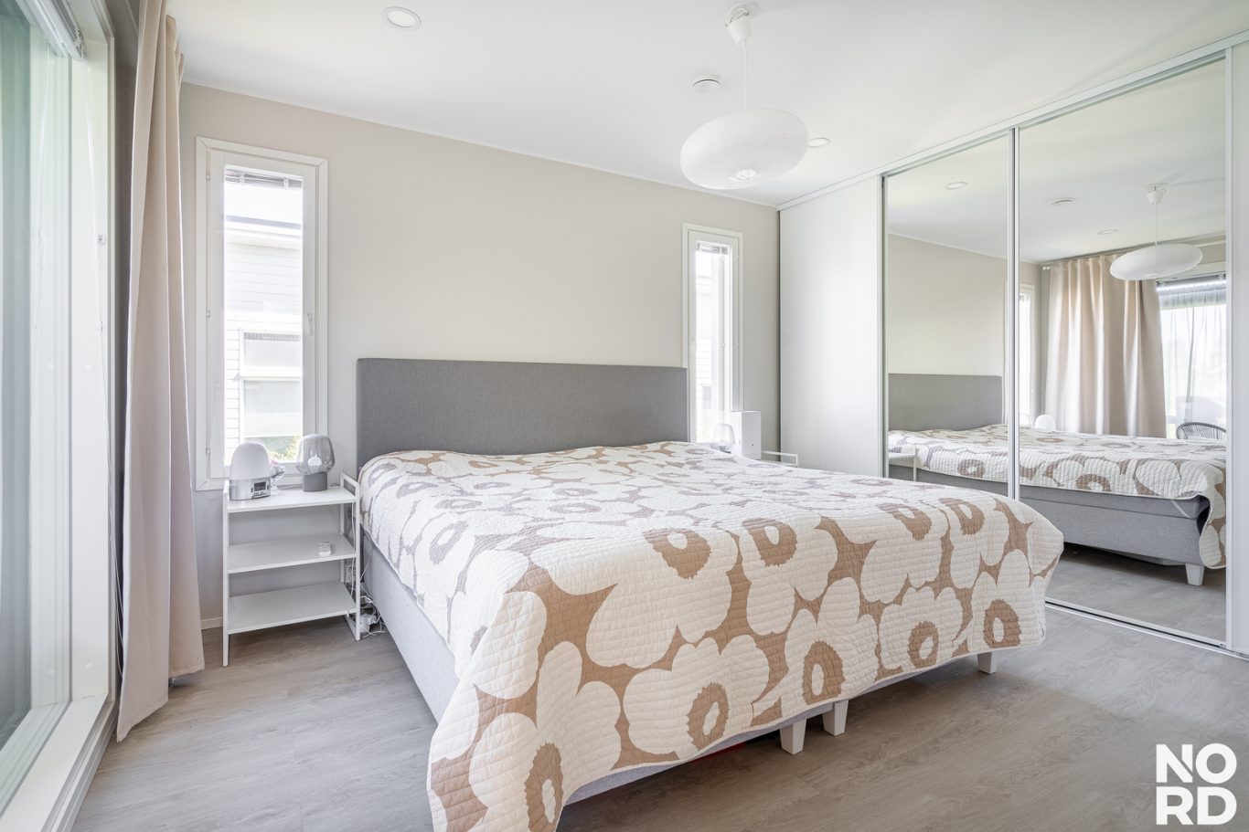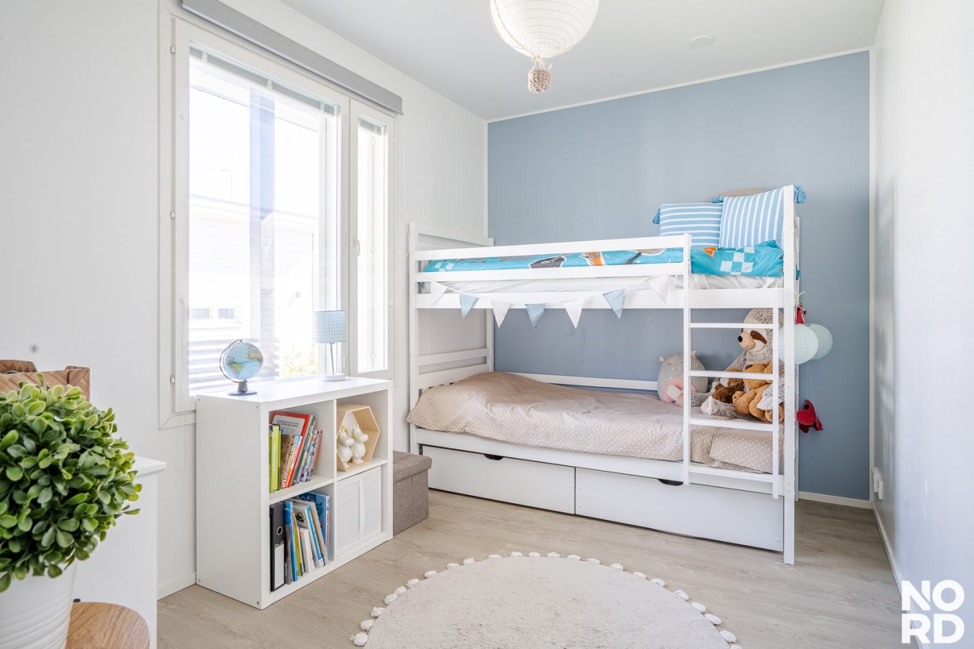 Neljä makuuhuonetta luovat edellytykset perheen koon mukaan monenlaiseen käyttöön. Huonetilojen ja eteisen lattia on kestävää ja hiljaista vinyylilankkua, jossa myös lemmikkien tassut viihtyvät. Hyvin varustellussa keittiössä on runsaasti säilytys- ja laskutilaa. Kodinhoitohuoneeseen on kulku kuraeteisen kautta, jossa puhdistuu niin kengät kuin lemmikkien tassut. Ylellisestä kylpyhuoneesta löytyy sadevesisuihku ja kylpyamme, jossa on oma suihku. Kaiken kruunaa upea sauna lauteisiin upotetulla massiivikivikiukaalla.