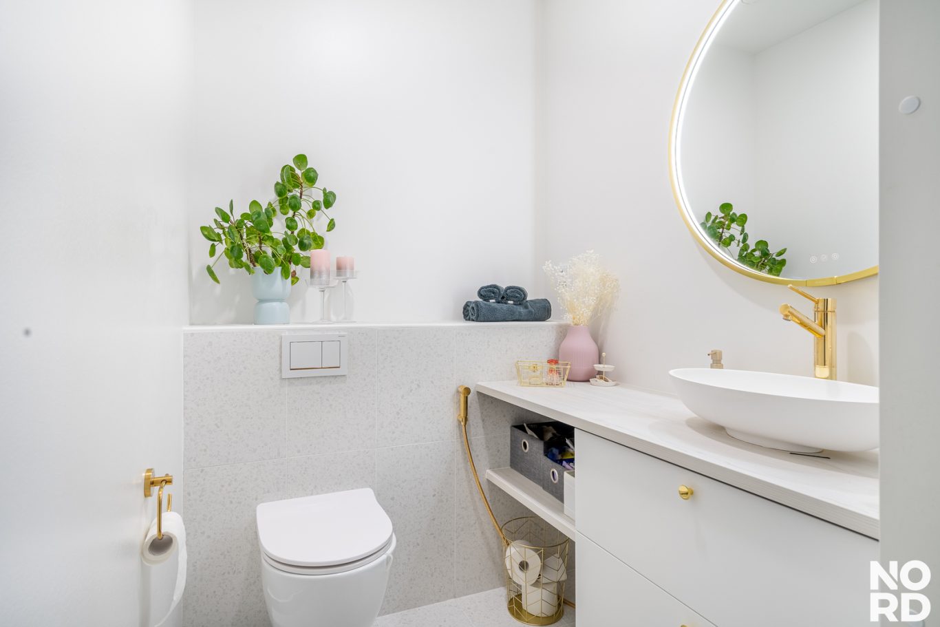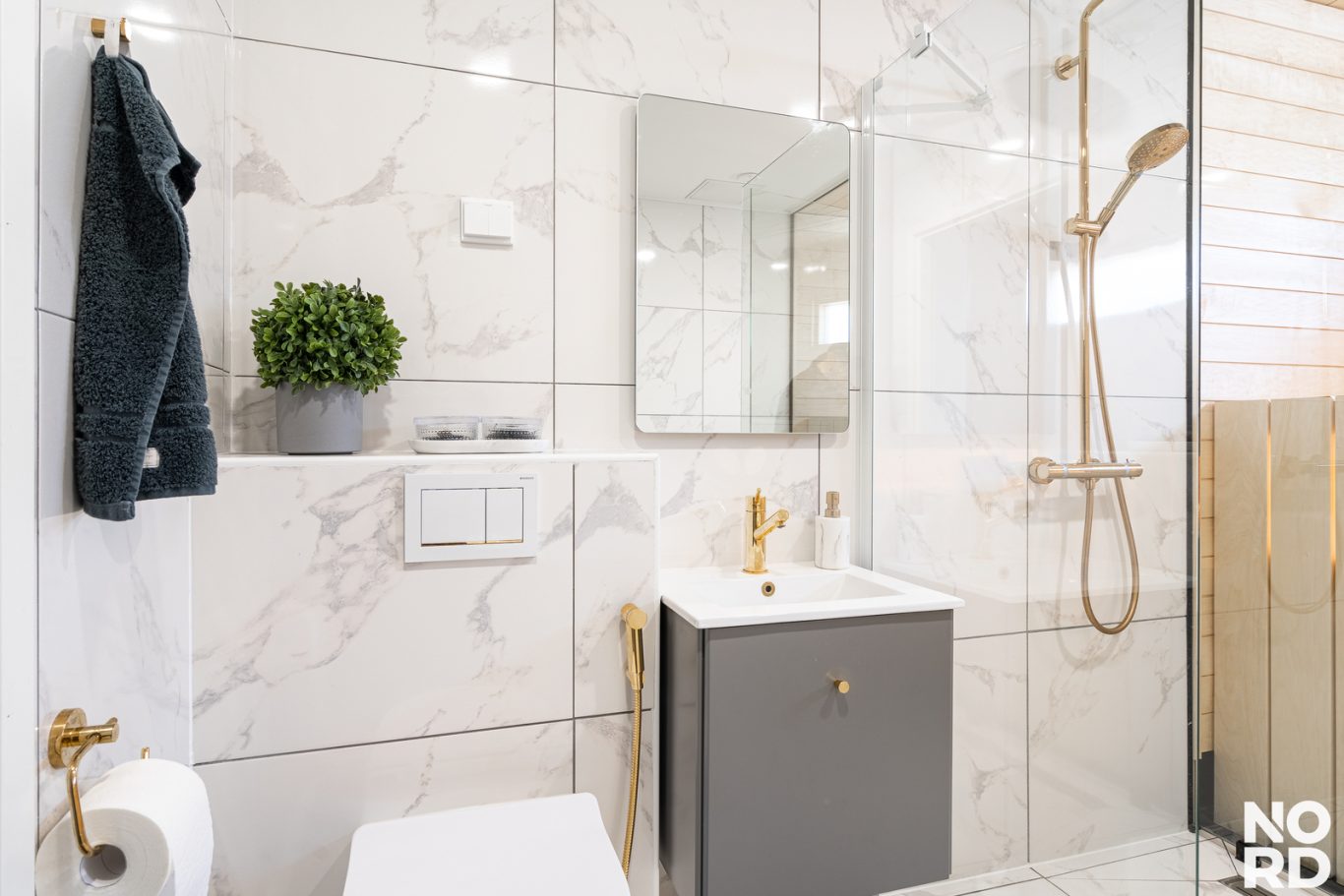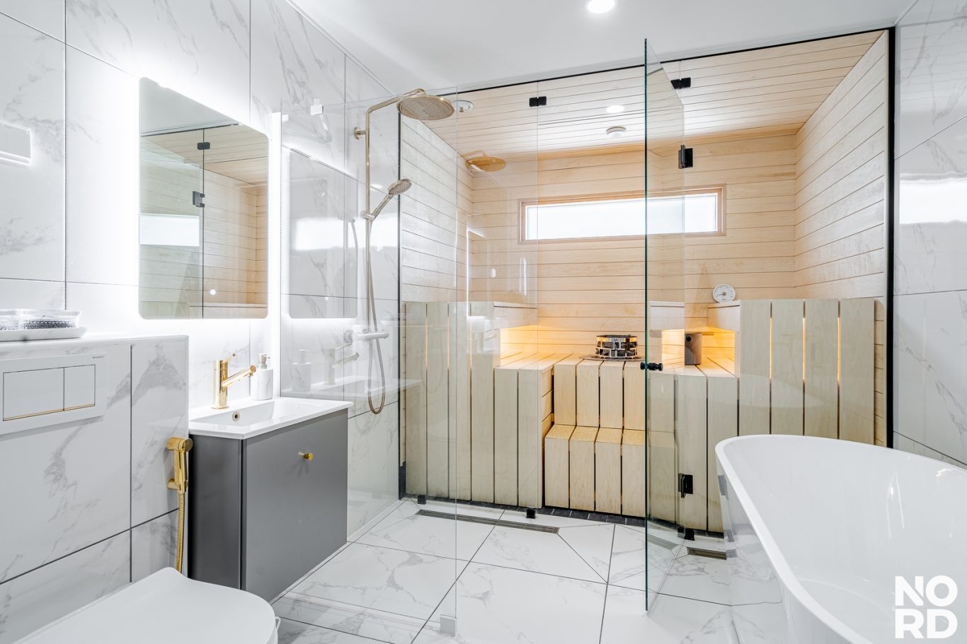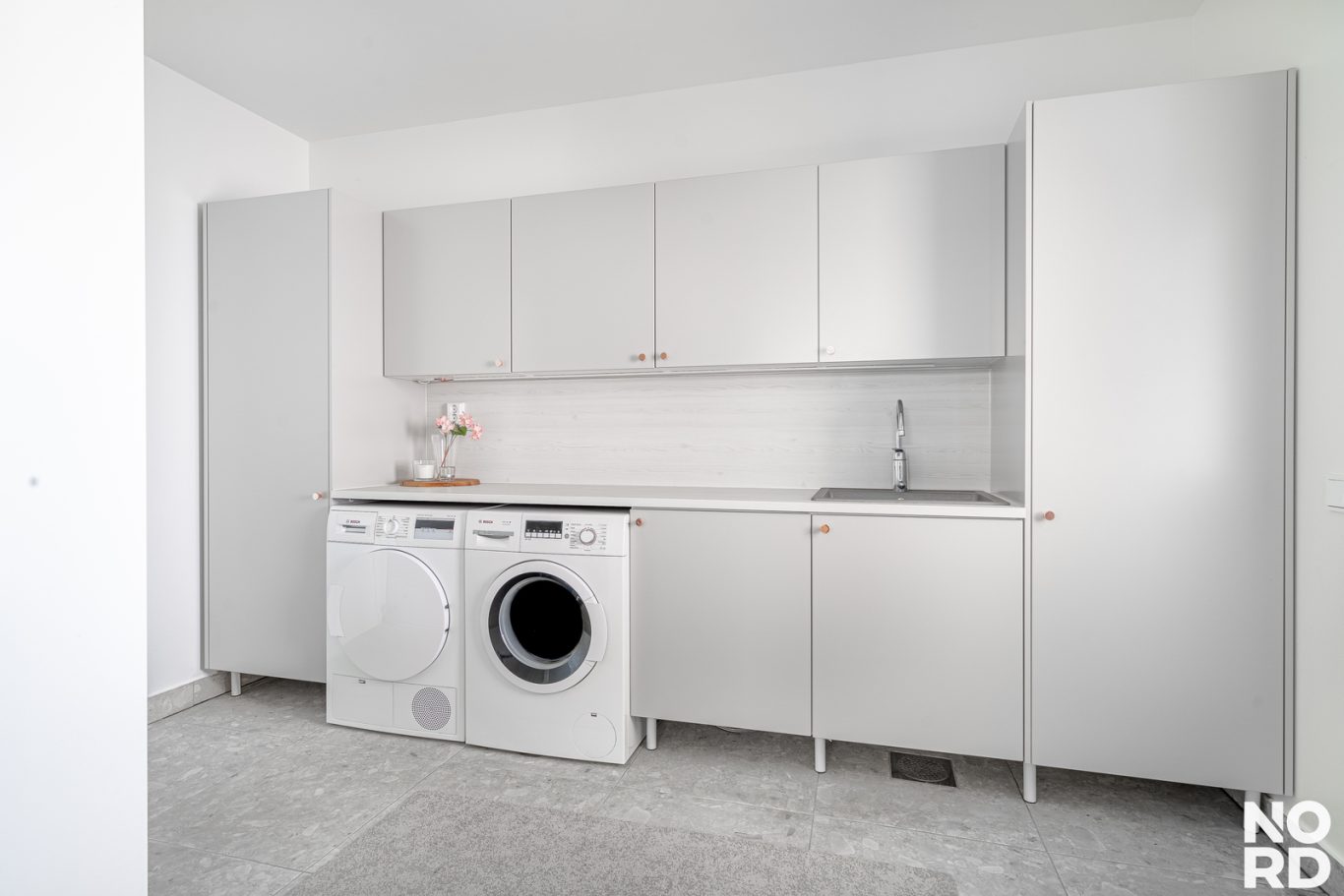 Neljä makuuhuonetta luovat edellytykset perheen koon mukaan monenlaiseen käyttöön. Huonetilojen ja eteisen lattia on kestävää ja hiljaista vinyylilankkua, jossa myös lemmikkien tassut viihtyvät. Hyvin varustellussa keittiössä on runsaasti säilytys- ja laskutilaa. Kodinhoitohuoneeseen on kulku kuraeteisen kautta, jossa puhdistuu niin kengät kuin lemmikkien tassut. Ylellisestä kylpyhuoneesta löytyy sadevesisuihku ja kylpyamme, jossa on oma suihku. Kaiken kruunaa upea sauna lauteisiin upotetulla massiivikivikiukaalla.