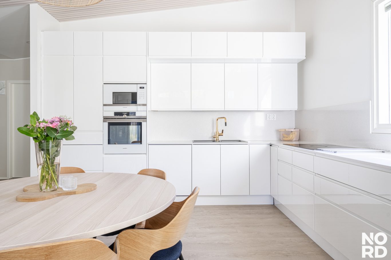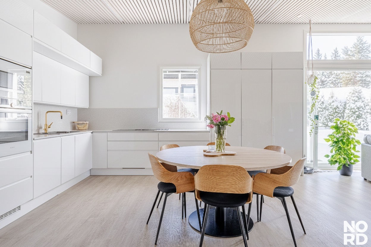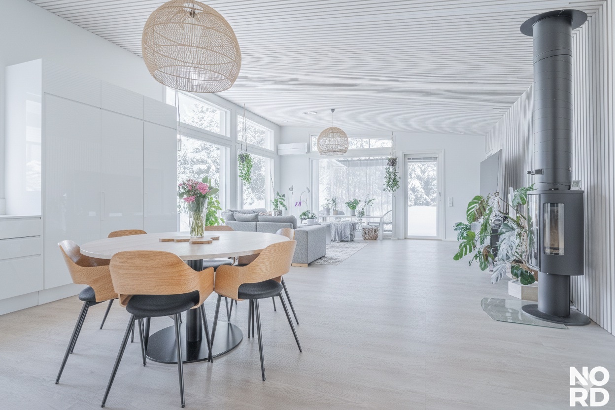 Tässä kodissa on tilaa, valoa ja avaruutta. Täällä yhdistyvät laadukkaat materiaalit, toimiva pohjaratkaisu ja edullinen maalämpö vesikiertoisella lattialämmityksellä, sekä helteellä viilentävä ilmalämpöpumppu.
