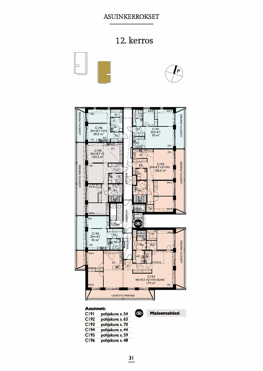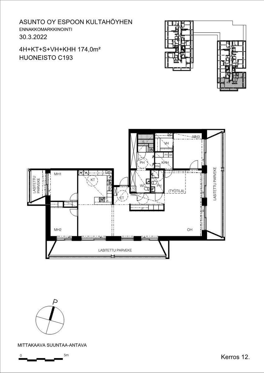 | Huoneistoselitelmä | 4h + kt + s + vh+khh,3 x parveke n. 22,5 m², 25 m², 6,5 m² |